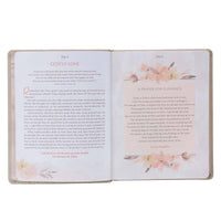 Cappuccino-colored cover with leaf design, Faux leather cover, Gold foiled title, 365-day devotional, 372 pages, Gild-edged pages, Full-color interior, Ribbon marker