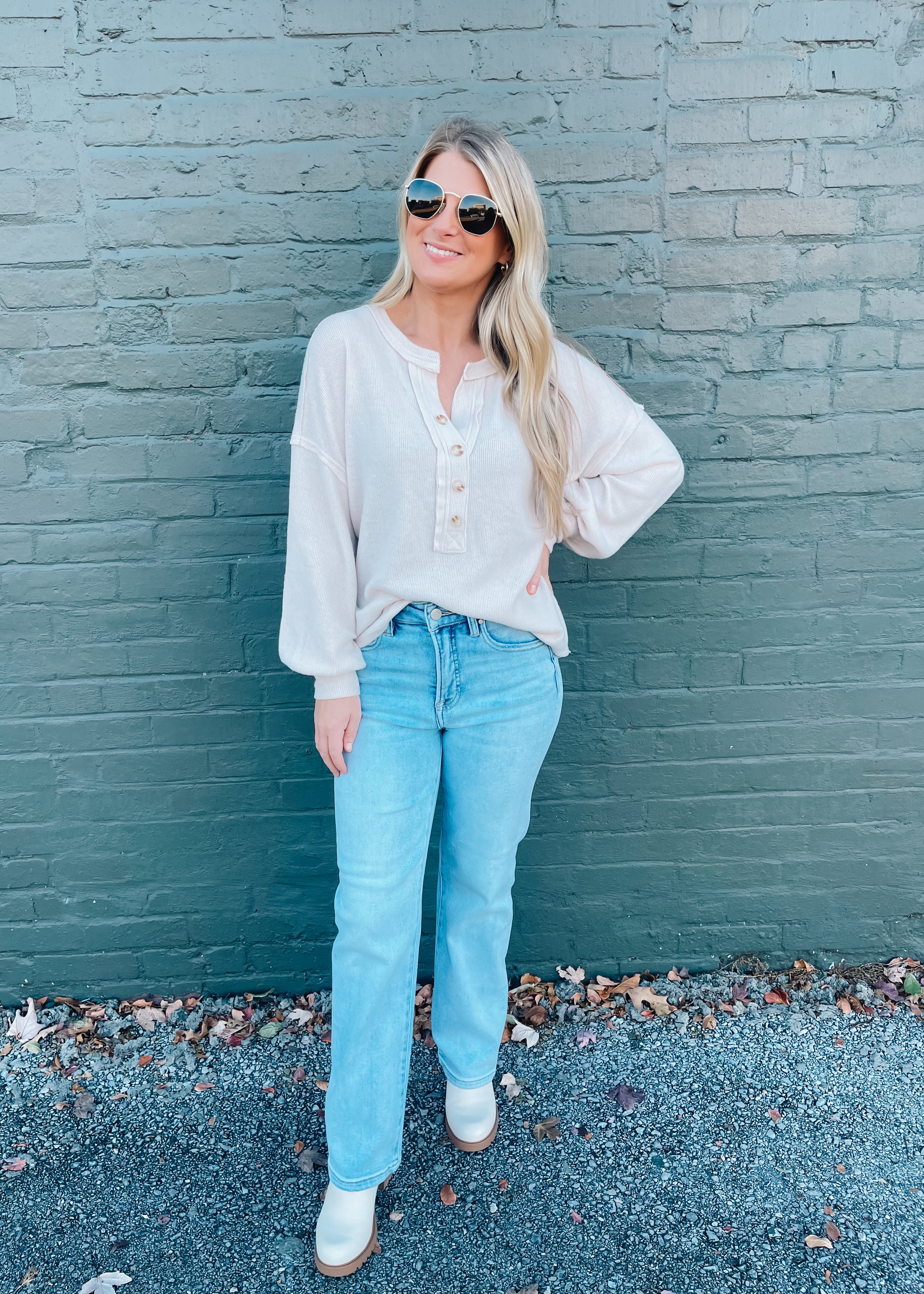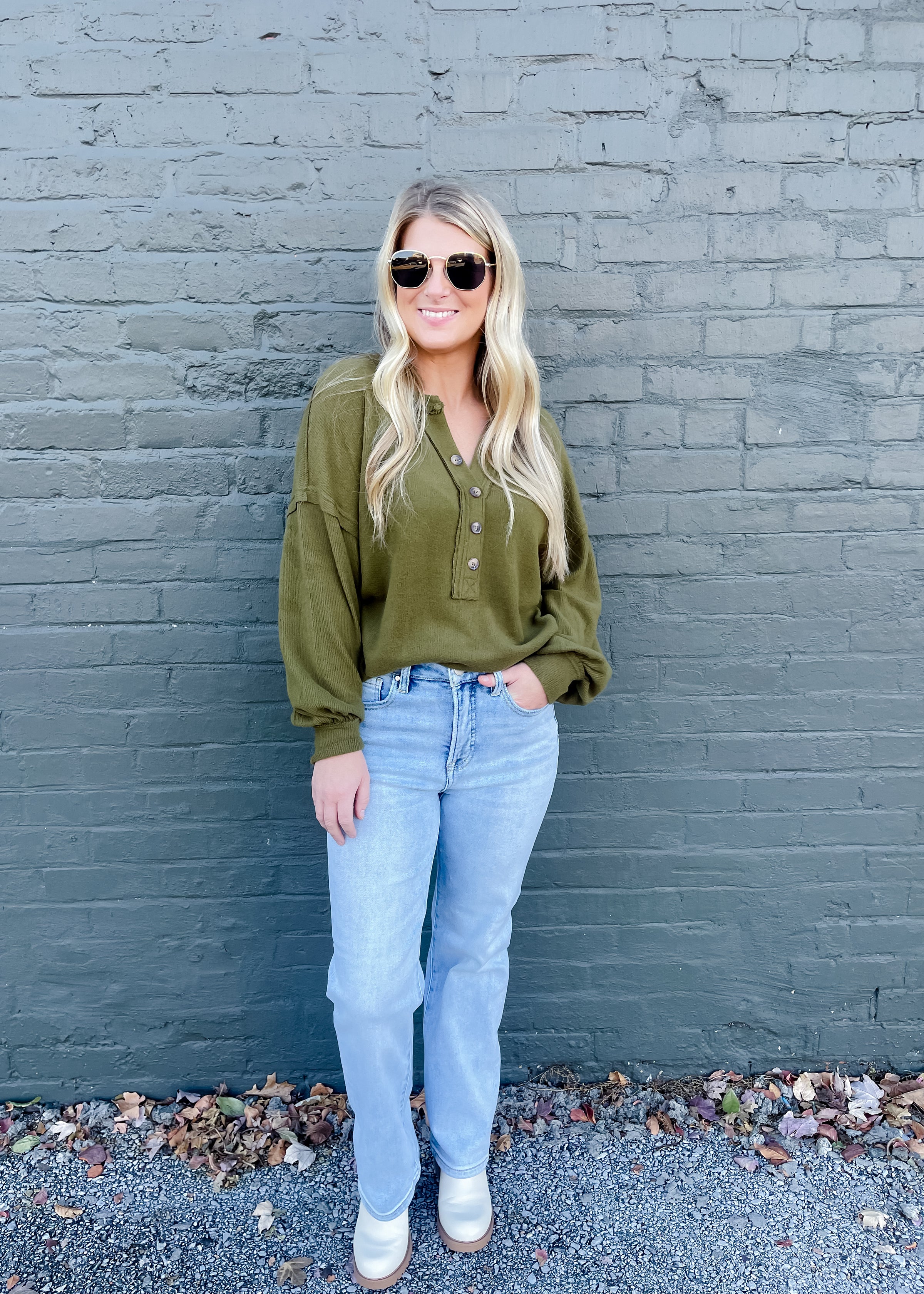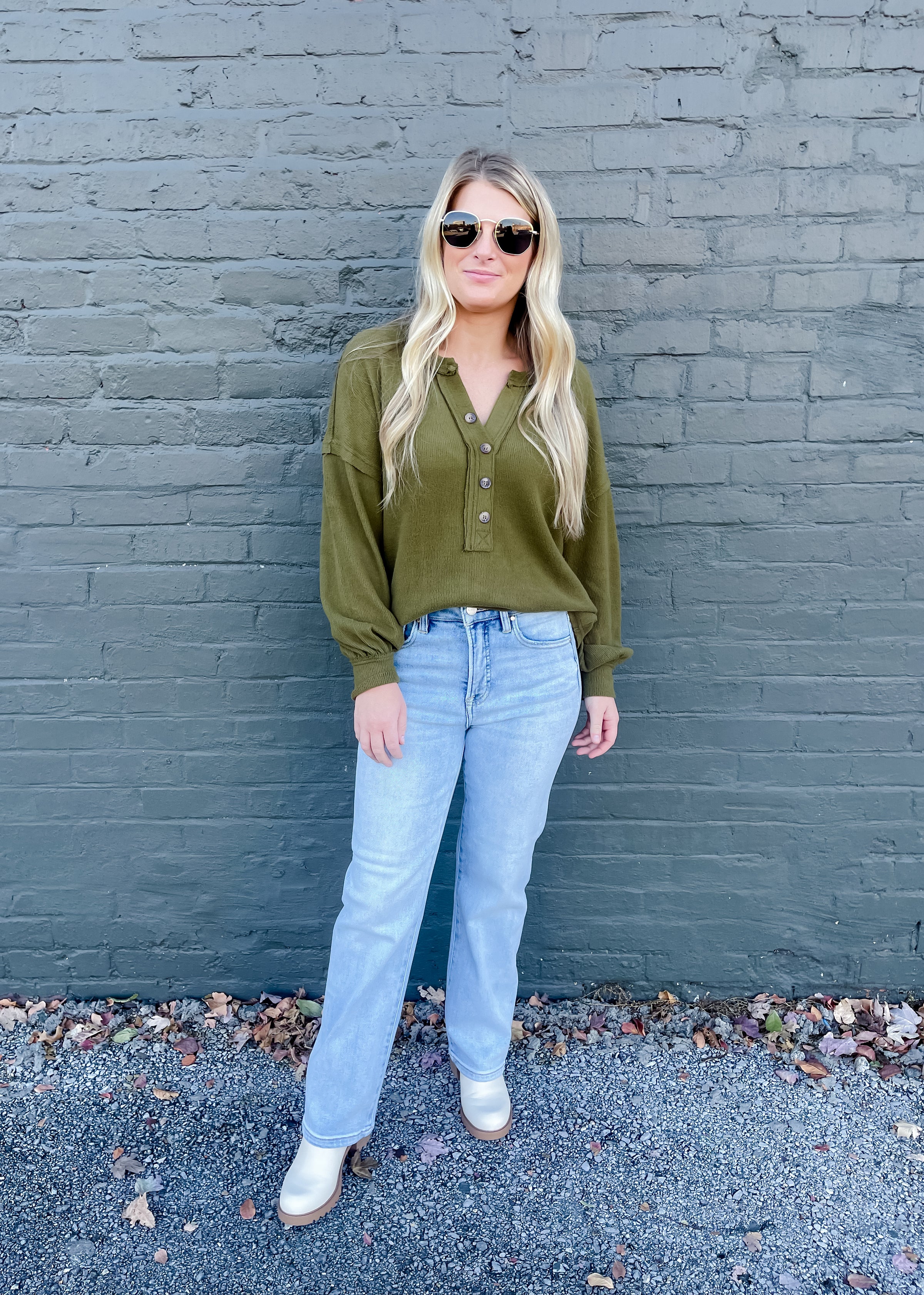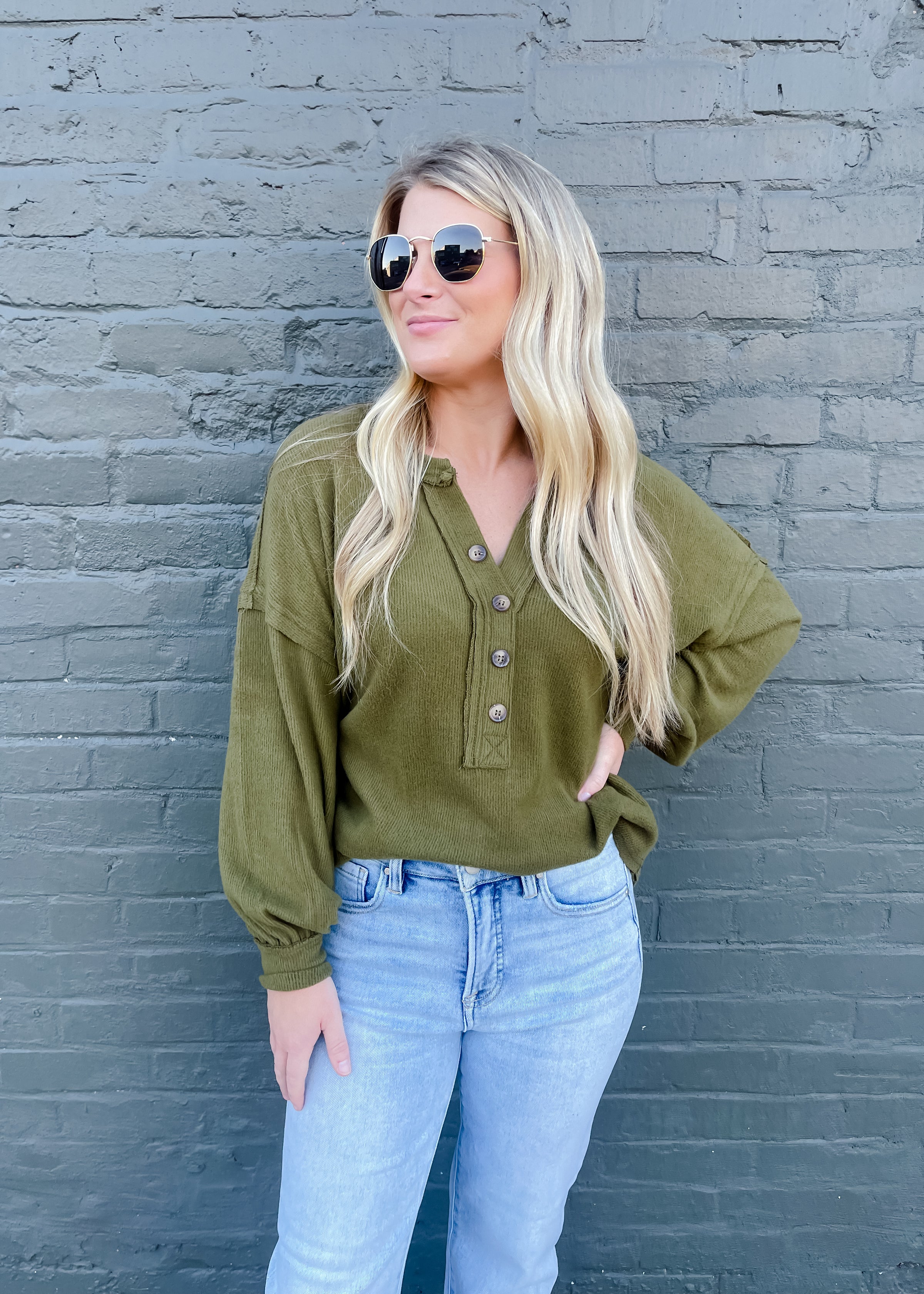 Effortless style meets everyday comfort in this versatile knit top. Featuring a flattering V neckline and half button-down front, it's designed for those who appreciate relaxed sophistication. Long sleeves with a modern drop shoulder silhouette create an understated elegance, while the exposed seam detail adds subtle visual interest. The unlined construction keeps things breathable and lightweight, perfect for layering or wearing solo. Available in soothing olive and warm oatmeal, this solid knit piece transitions seamlessly from casual weekends to laid-back workdays.