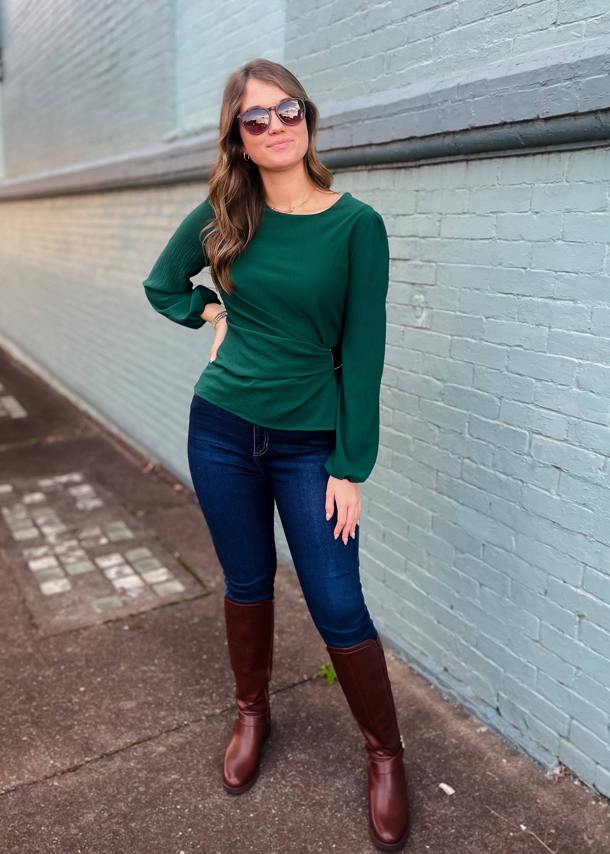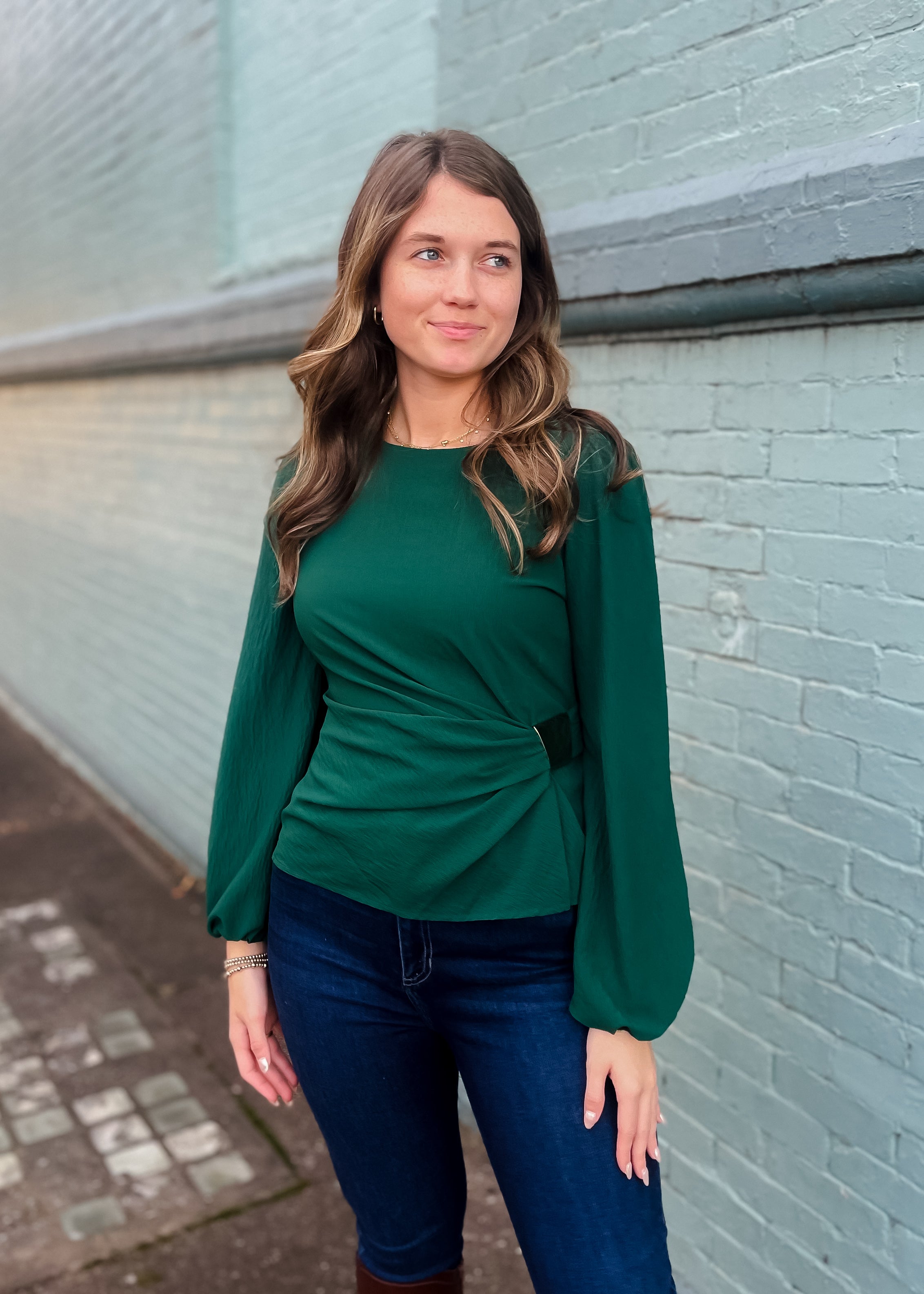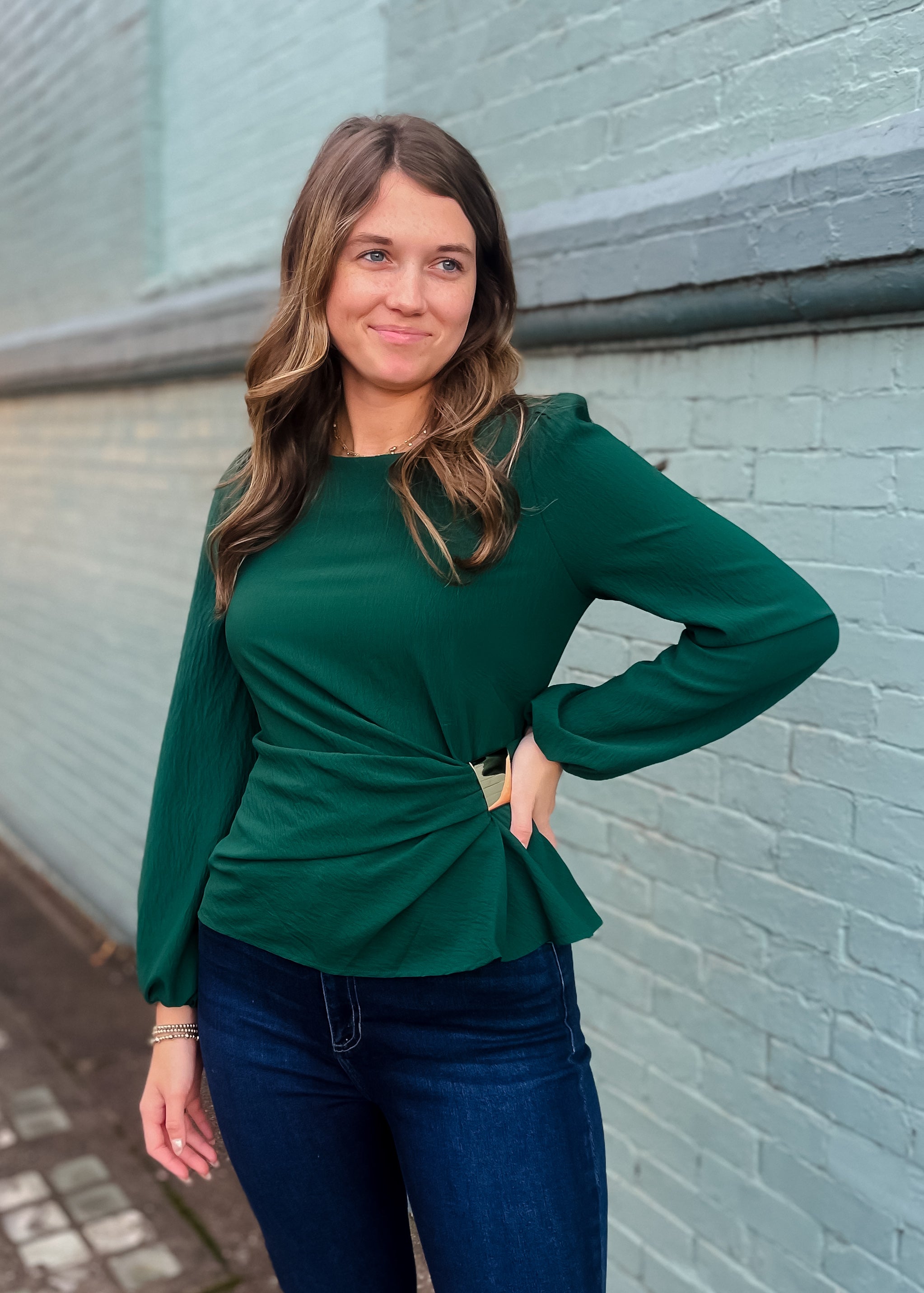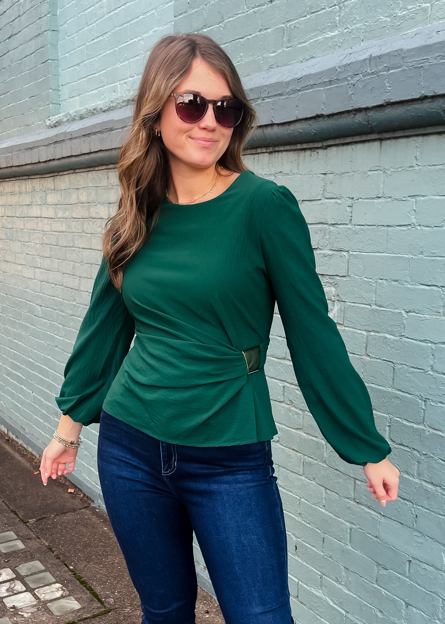 Embrace elegance with the Stay True To Yourself Top in rich hunter green. This long-sleeve design features a flattering waistline, subtle gold trim, and a delicate keyhole button back for a sophisticated look. A convenient side zipper enhances the fit, making it effortless to wear. Perfectly suited for both work and evening occasions, this top elevates your wardrobe while inspiring confidence and style.