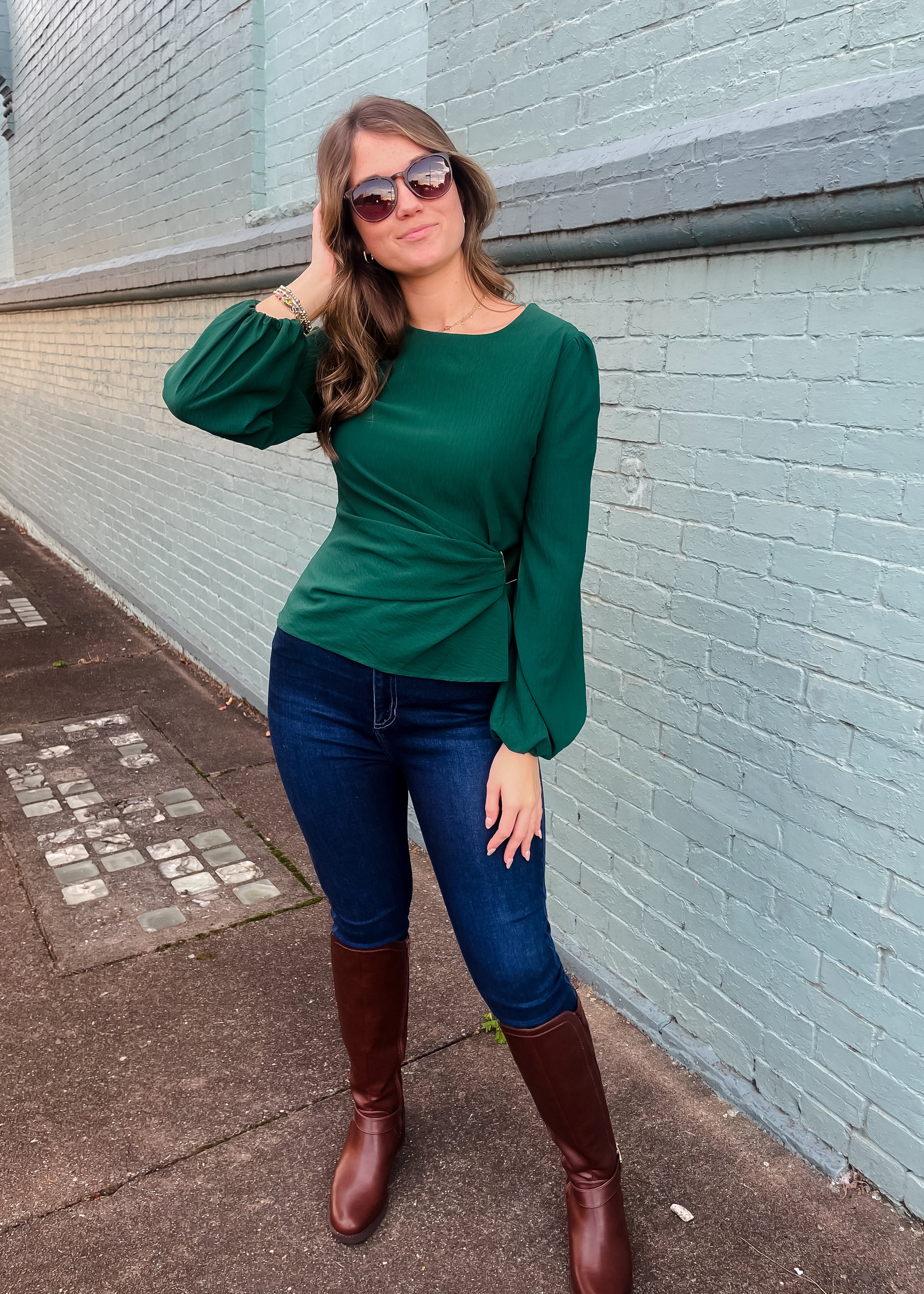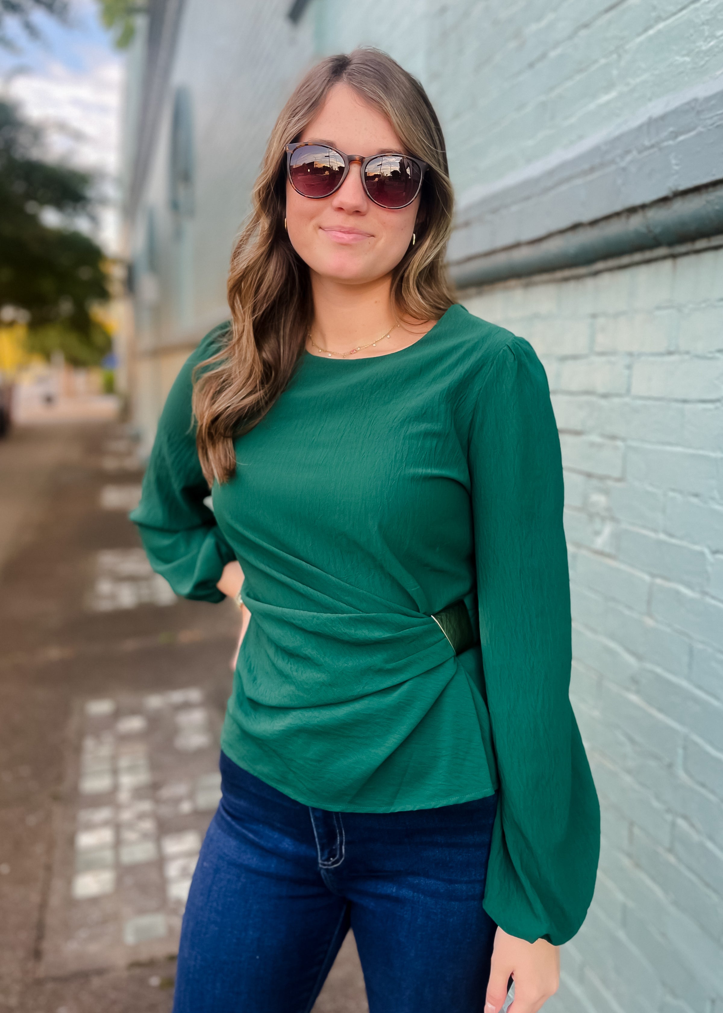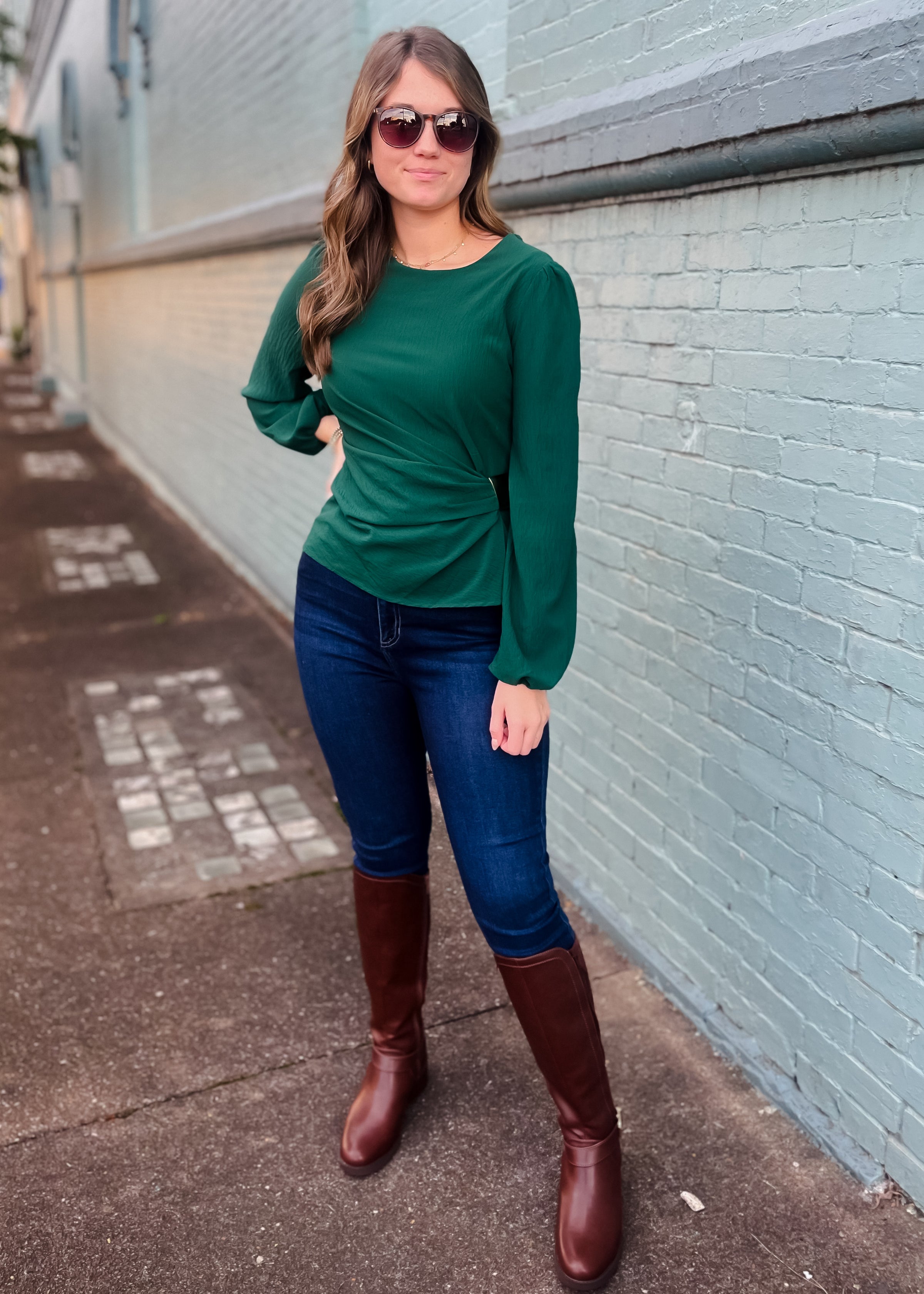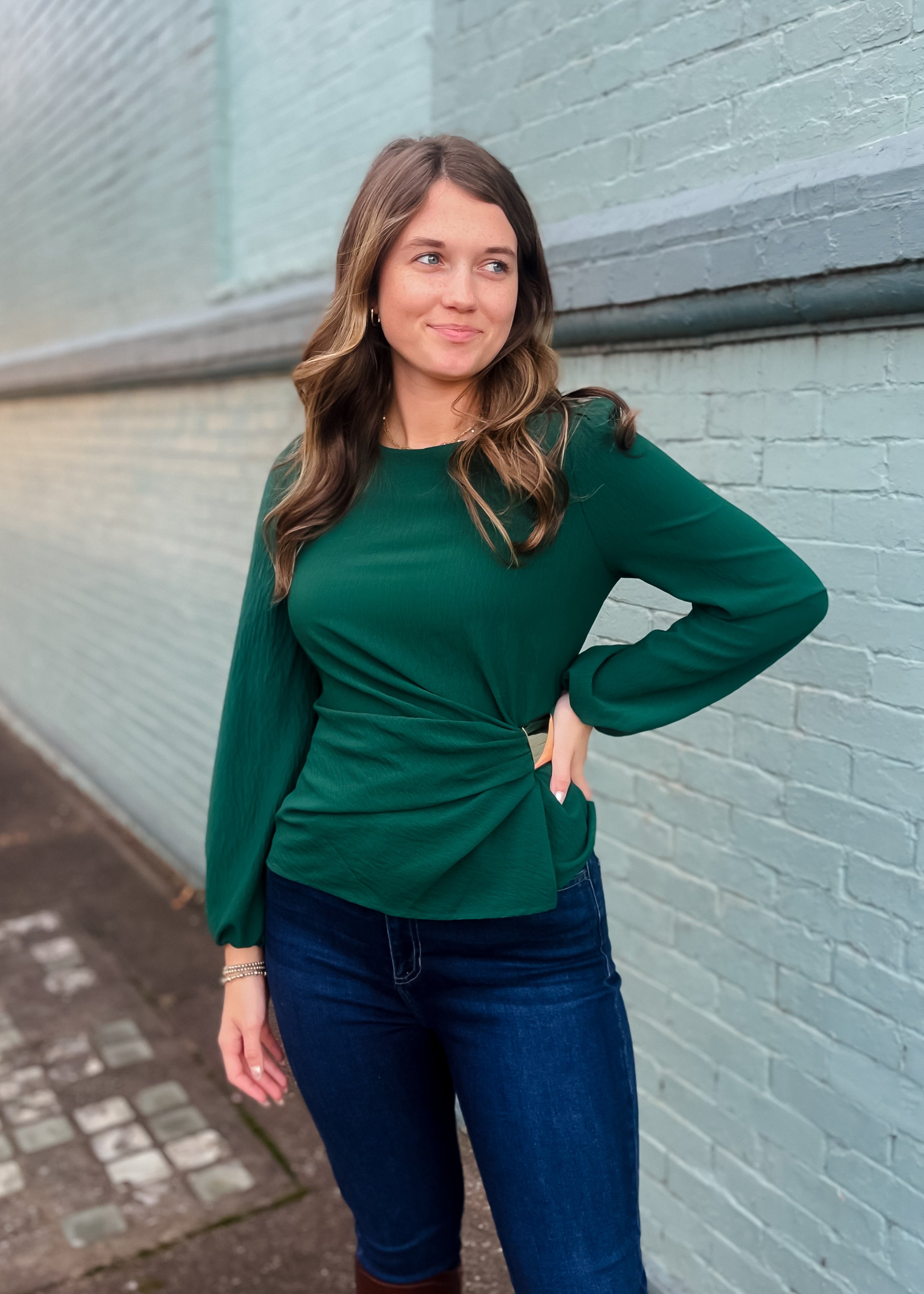 Embrace elegance with the Stay True To Yourself Top in rich hunter green. This long-sleeve design features a flattering waistline, subtle gold trim, and a delicate keyhole button back for a sophisticated look. A convenient side zipper enhances the fit, making it effortless to wear. Perfectly suited for both work and evening occasions, this top elevates your wardrobe while inspiring confidence and style.