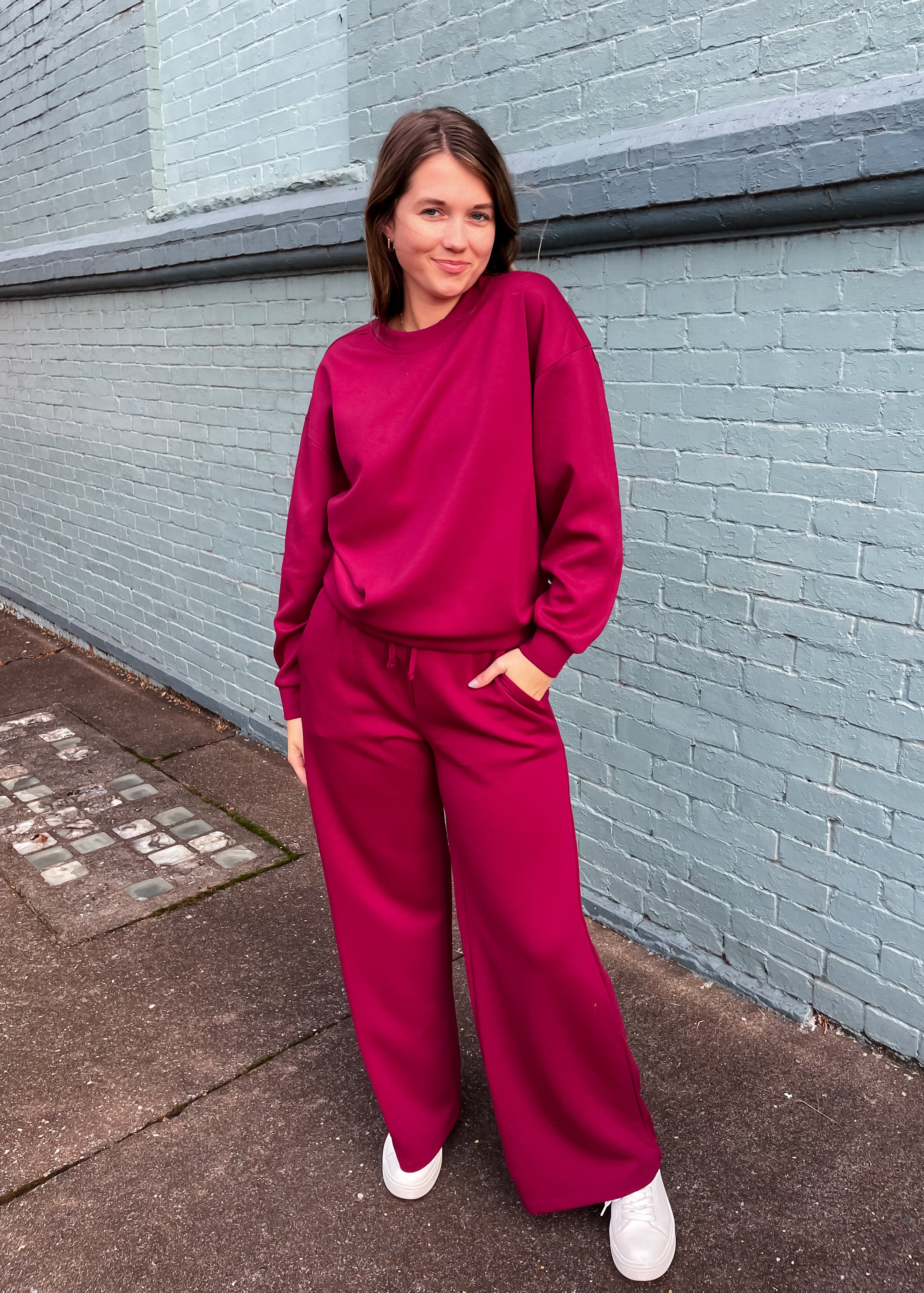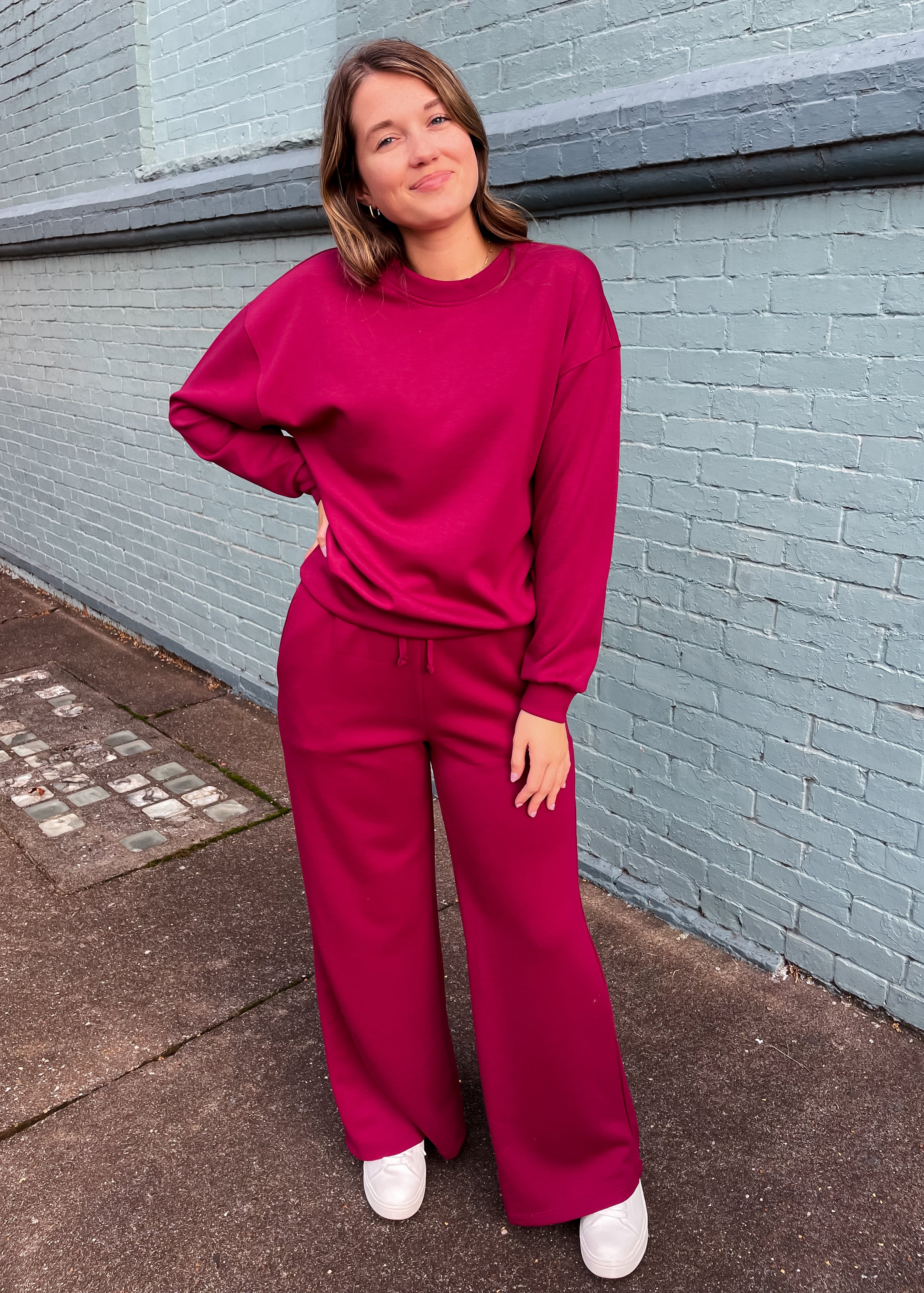 Discover the perfect blend of comfort and style with the Meant For More Two Piece Set. Crafted from soft scuba fabric, this two-piece includes a long-sleeve crewneck pullover and matching pants designed for ultimate ease. The pants feature an elastic waistband with a drawstring and handy pockets, allowing a personalized fit and practical storage. Its cozy interior softness makes it ideal for relaxing at home or stepping out casually. Available in rich wine, blue, and ash jade shades, and sizes S to XL, this set is your new wardrobe essential for effortless, all-day comfort.