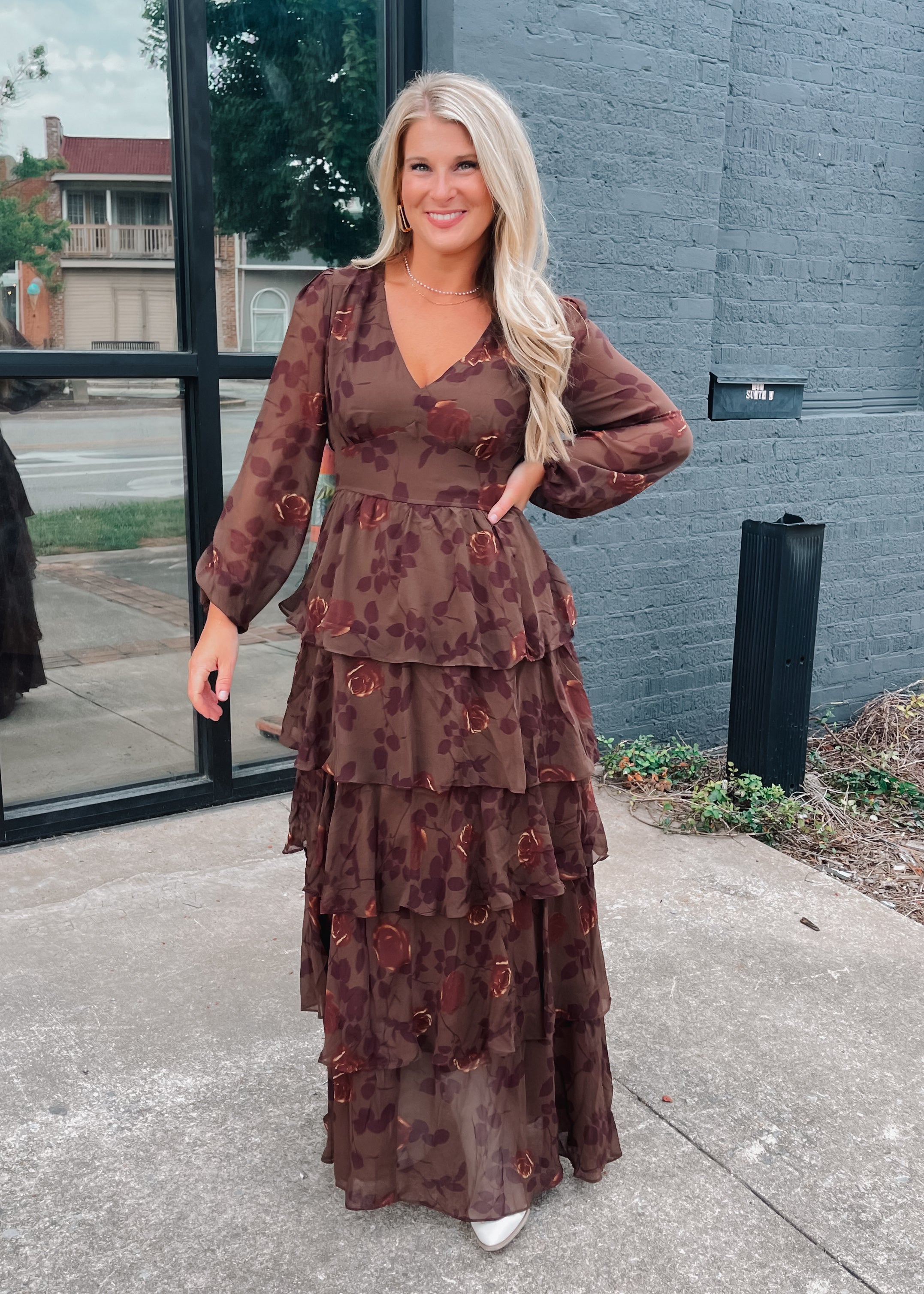 The In The Meantime Maxi Dress in warm amber features elegant tiered layers and a flattering V-neckline. Long sleeves and subtle rouching on the back add refined details, while a side zipper ensures a comfortable, tailored fit. This dress blends comfort and style effortlessly, making it perfect for any occasion where you want to feel confident and graceful.