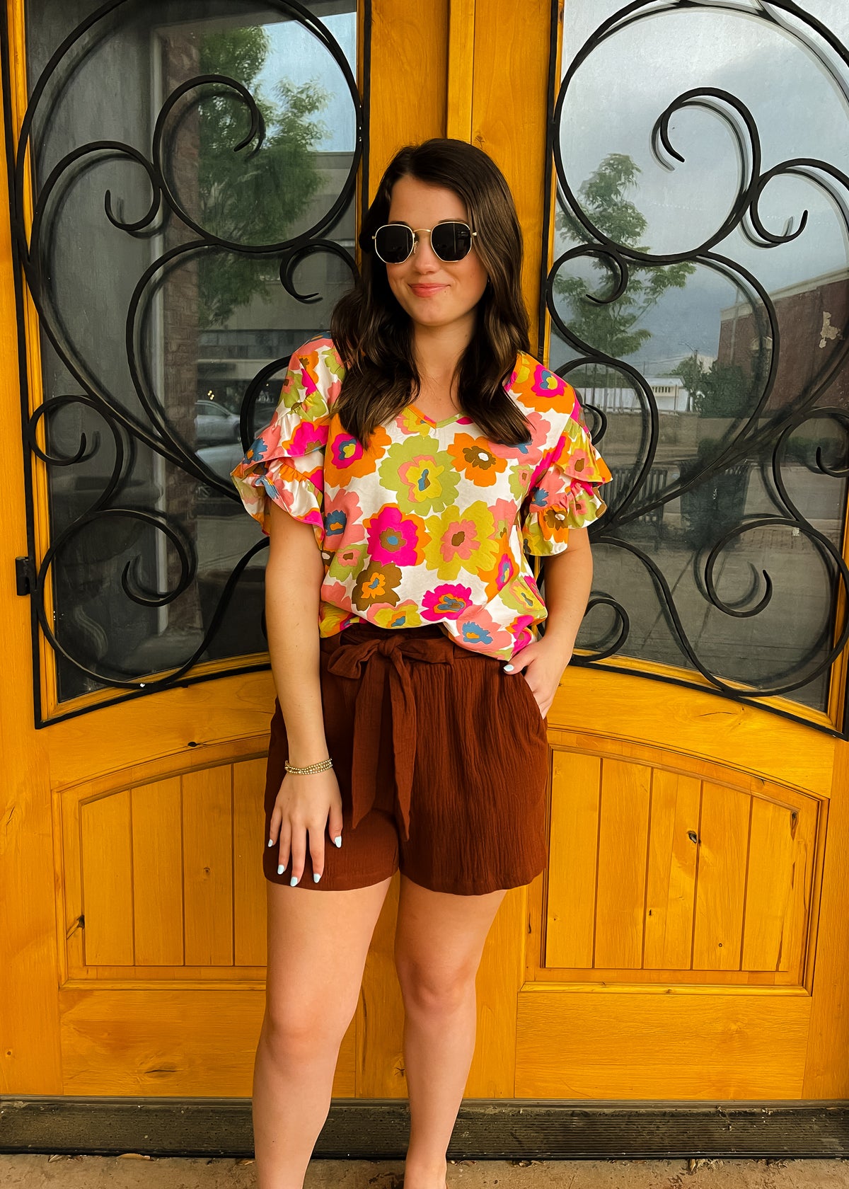 Top features a solid base color, stretchy material, short ruffle sleeves, round neck line and runs true to size!-navy