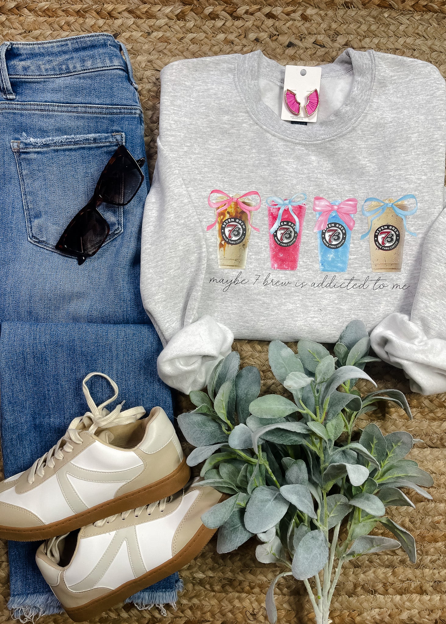 Embrace your favorite beverage obsession with this heather grey crewneck sweatshirt, featuring four 7 Brew drinks—two iced coffees and two energys—each adorned with charming pink and blue bows. The elegant black cursive phrase "Maybe 7 Brew Is Addicted To Me" adds a personal touch that speaks to your love for 7 Brew. Crafted for comfort and style, this sweatshirt is perfect for casual outings or cozy days in. Available in sizes S to 2XL, it’s a playful and cozy way to celebrate your 7 Brew addiction.