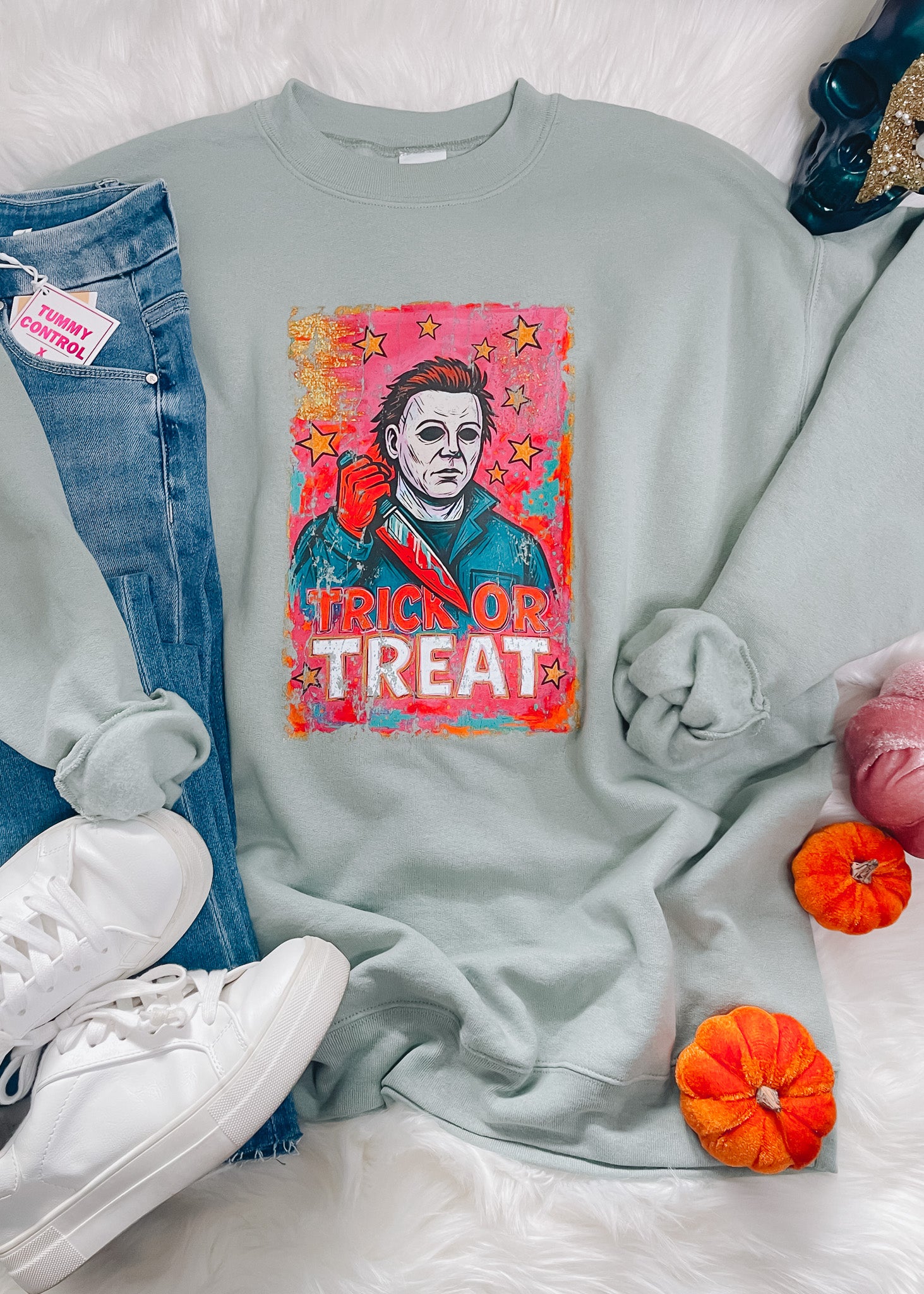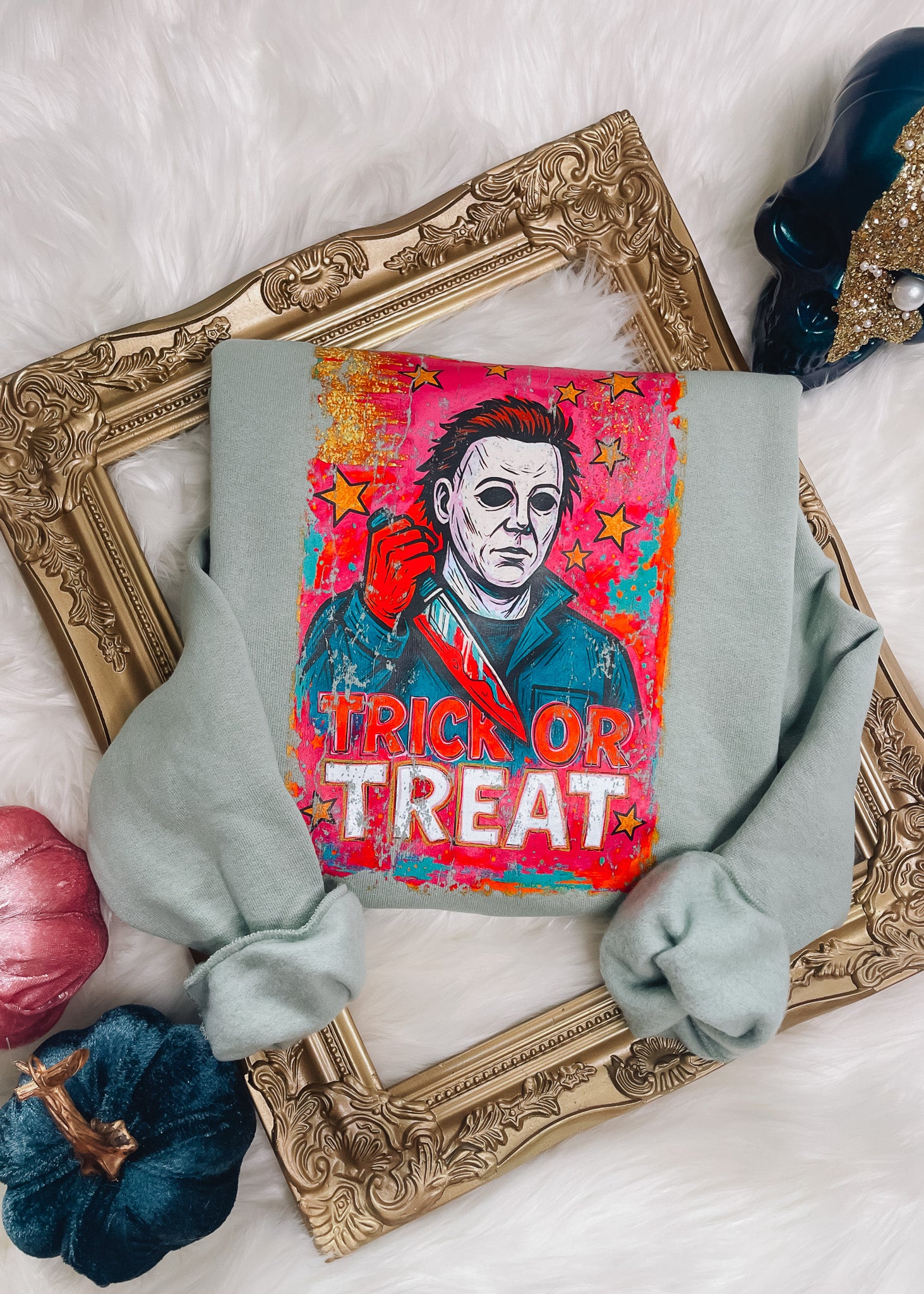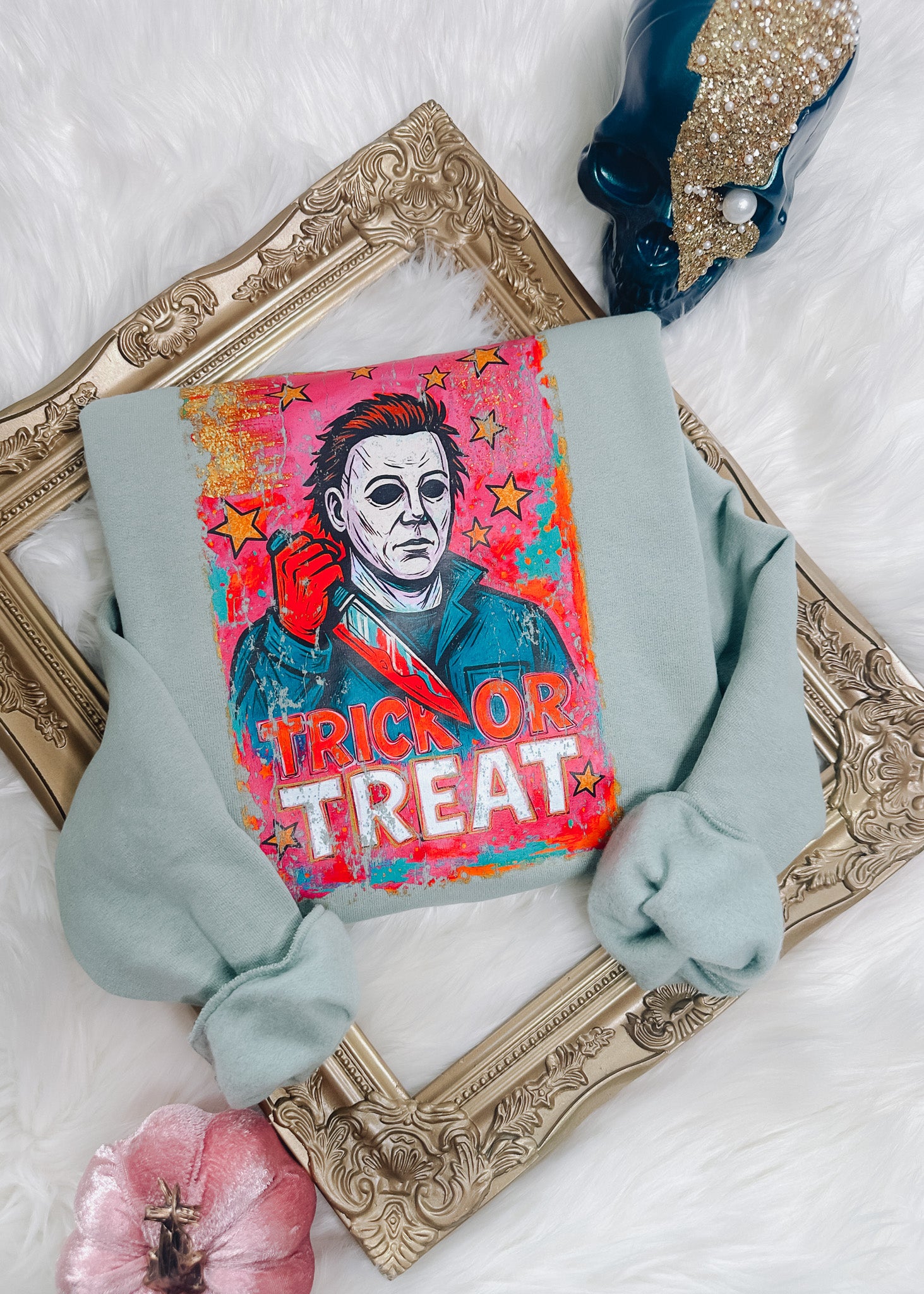 Embrace spooky style with this sage-colored crewneck sweatshirt featuring Michael Myers in his iconic pose, knife in hand. The vibrant pink, gold, and blue starry background adds a playful yet eerie touch, perfect for Halloween or everyday wear. Available in sizes S to 2XL, this sweatshirt combines comfort with bold graphic appeal to make your seasonal outfit stand out.