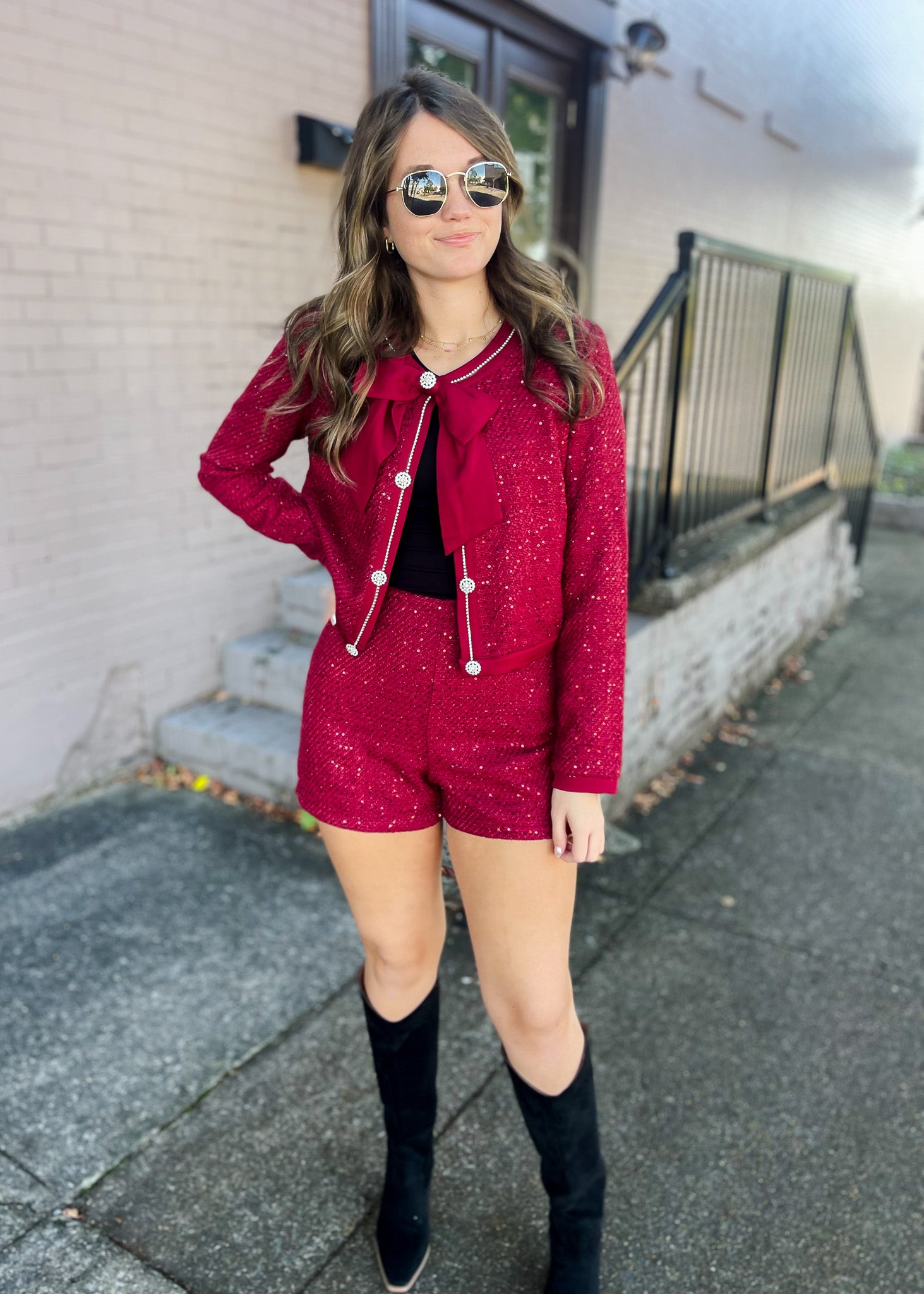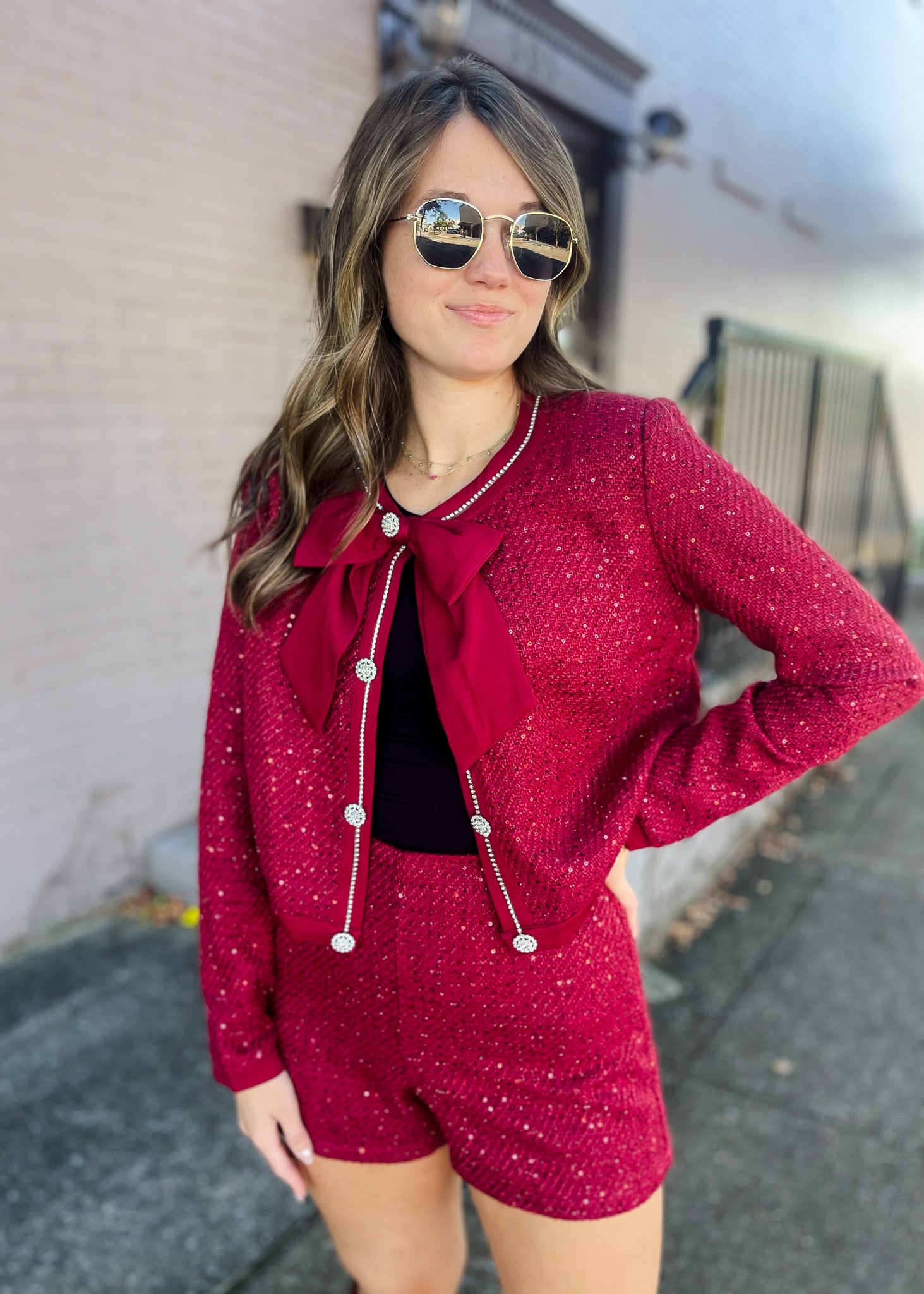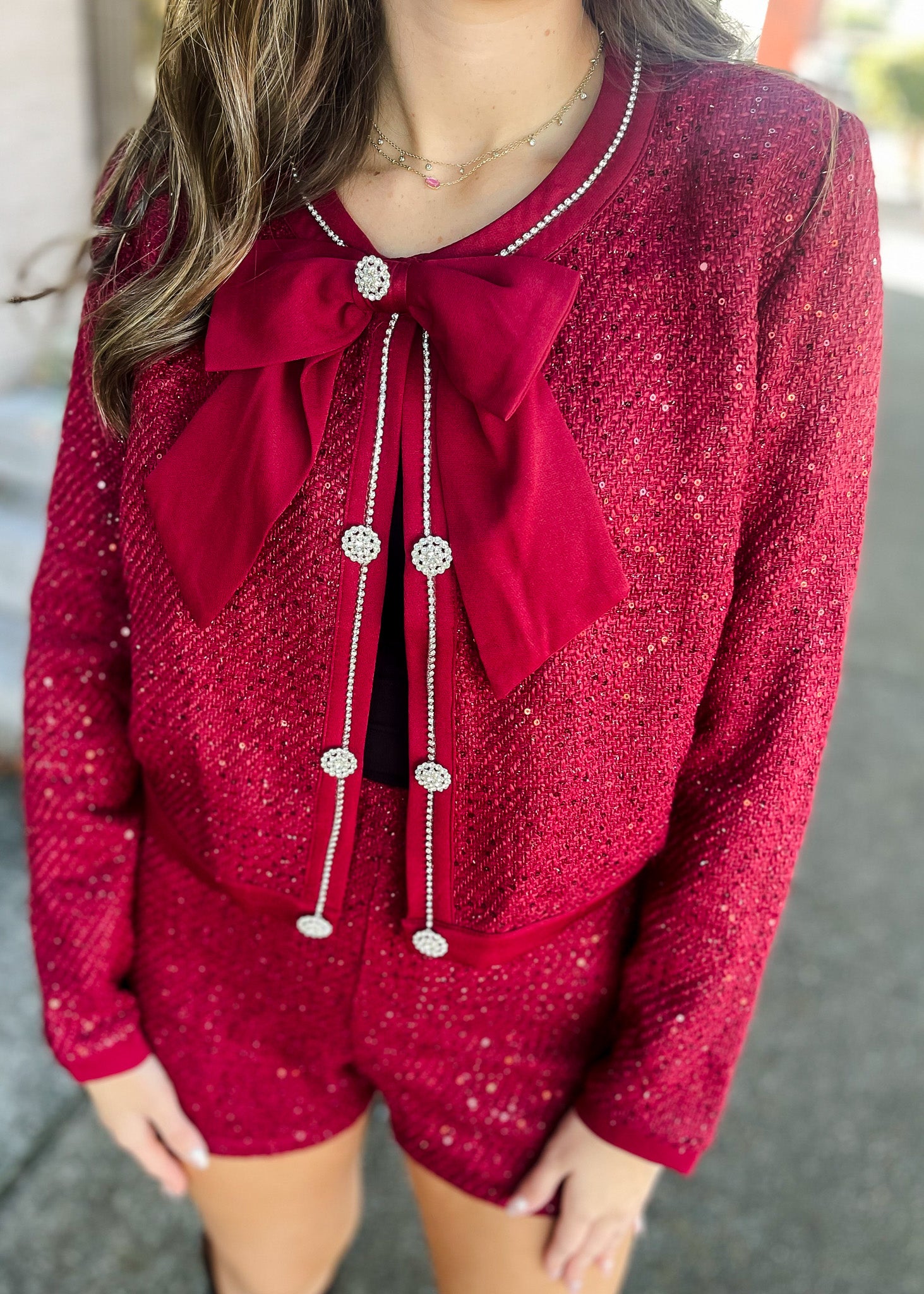 Elevate your wardrobe with the From Here On Tweed Two Piece Set in a gorgeous wine. This chic ensemble features sparkling diamond buttons, a delicate bow closure, and shimmering rhinestones on the long-sleeve top for a glamorous touch. The tailored shorts ensure a comfortable, flattering fit, making this set perfect for turning heads from day to night. Combine bold color with elegant details to make every occasion unforgettable.