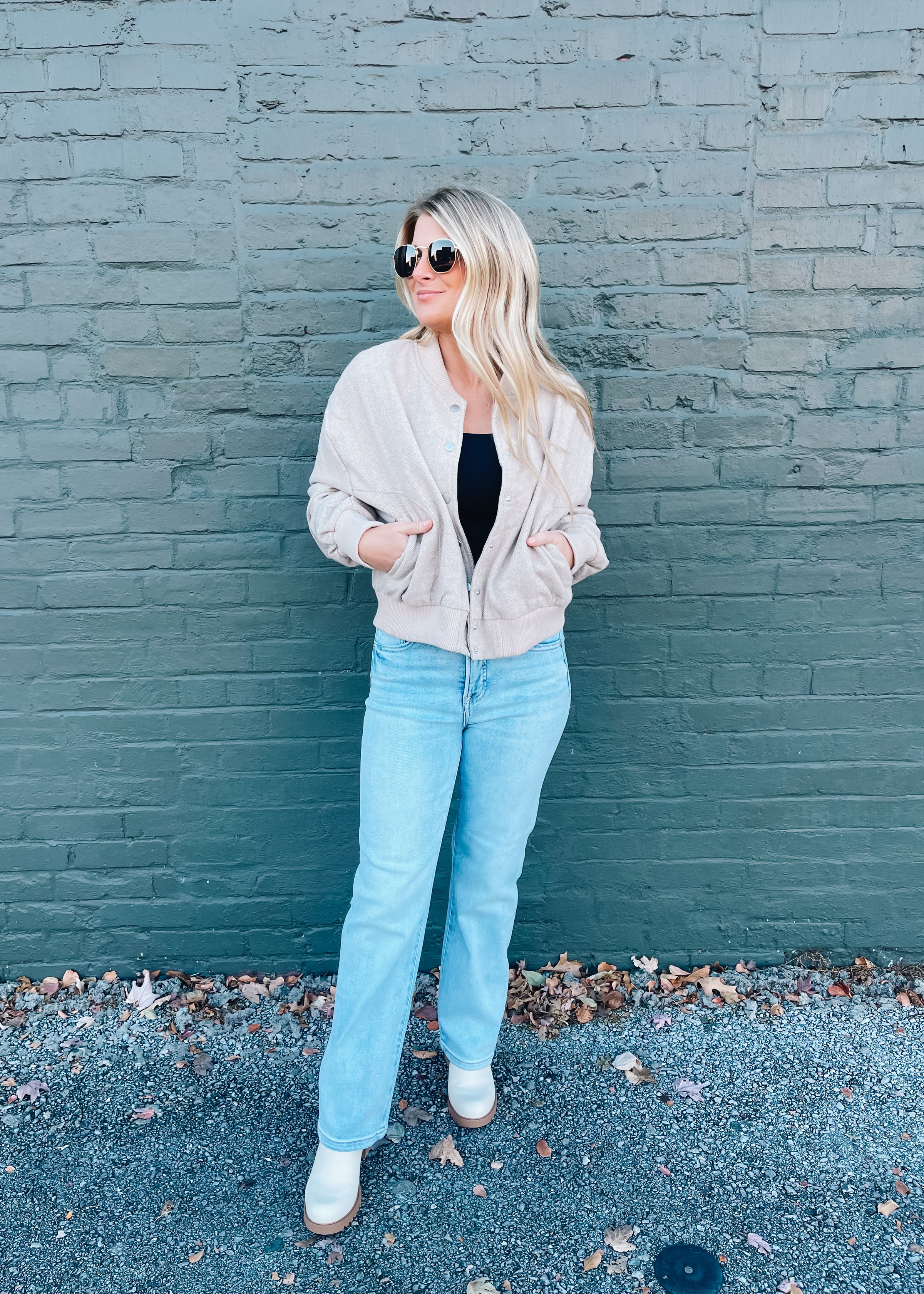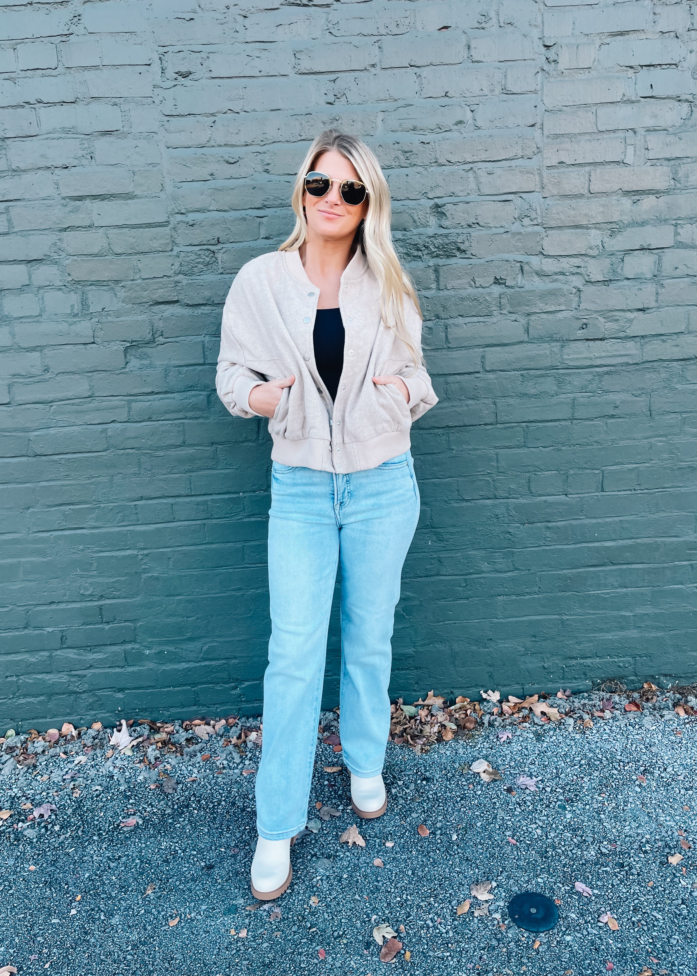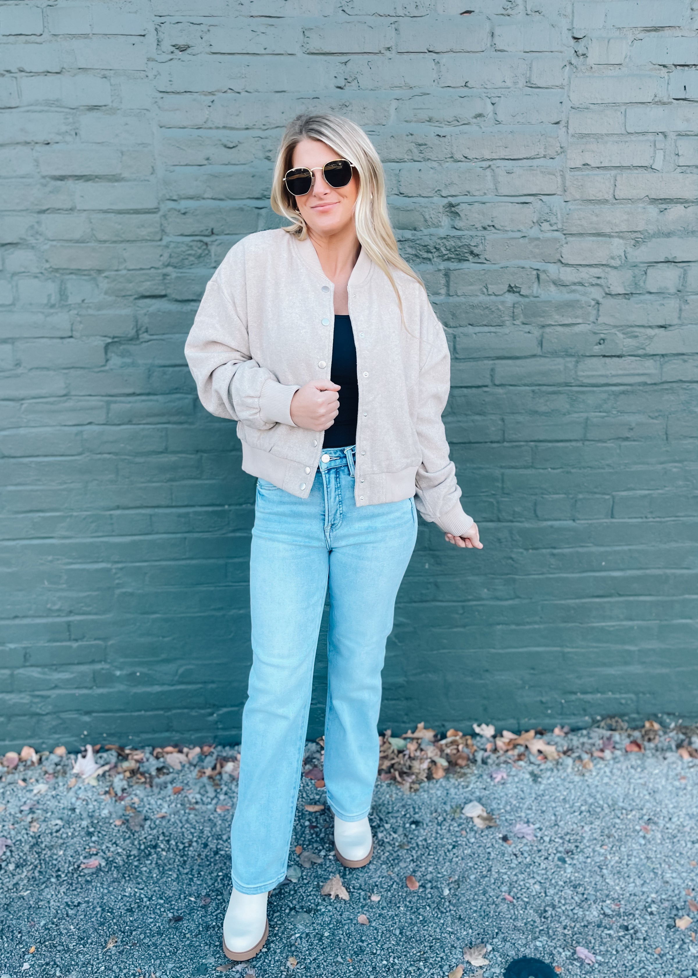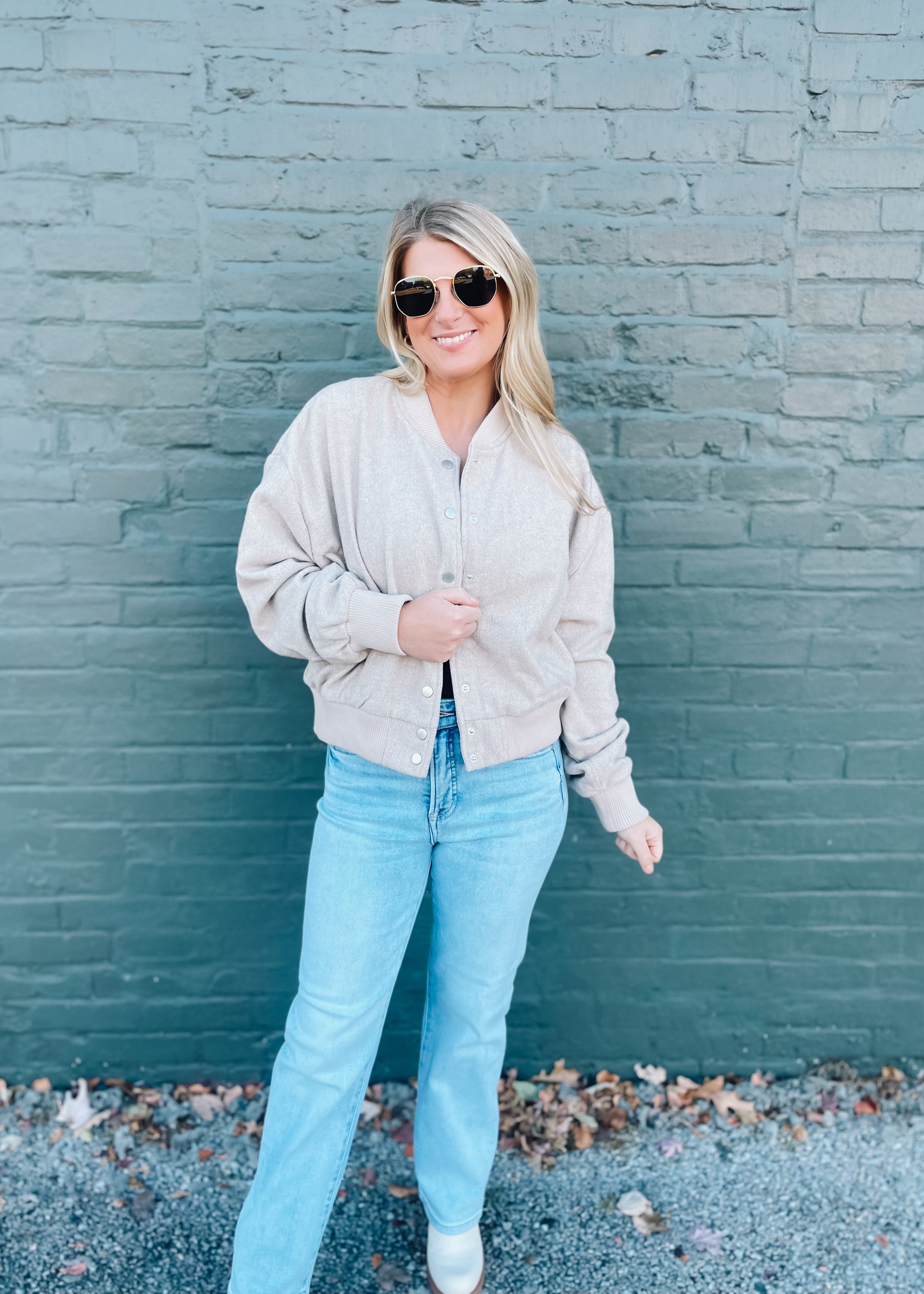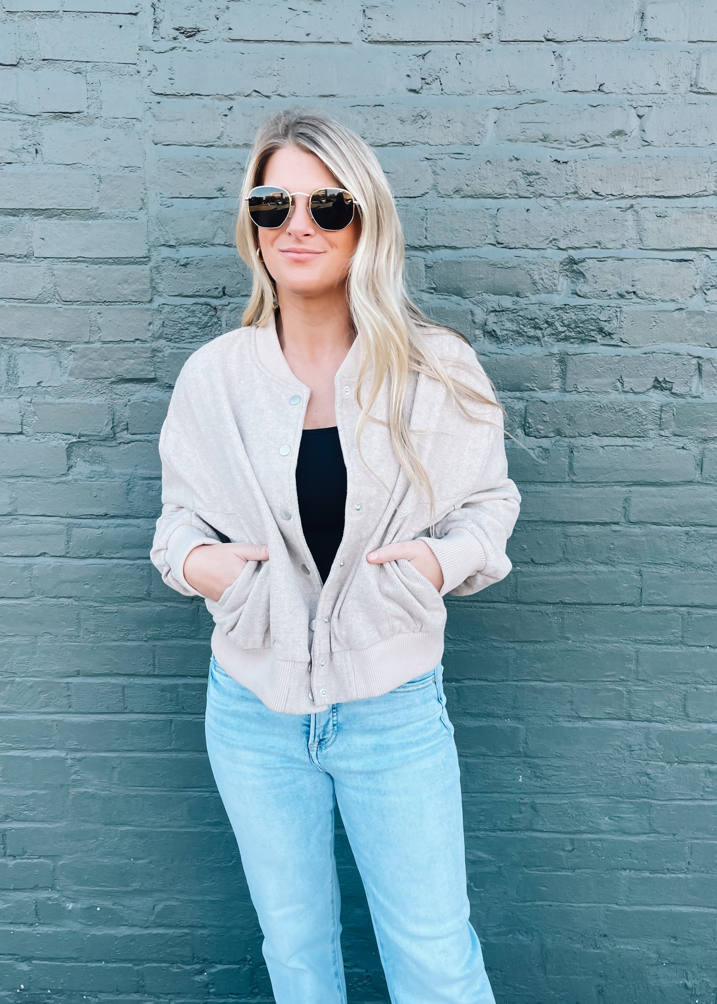 Elevate your casual wardrobe with this camel-colored snap button bomber jacket—the perfect layer for effortless style. Featuring a classic round neckline and sturdy snap closures, this jacket combines comfort with contemporary edge. The ribbed hem keeps everything in place while you move through your day, while the solid construction ensures versatility for endless outfit combinations. Whether you're dressing up basics or adding texture to your look, this bomber delivers the polish and practicality you've been searching for.