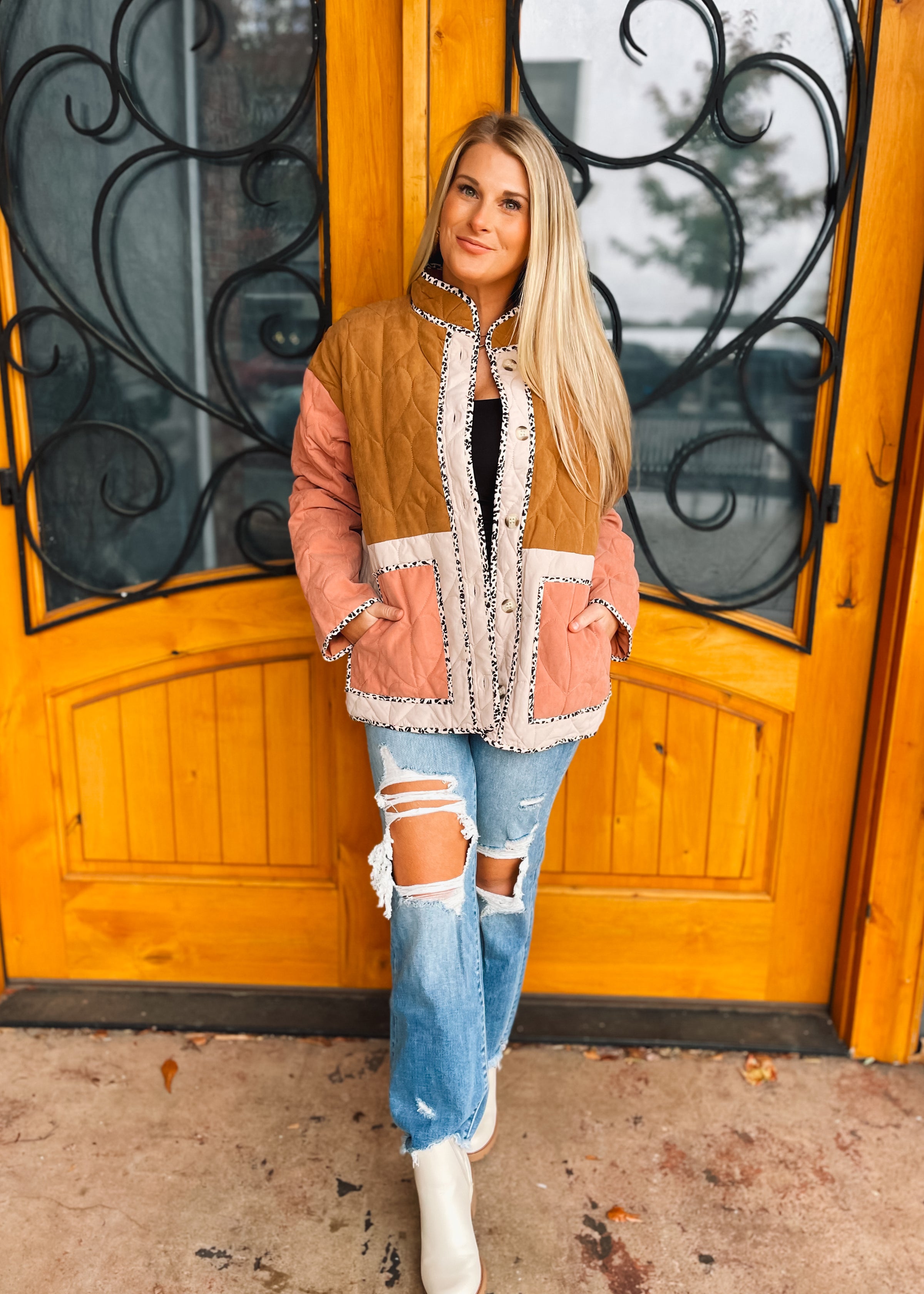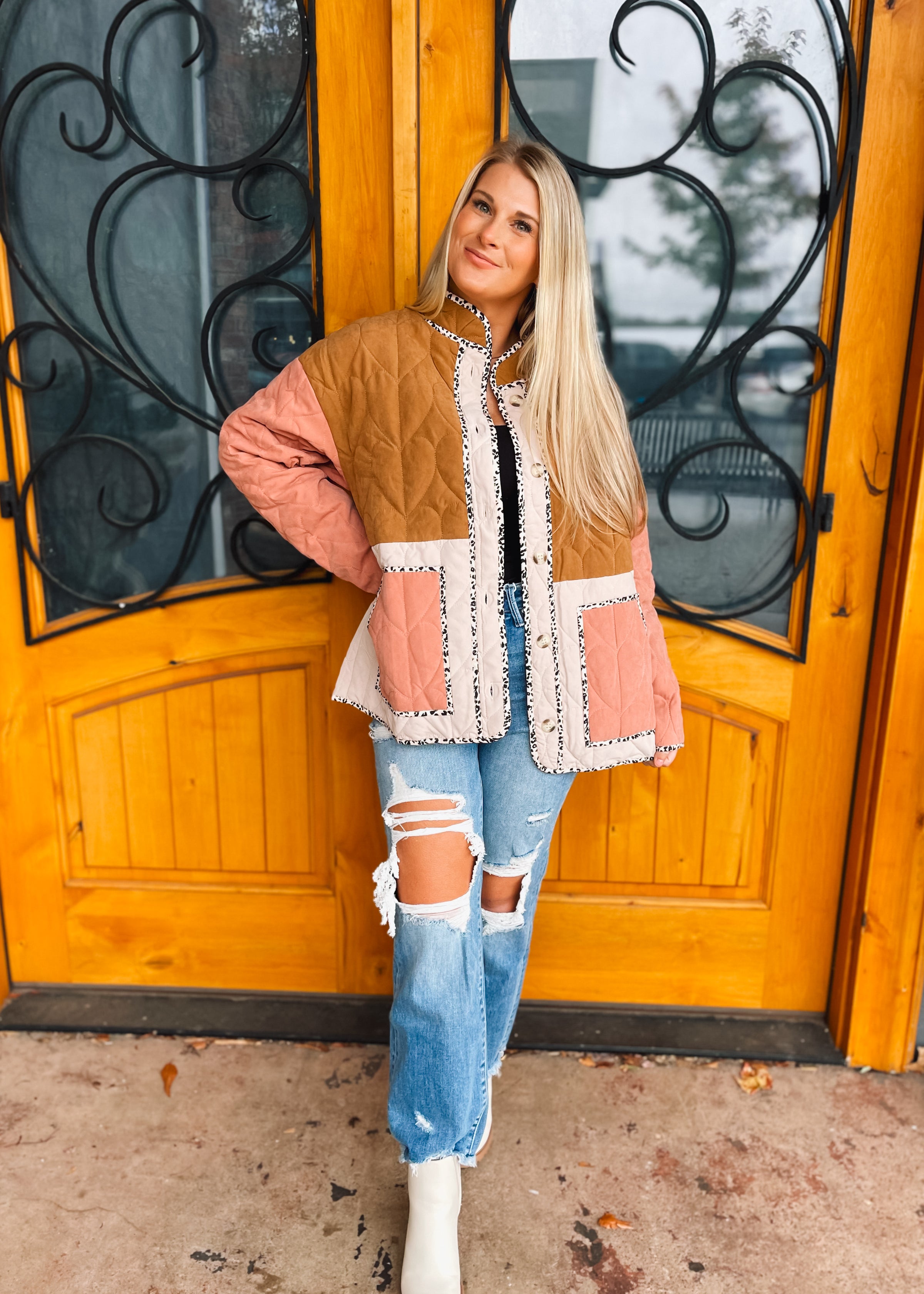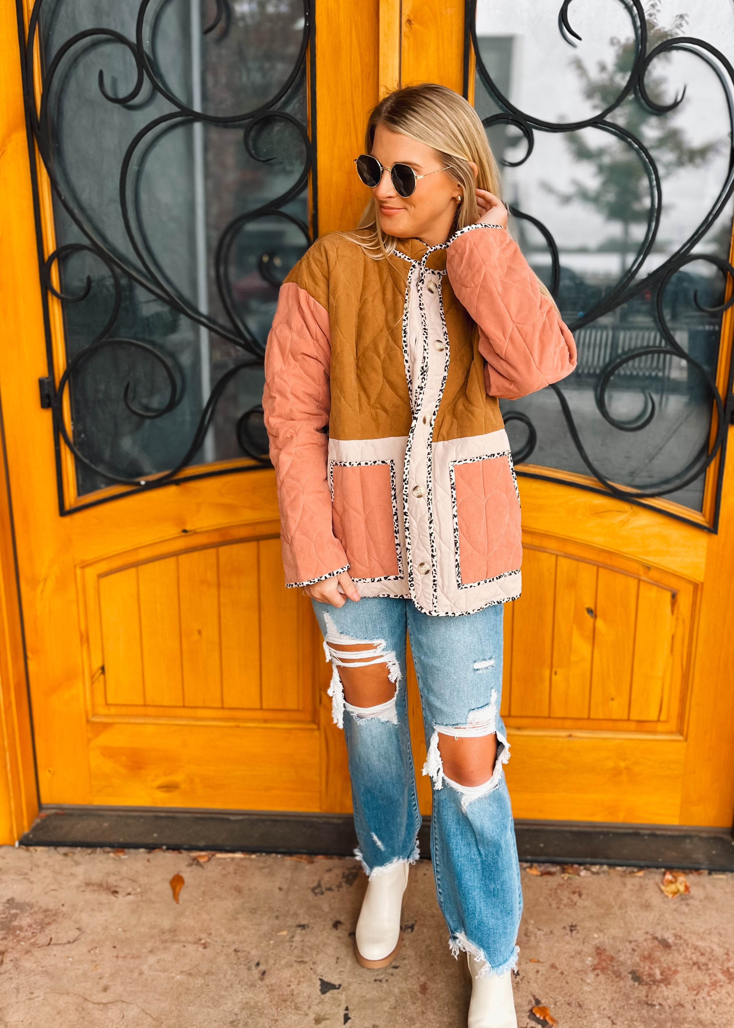 Stay stylish and cozy with the Timely Matter Quilted Button Down Jacket. Featuring a unique color block design in brown, pink, and cream, this jacket stands out with its soft corduroy fabric adorned with a subtle solid heart pattern. The chic cheetah-print lining adds a touch of wild sophistication, while two front pockets offer practical storage. Perfect for layering, this jacket combines comfort and eye-catching detail for your everyday wardrobe.