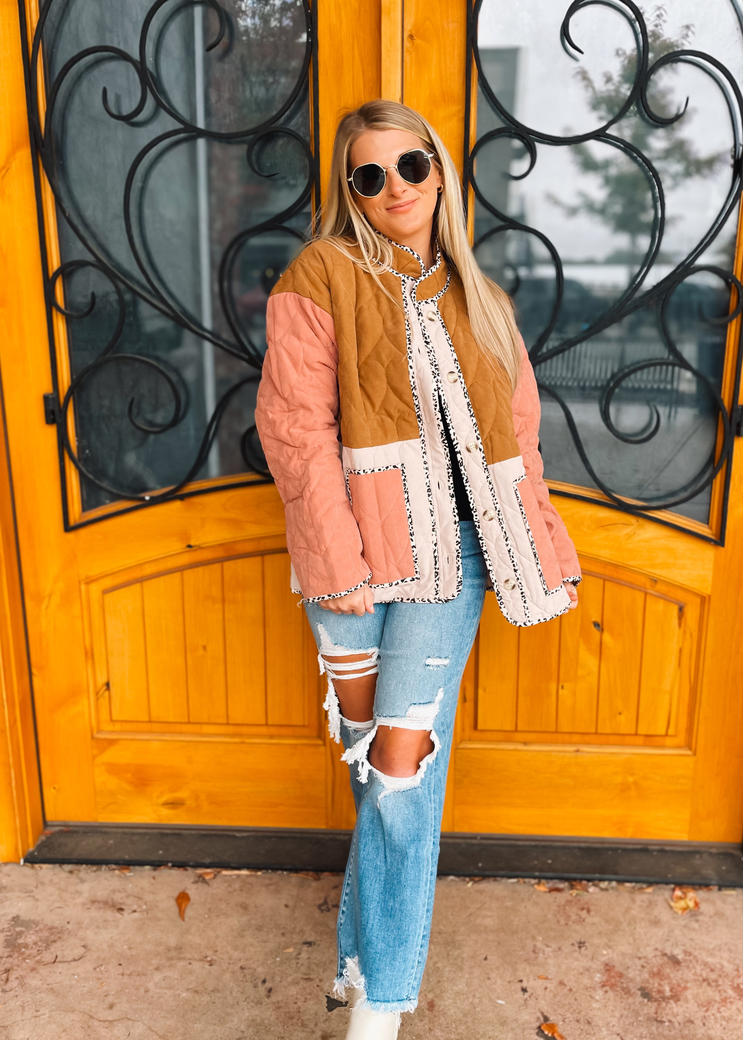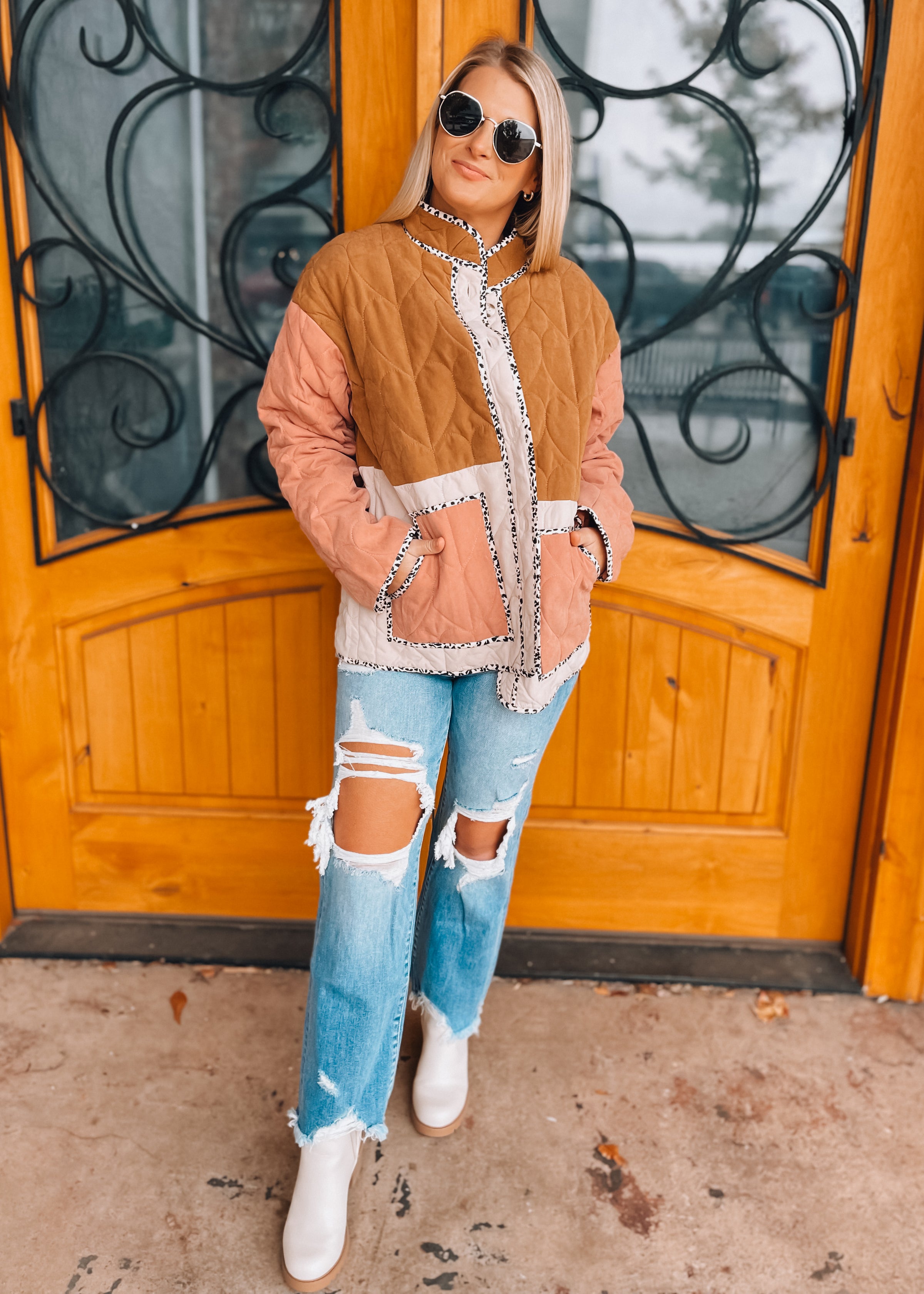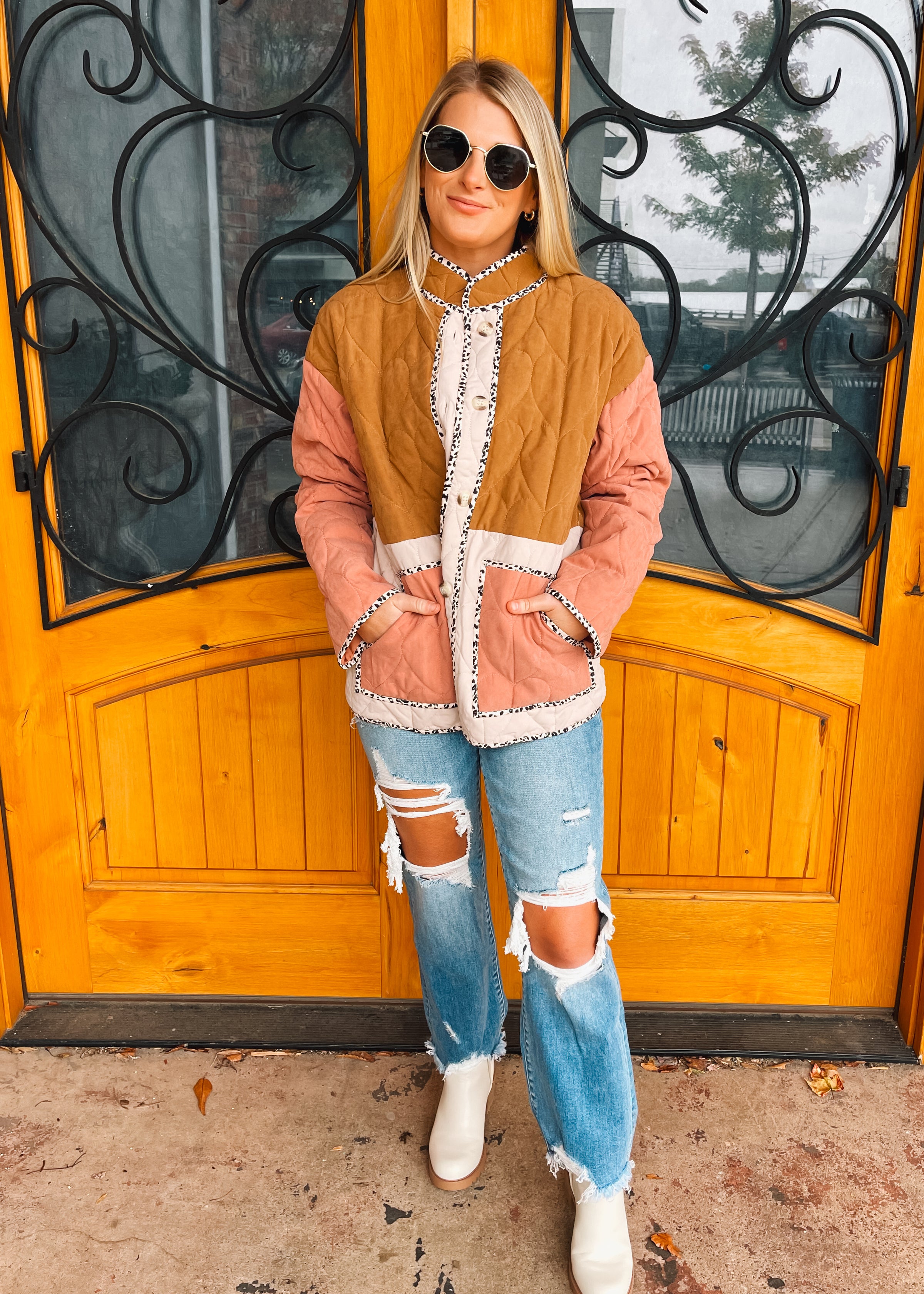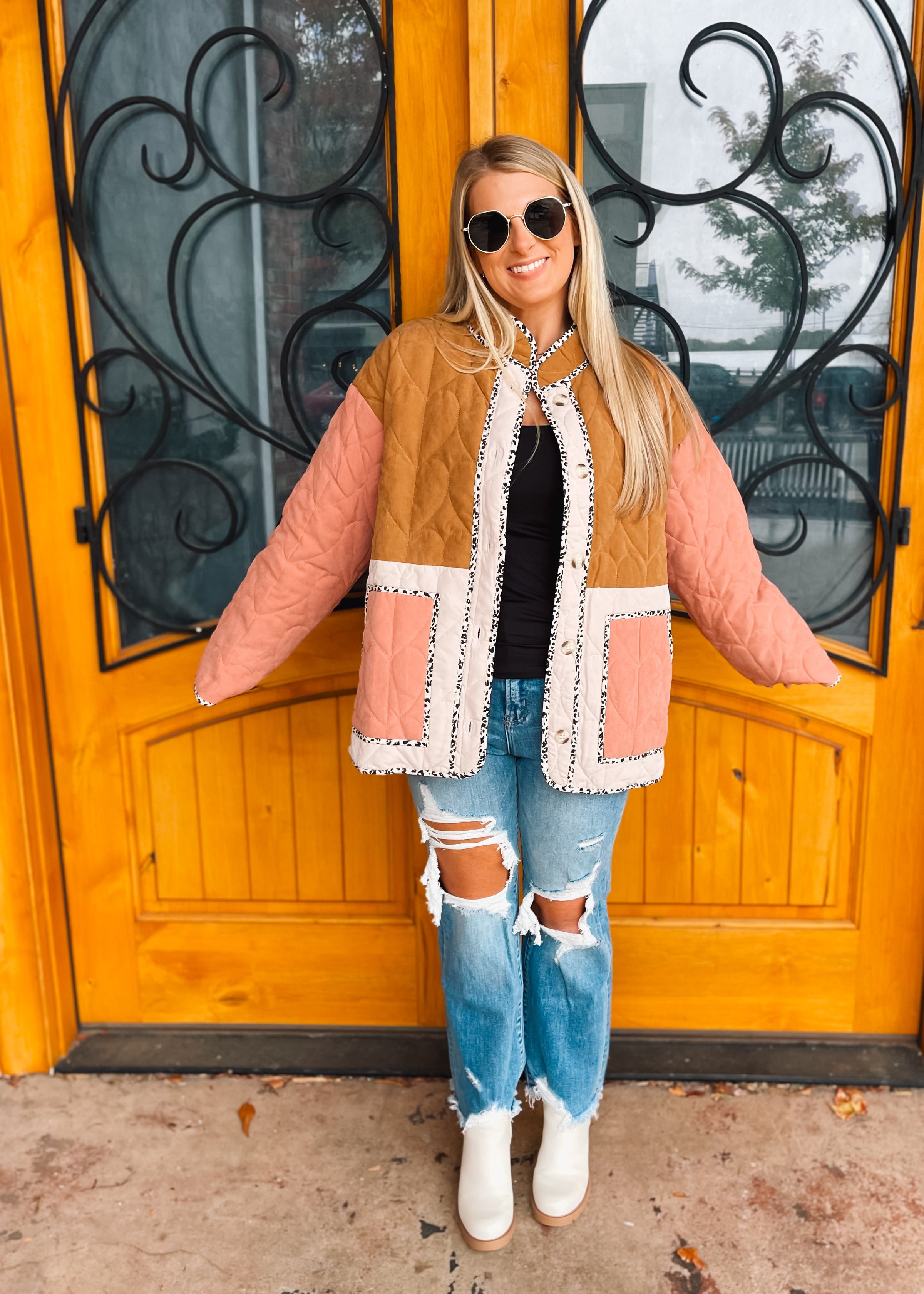 Stay stylish and cozy with the Timely Matter Quilted Button Down Jacket. Featuring a unique color block design in brown, pink, and cream, this jacket stands out with its soft corduroy fabric adorned with a subtle solid heart pattern. The chic cheetah-print lining adds a touch of wild sophistication, while two front pockets offer practical storage. Perfect for layering, this jacket combines comfort and eye-catching detail for your everyday wardrobe.