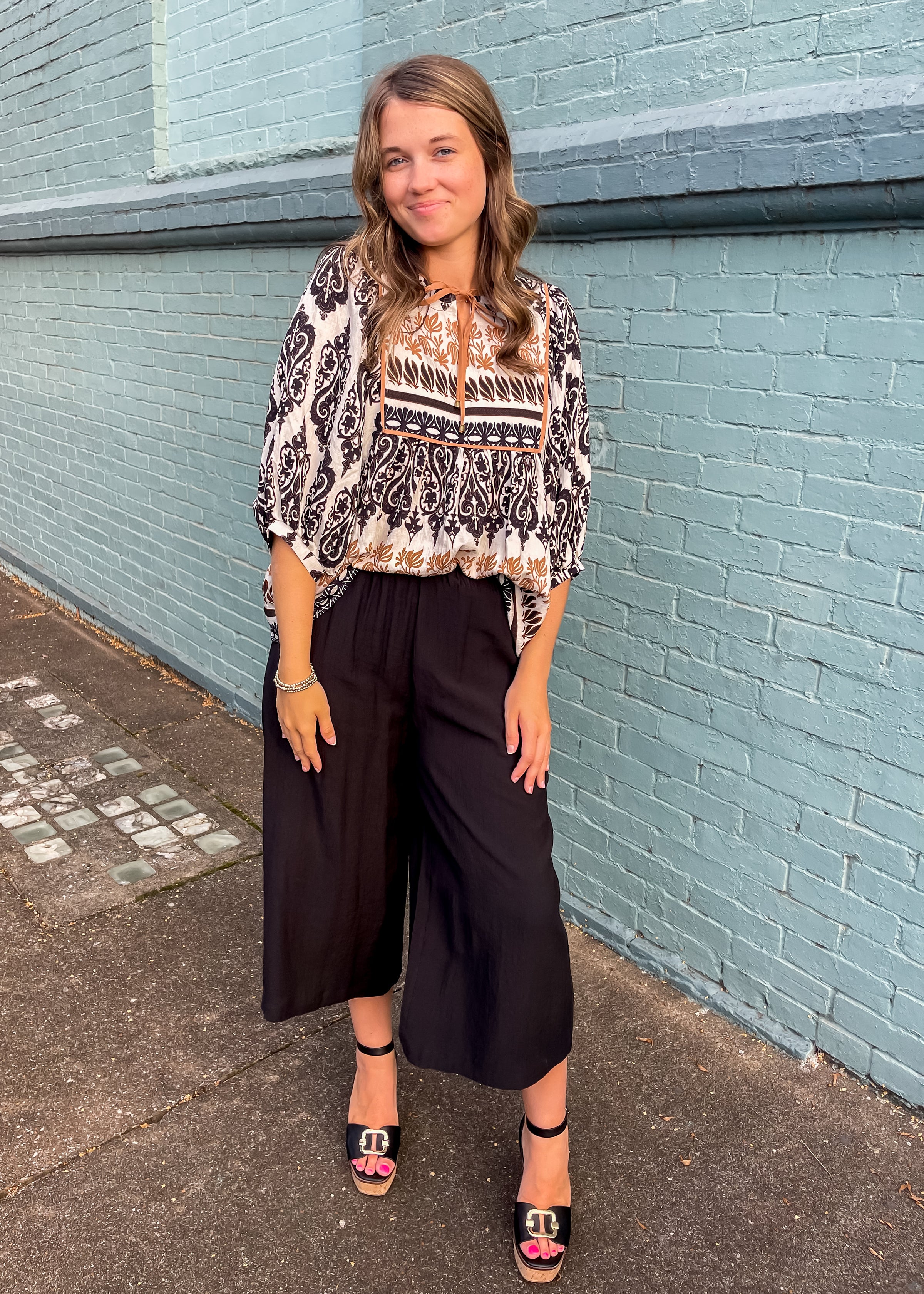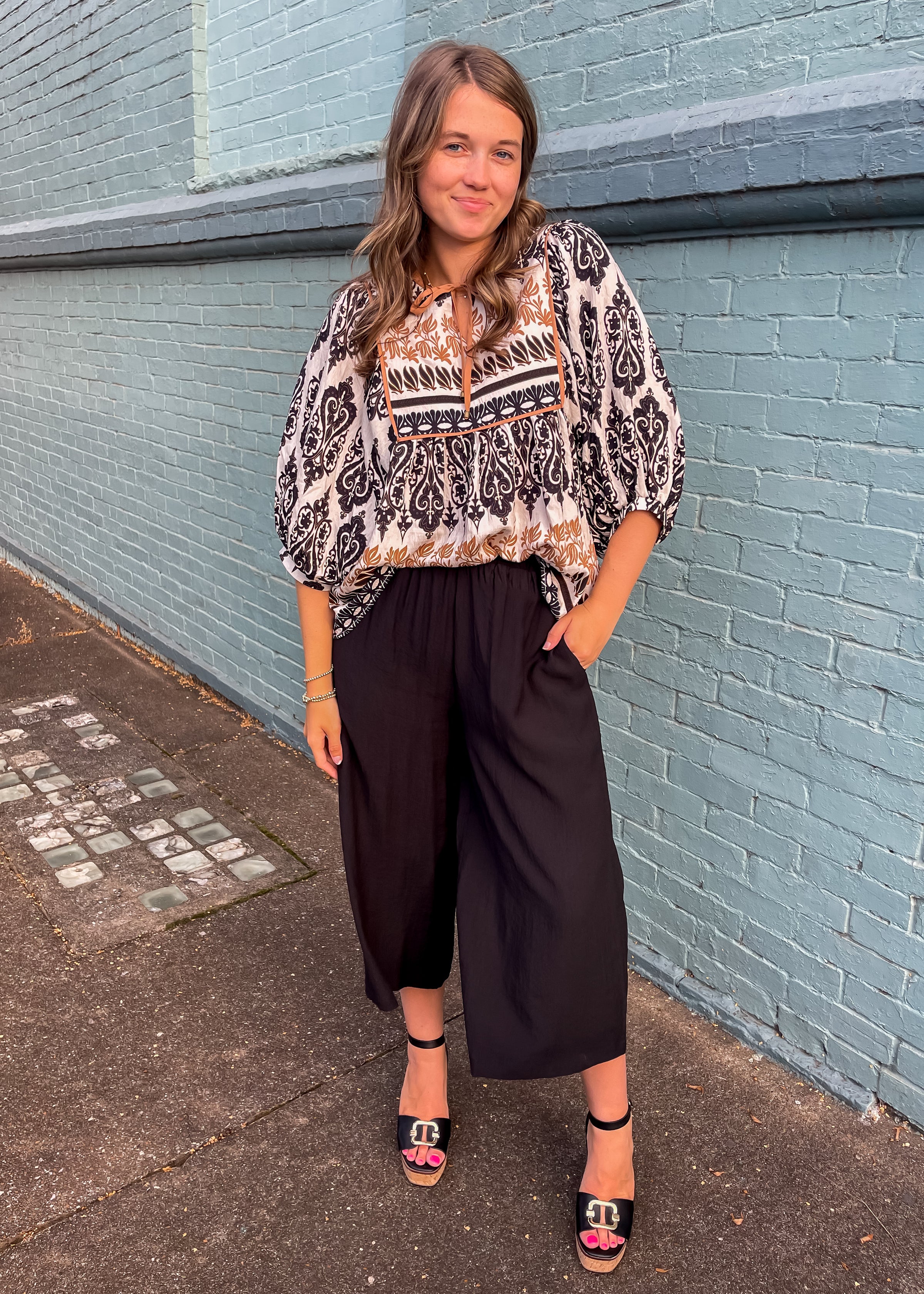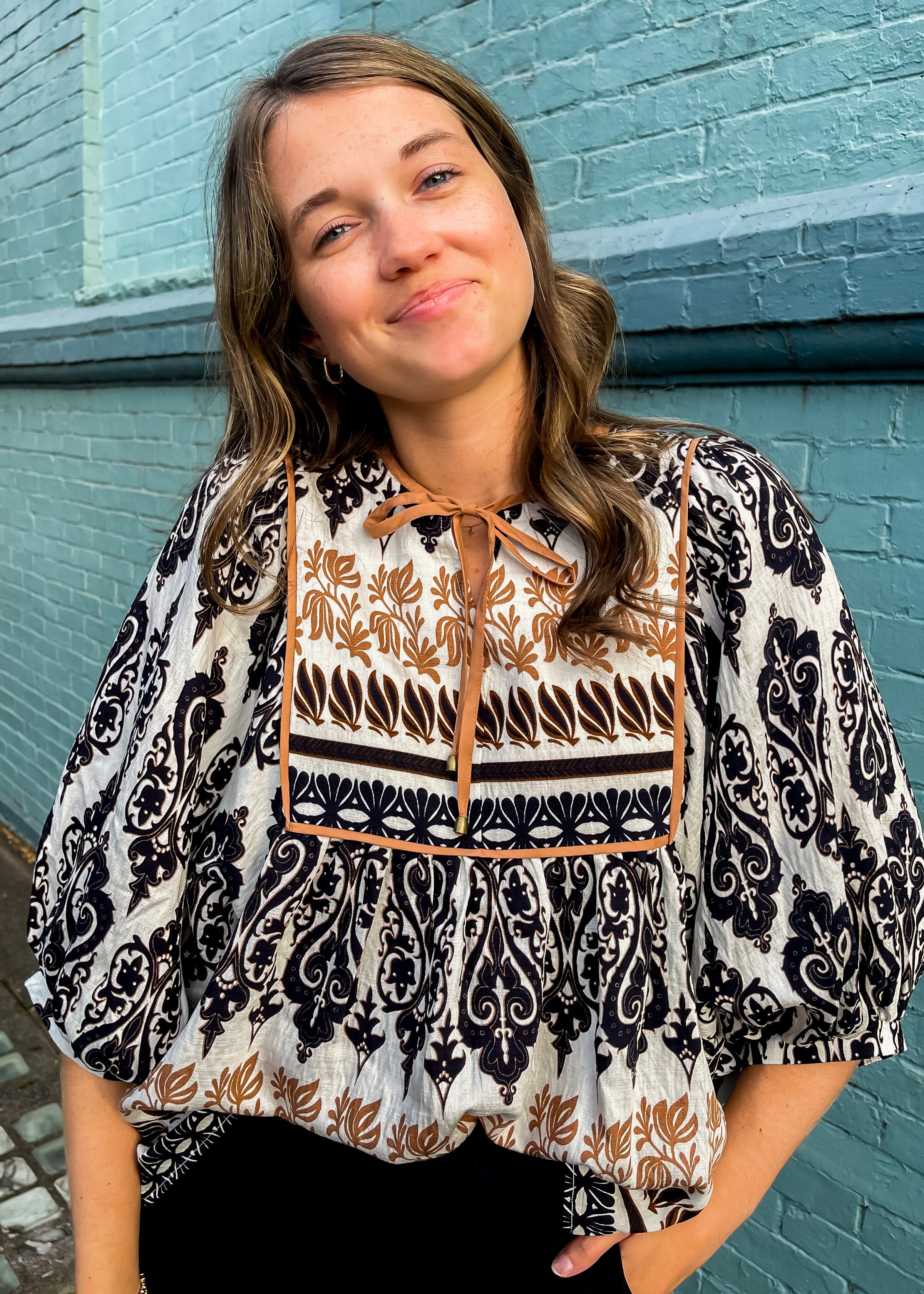 Elevate your wardrobe with the Trust Me On This One Top, featuring a white base and flattering quarter peasant sleeves for effortless style. Its unique black and brown abstract patterns create a chic, artistic look, while the brown tie-neck and square chest outline add a distinctive touch of elegance. Perfect for making a confident statement, this top blends comfort with standout design to keep you looking your best.