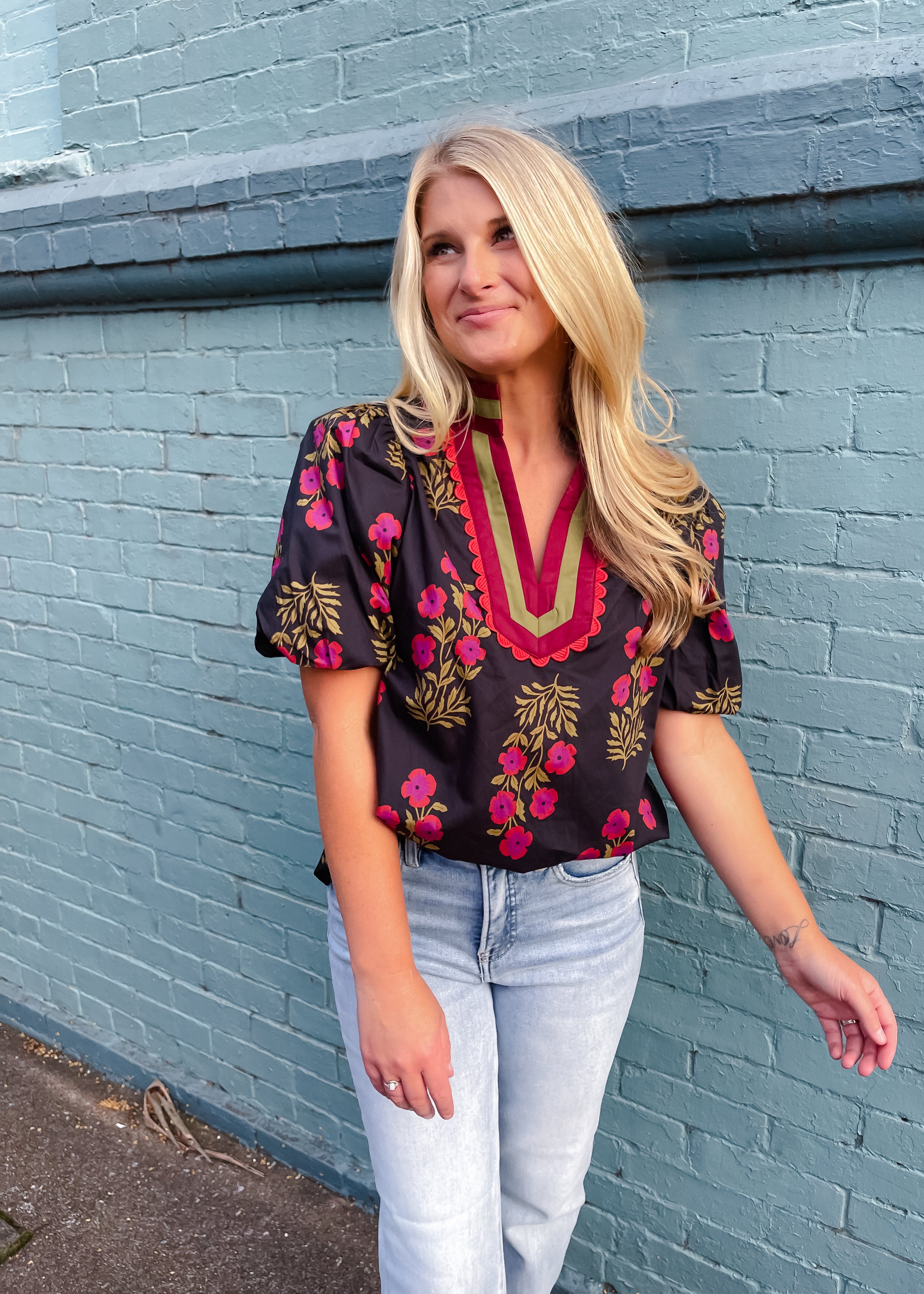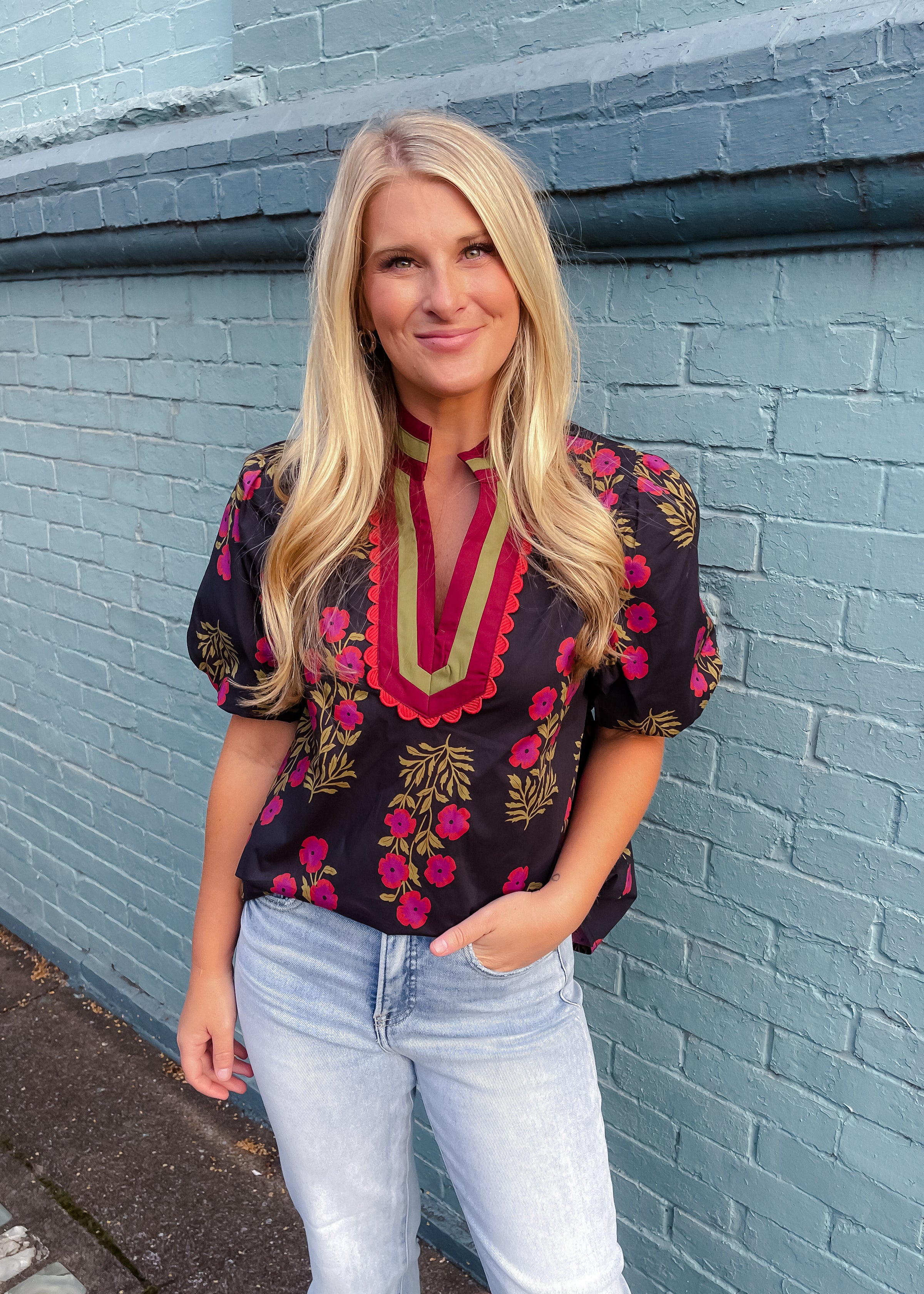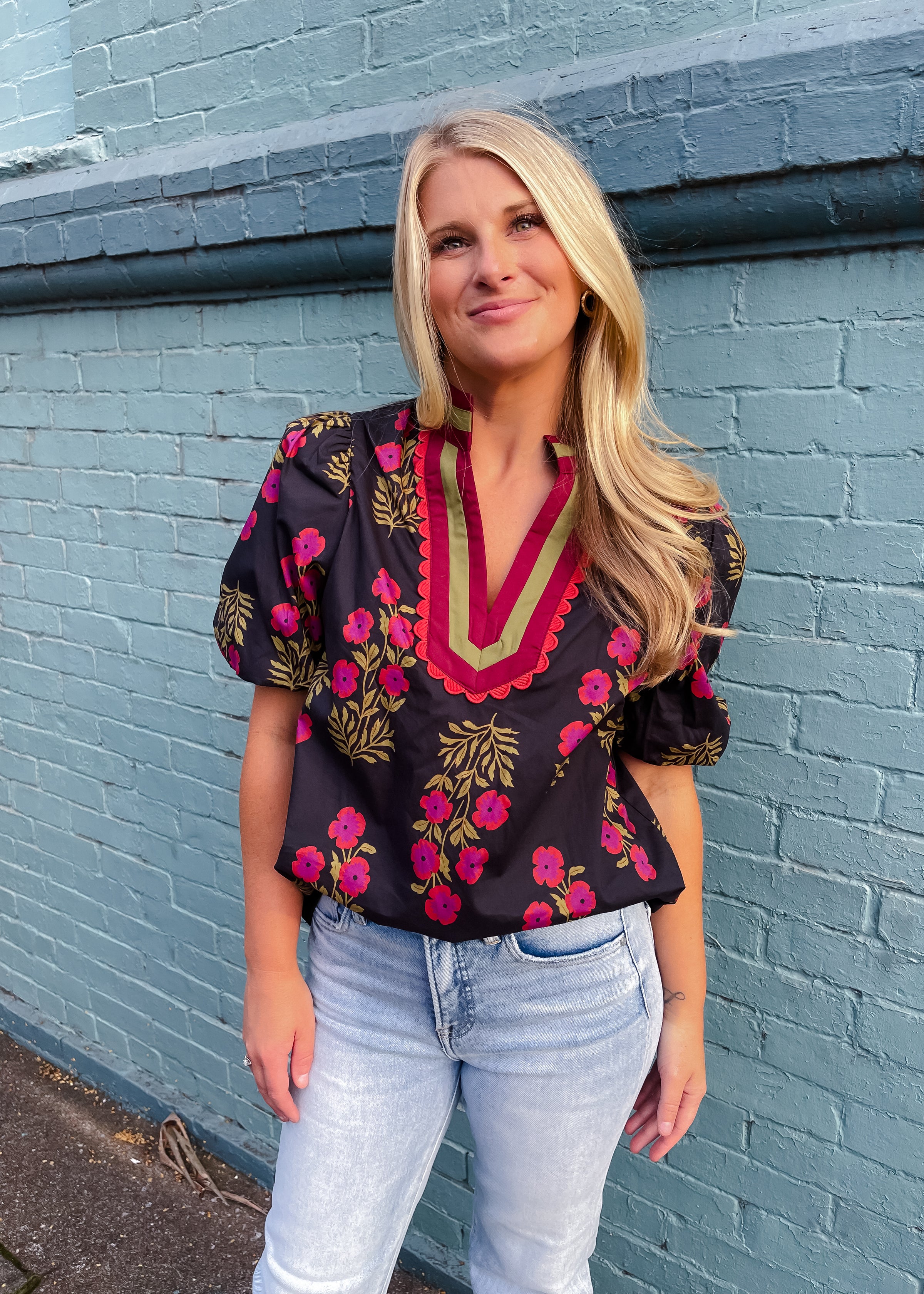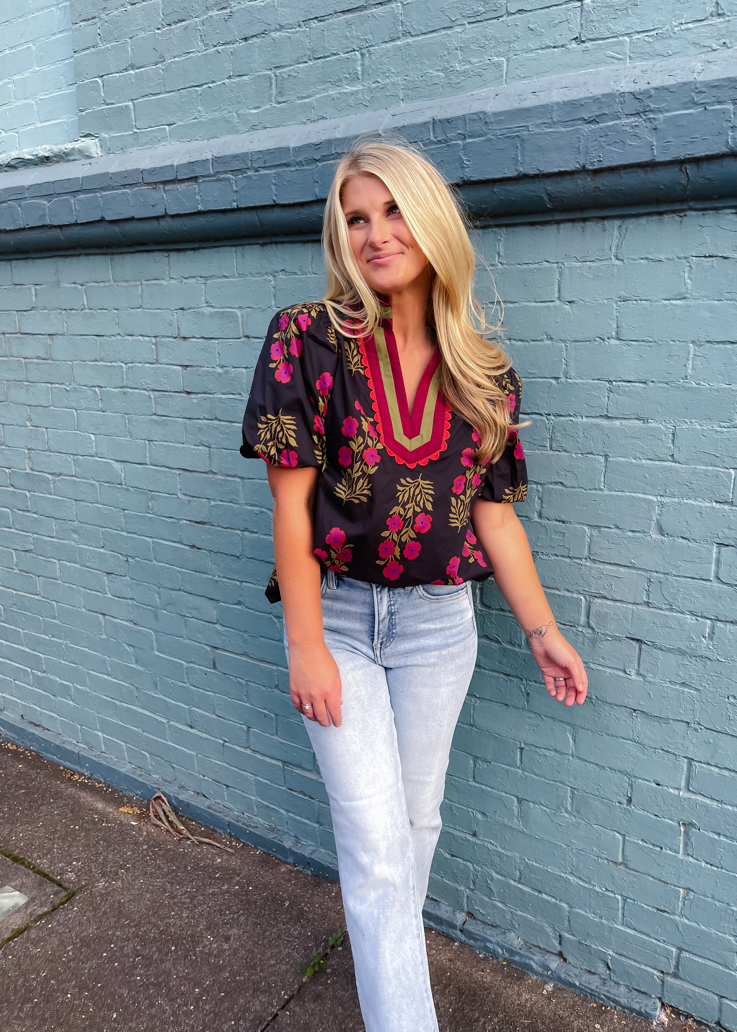 Elevate your wardrobe with the A Day Well Spent Top, featuring dramatic black puff sleeves for a stylish silhouette. The standout purple and green striped collar with a scalloped edge adds a unique touch, leading into a flattering V-neckline. Beautifully adorned with red and purple floral embroidery and lush greenery, this top brings subtle elegance to any outfit. Perfect for turning everyday moments into something special.
