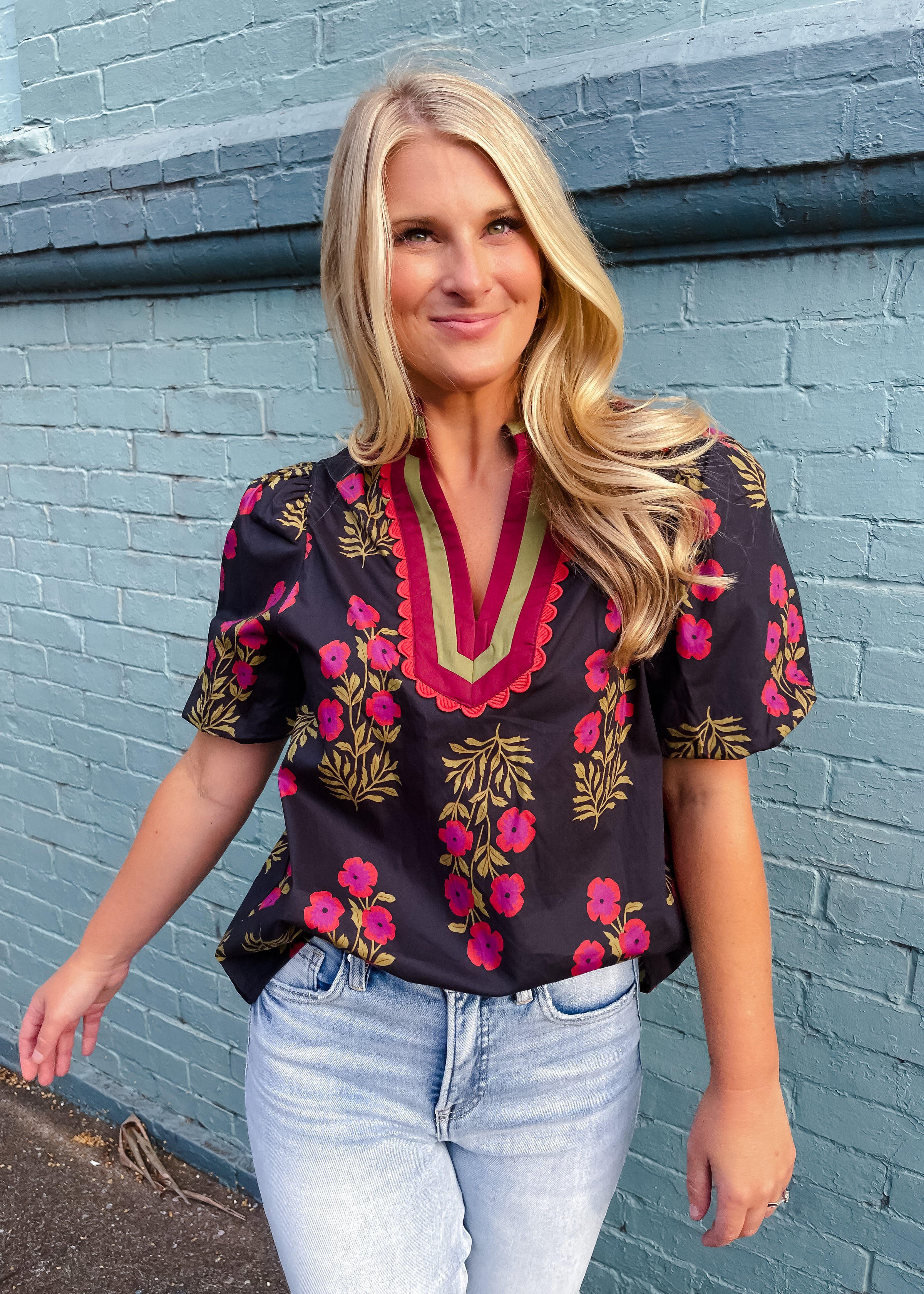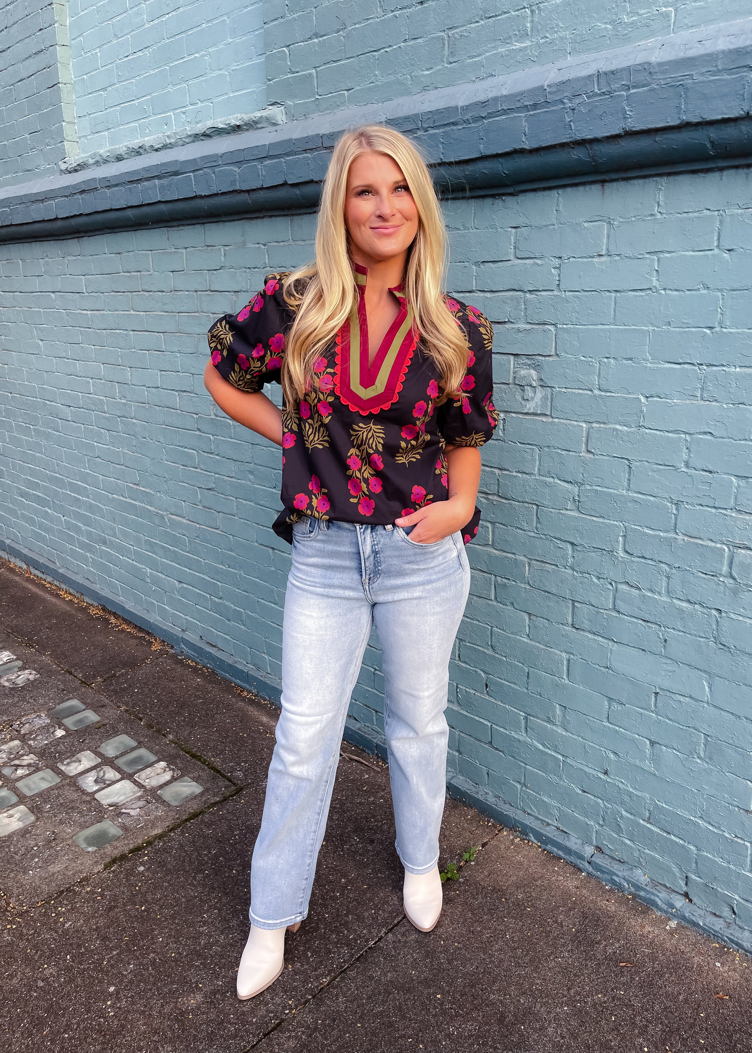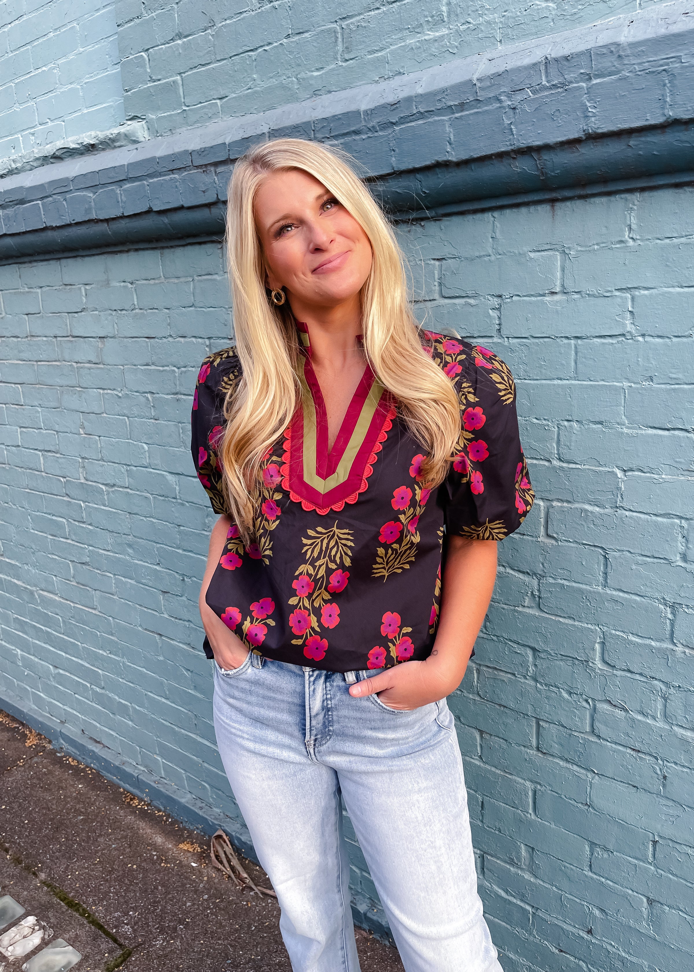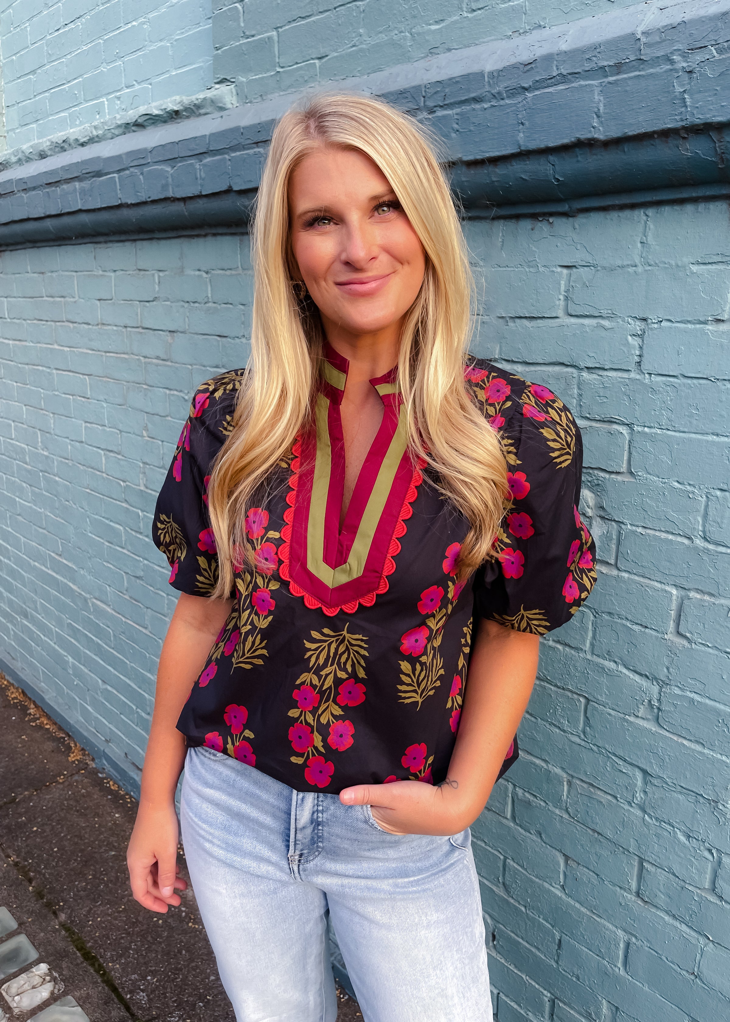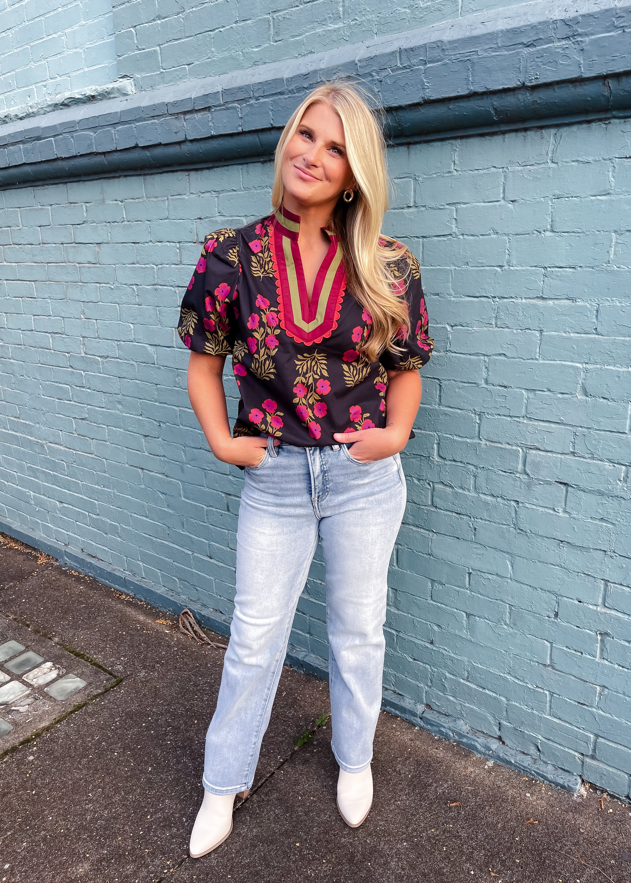 Elevate your wardrobe with the A Day Well Spent Top, featuring dramatic black puff sleeves for a stylish silhouette. The standout purple and green striped collar with a scalloped edge adds a unique touch, leading into a flattering V-neckline. Beautifully adorned with red and purple floral embroidery and lush greenery, this top brings subtle elegance to any outfit. Perfect for turning everyday moments into something special.