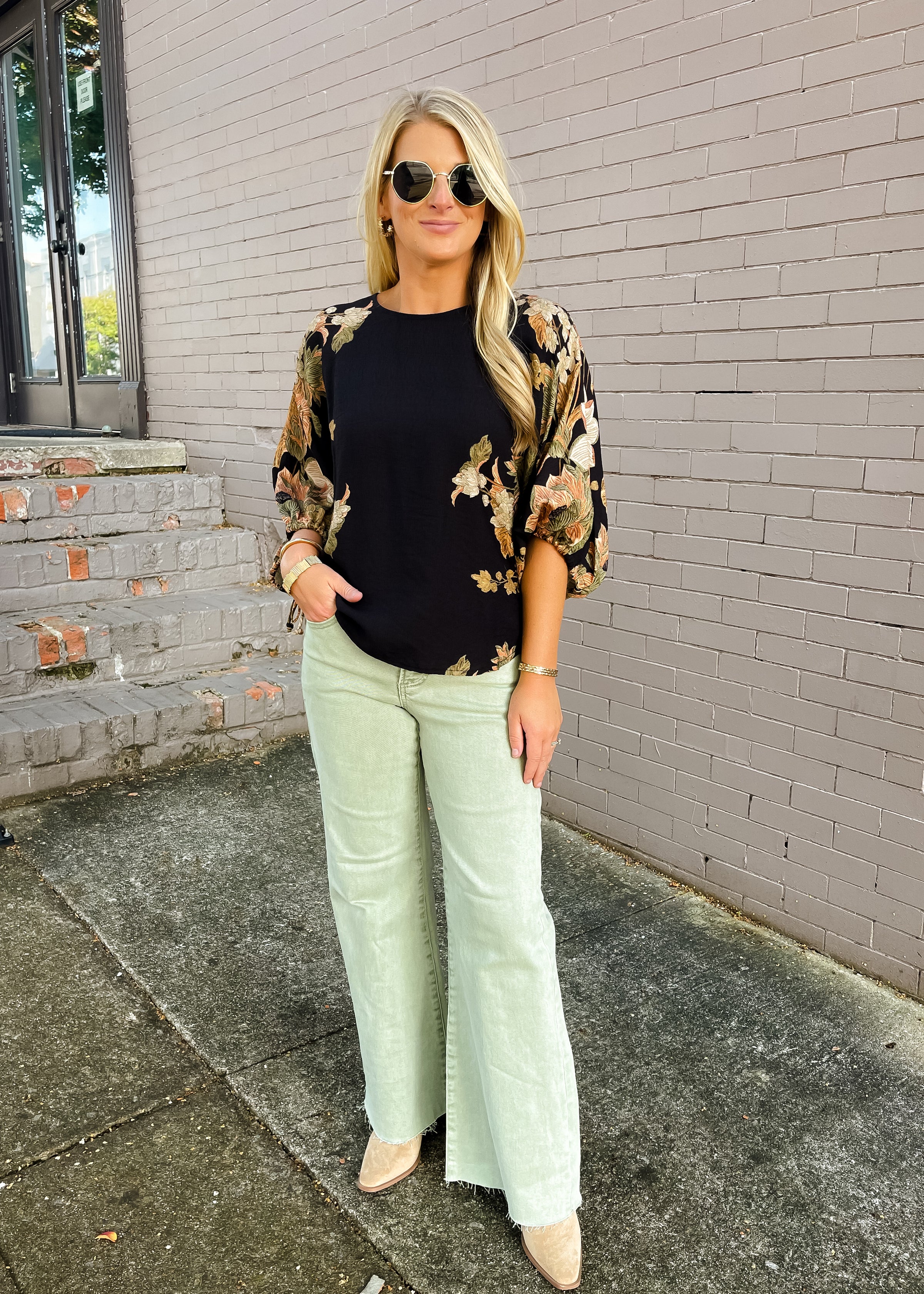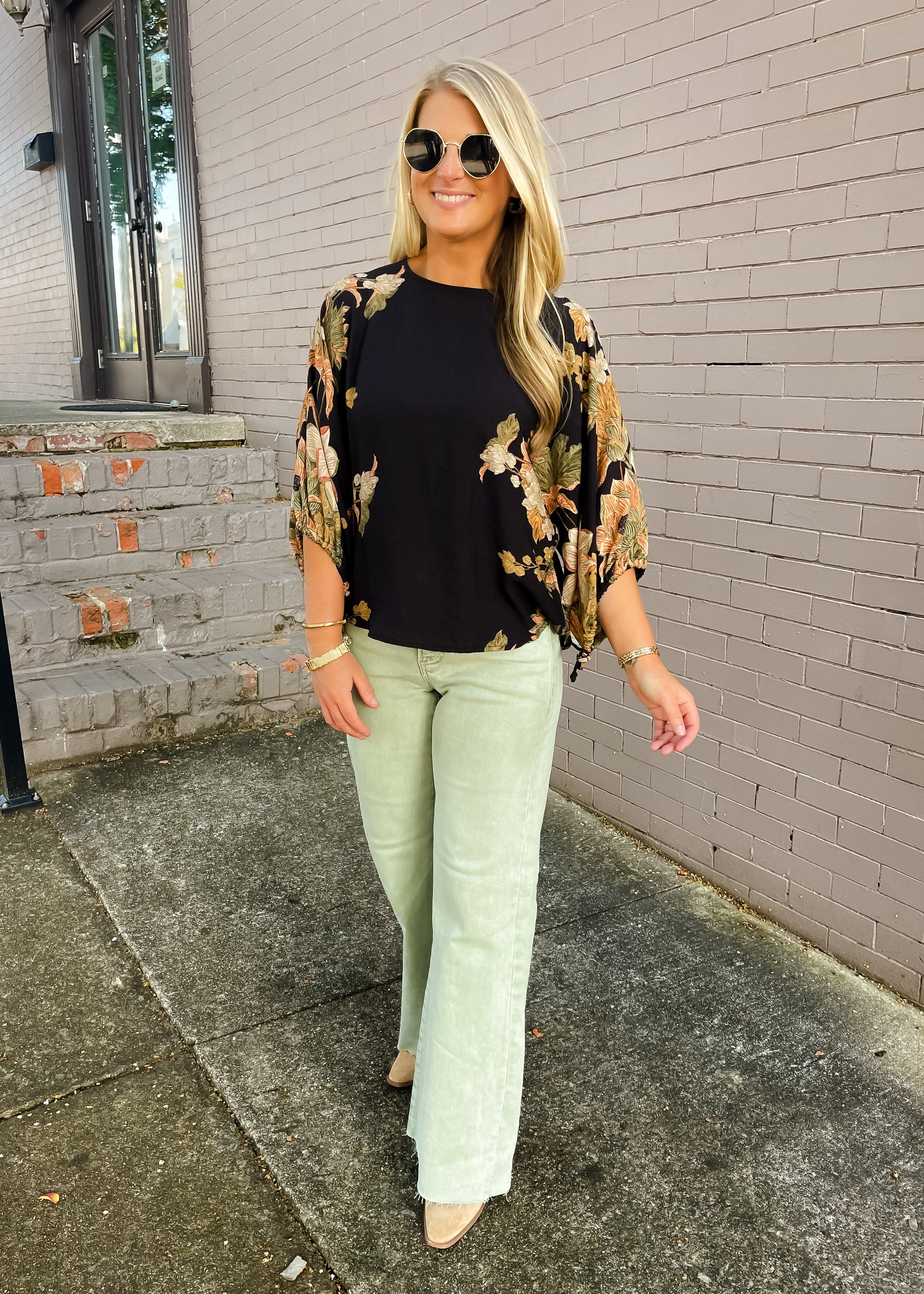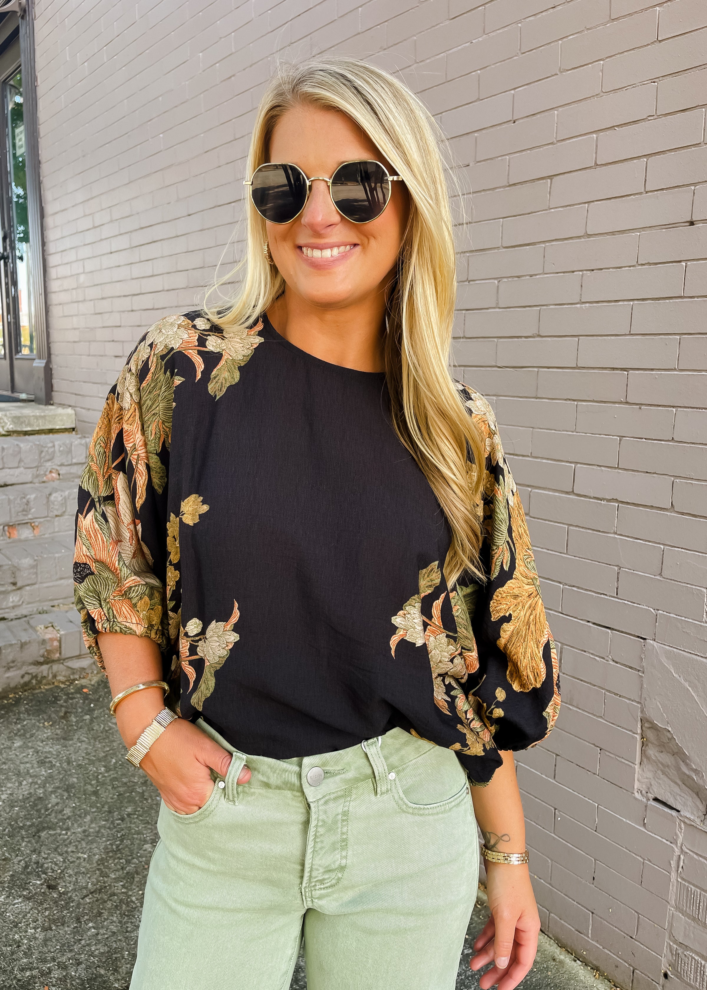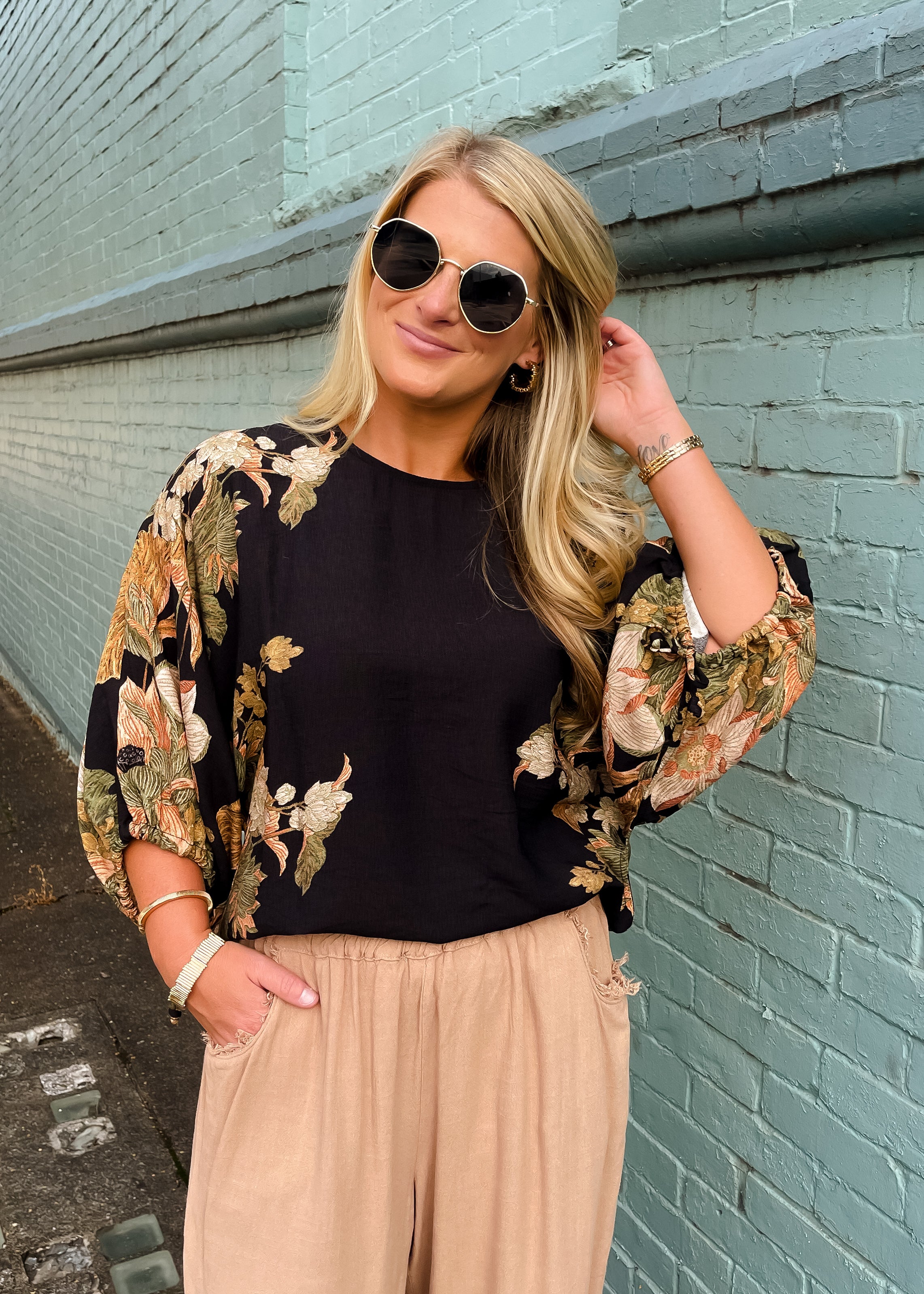 Discover the perfect balance of style and comfort with the Above And Beyond Top. Its sleek black fabric sets the stage for vibrant orange and green floral patterns, while the scoop neck and quarter-length sleeves with delicate tie details add a feminine touch. This top effortlessly enhances your everyday look, making it a versatile choice for any occasion where you want to feel confident and chic.