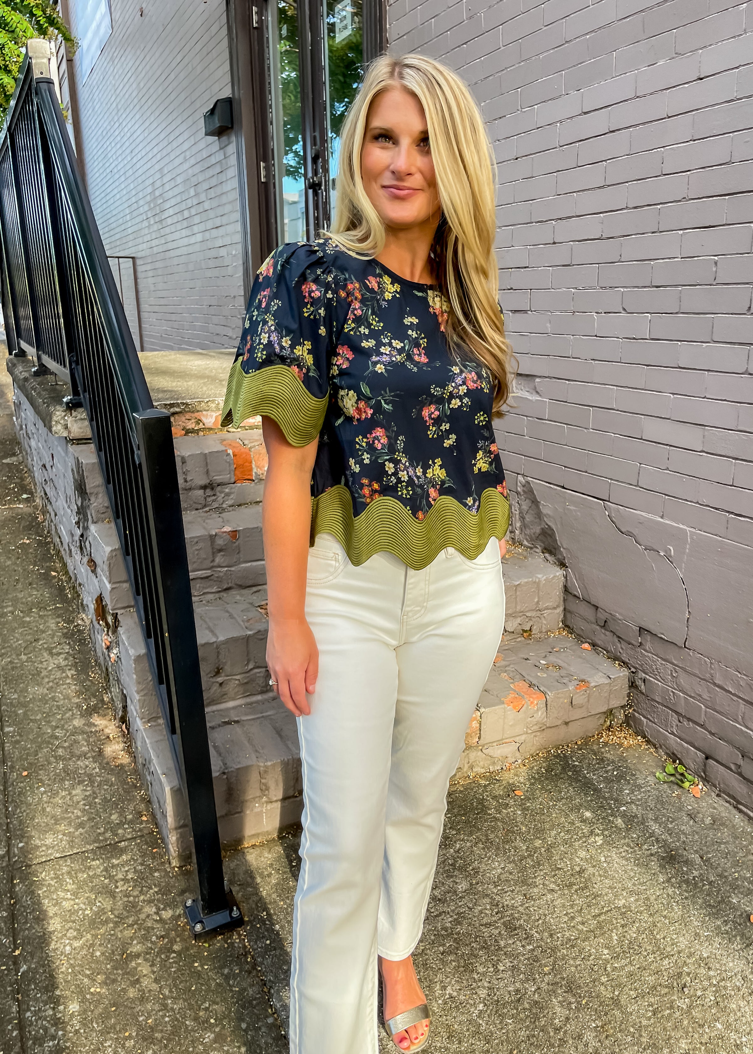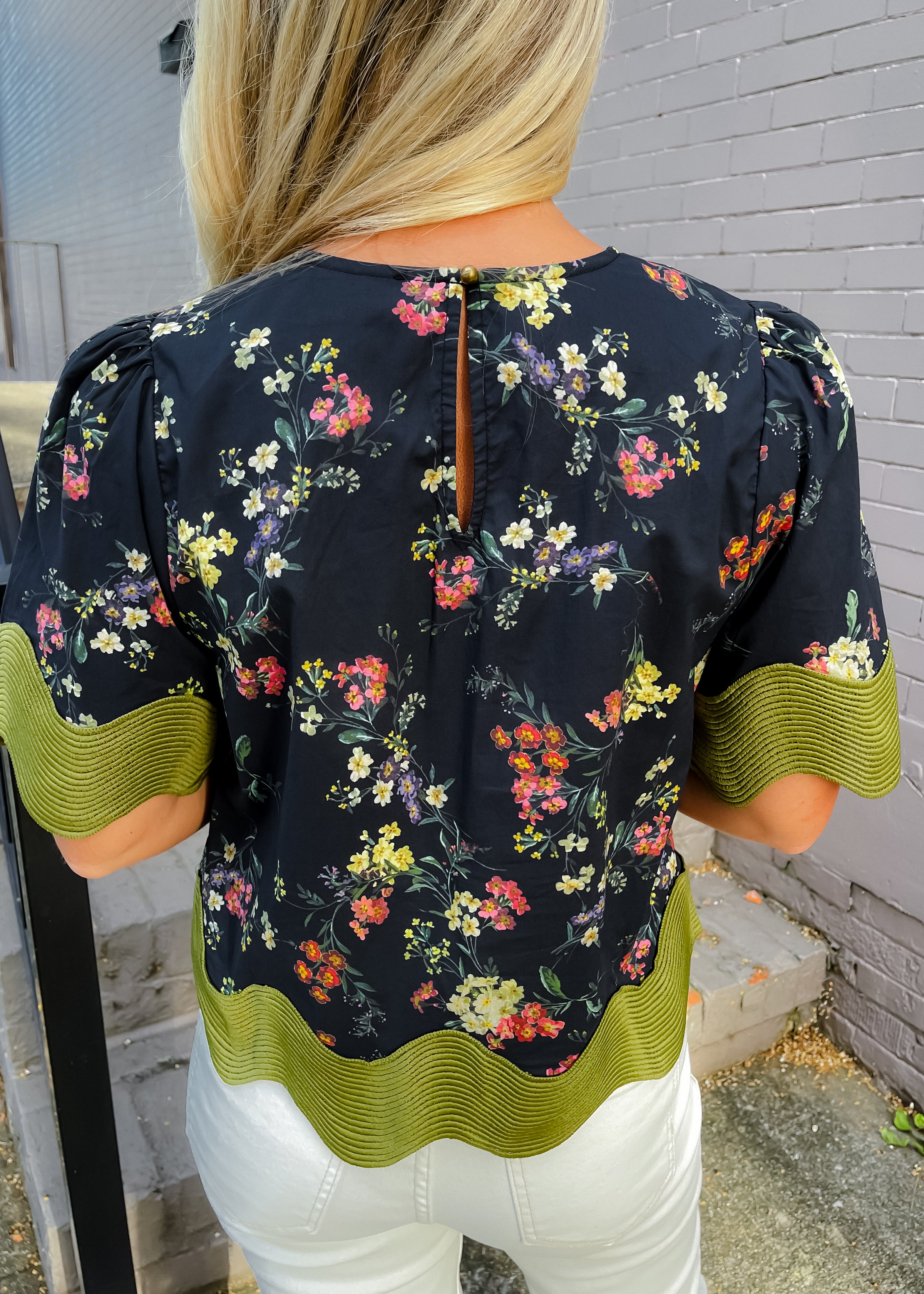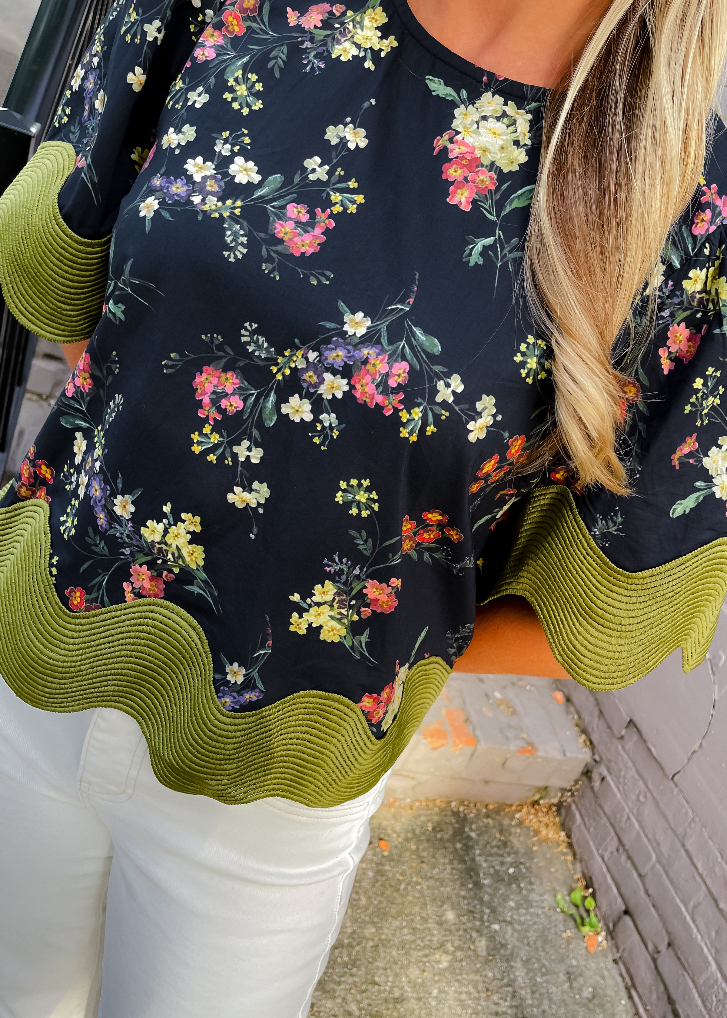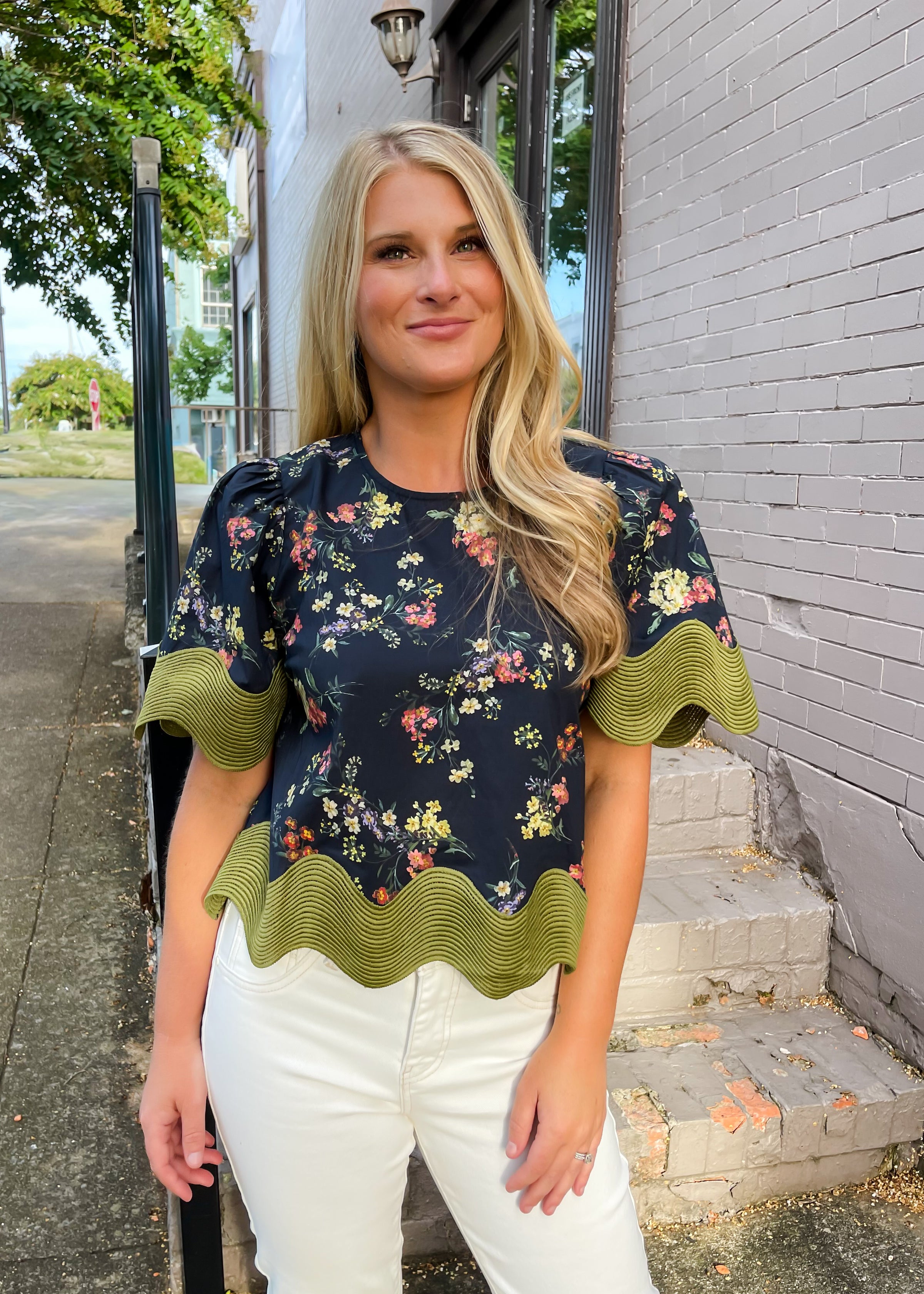 Elevate your wardrobe with the Call It What It Is Top, featuring a striking black base adorned with elegant Victorian-inspired florals. Its semi-cropped fit and softly puffed sleeves create a flattering silhouette, while the green swirly band accenting the sleeves and hem adds a unique, artistic touch. Perfect for making a bold statement, this top effortlessly blends classic charm with modern style.