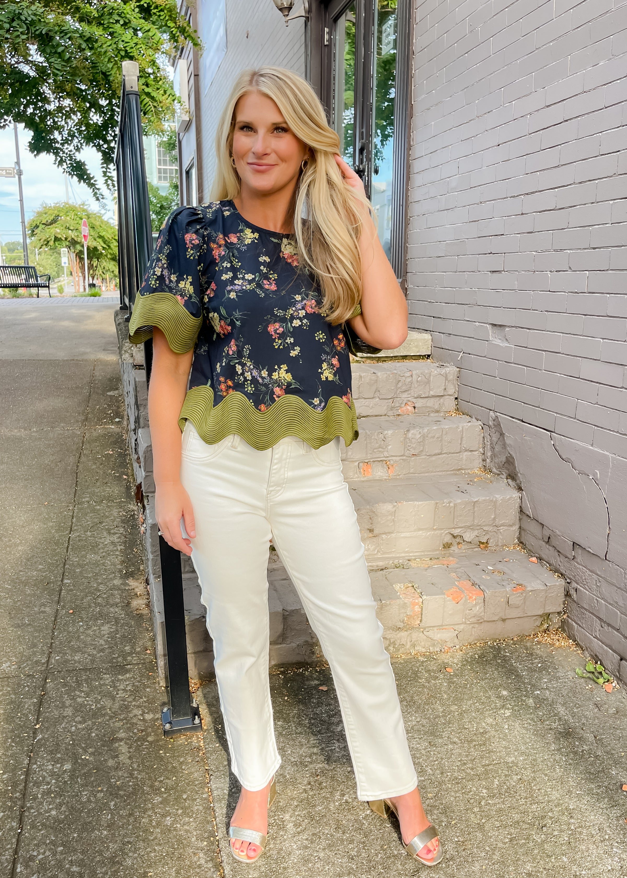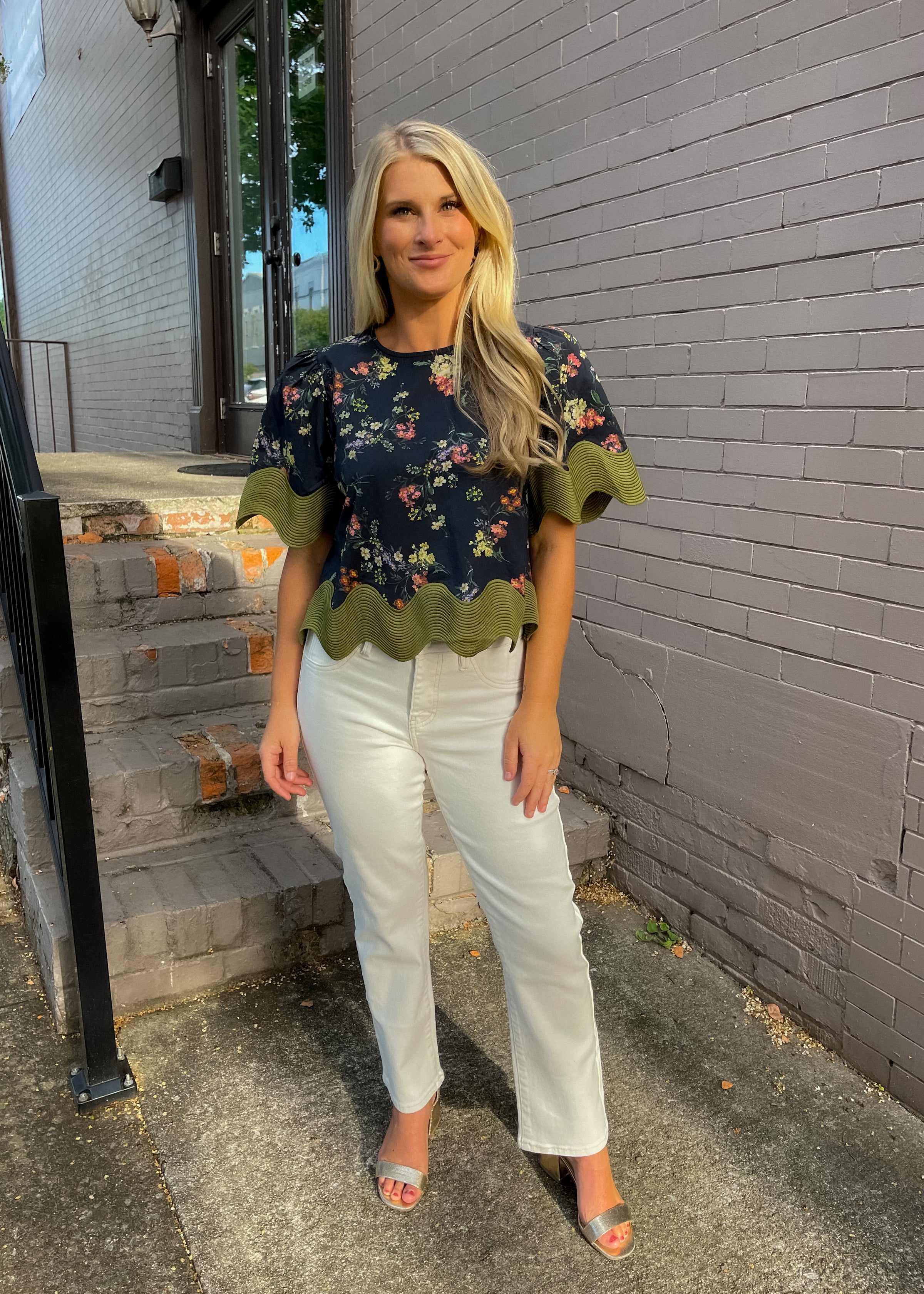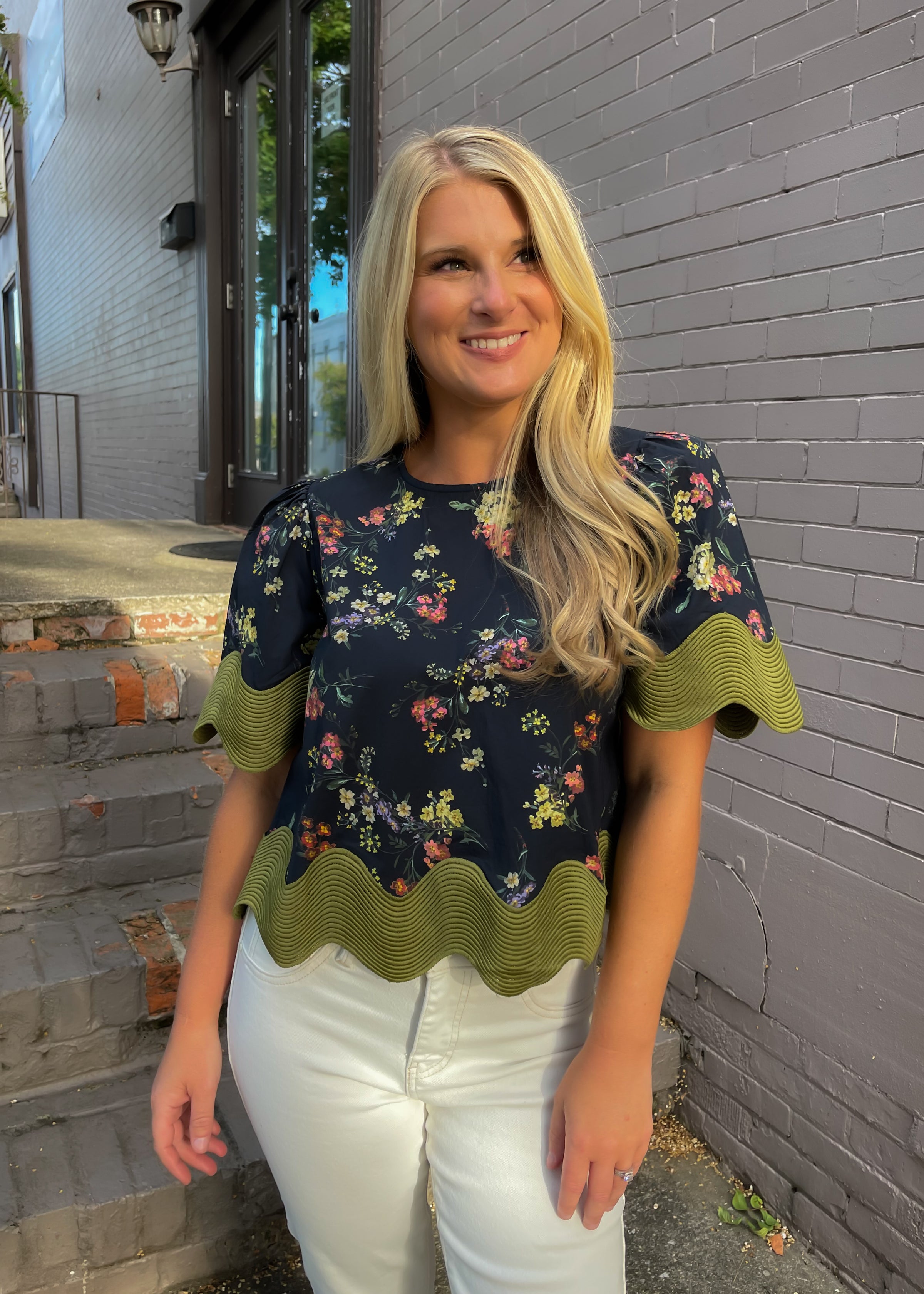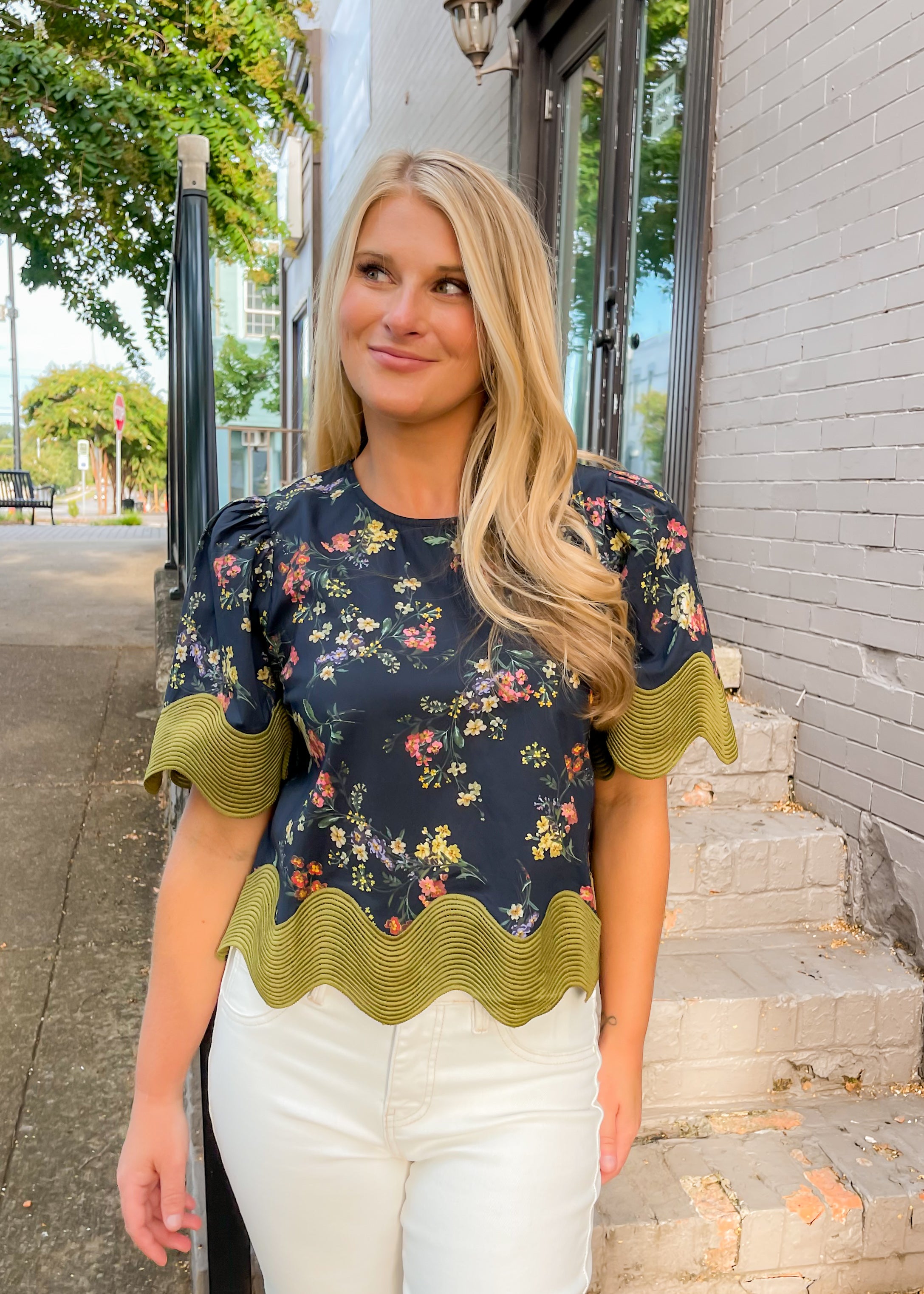 Elevate your wardrobe with the Call It What It Is Top, featuring a striking black base adorned with elegant Victorian-inspired florals. Its semi-cropped fit and softly puffed sleeves create a flattering silhouette, while the green swirly band accenting the sleeves and hem adds a unique, artistic touch. Perfect for making a bold statement, this top effortlessly blends classic charm with modern style.