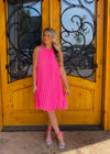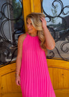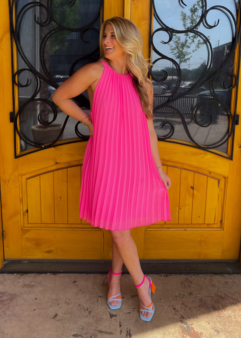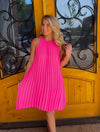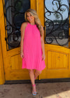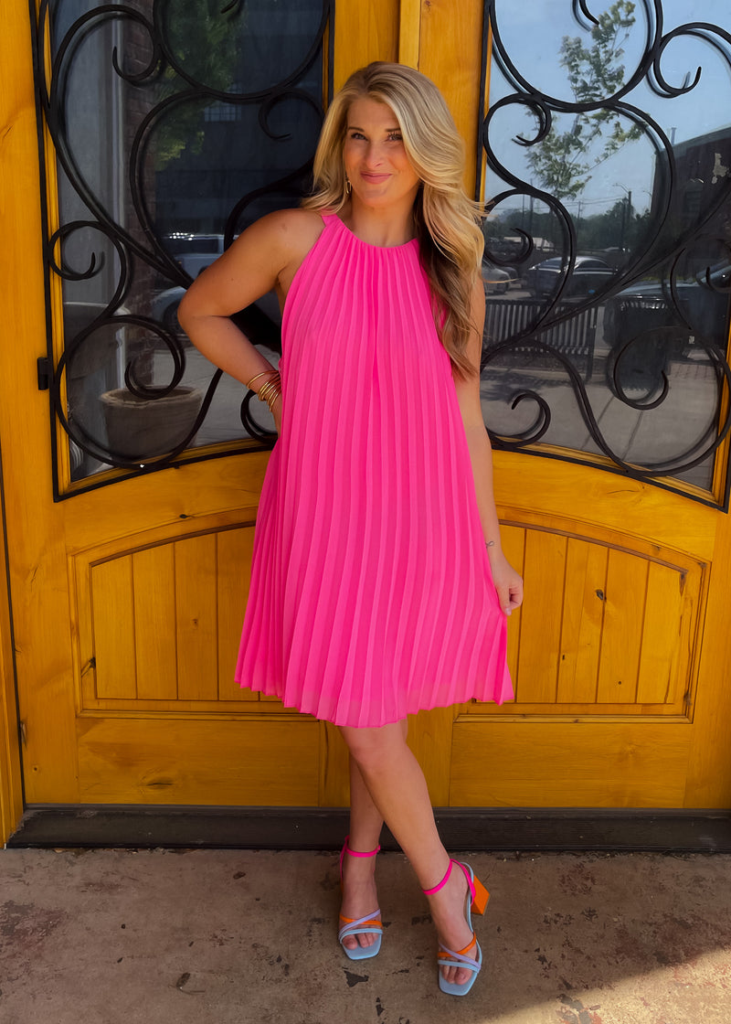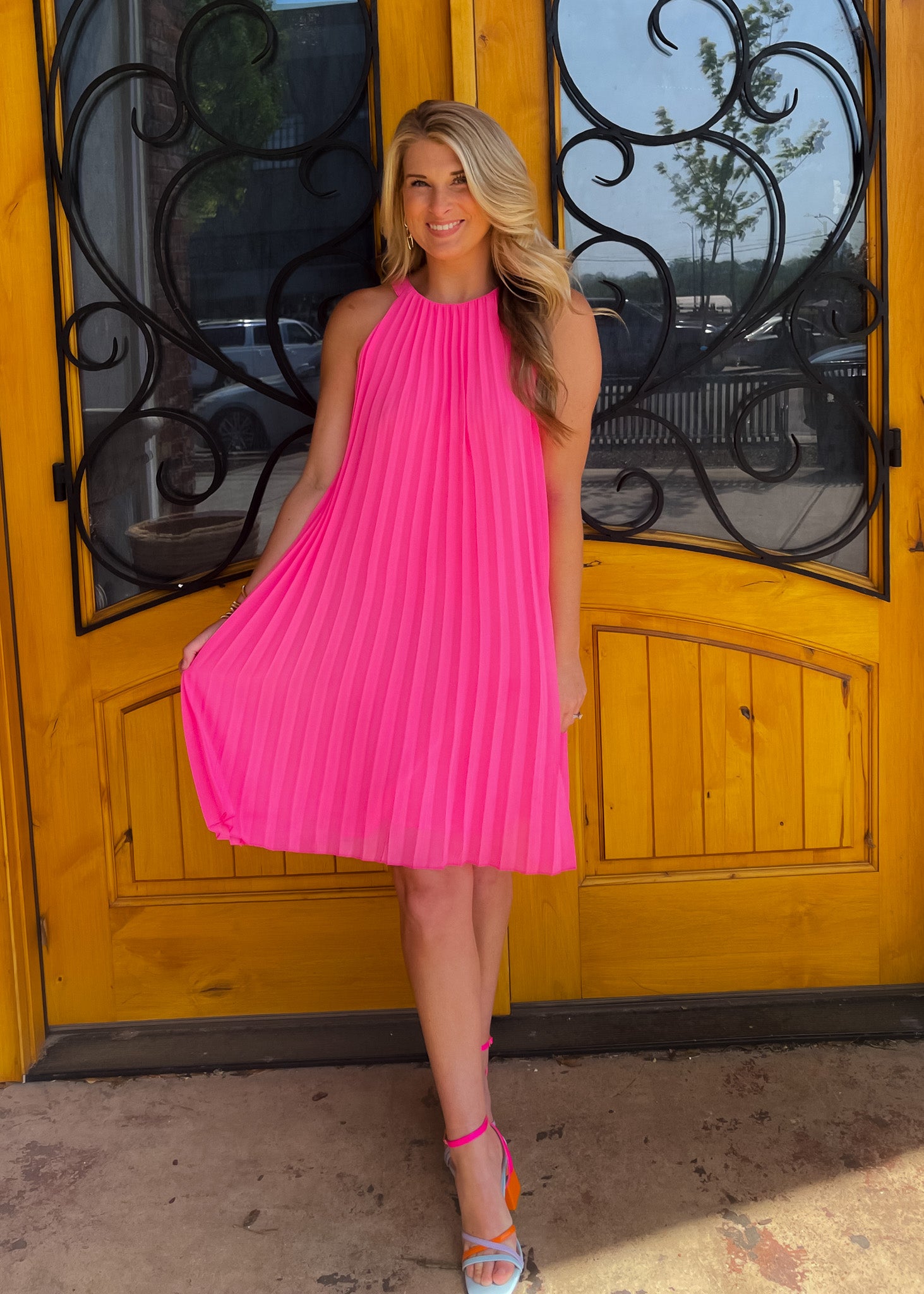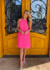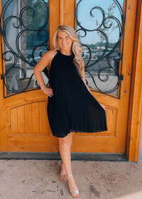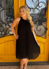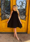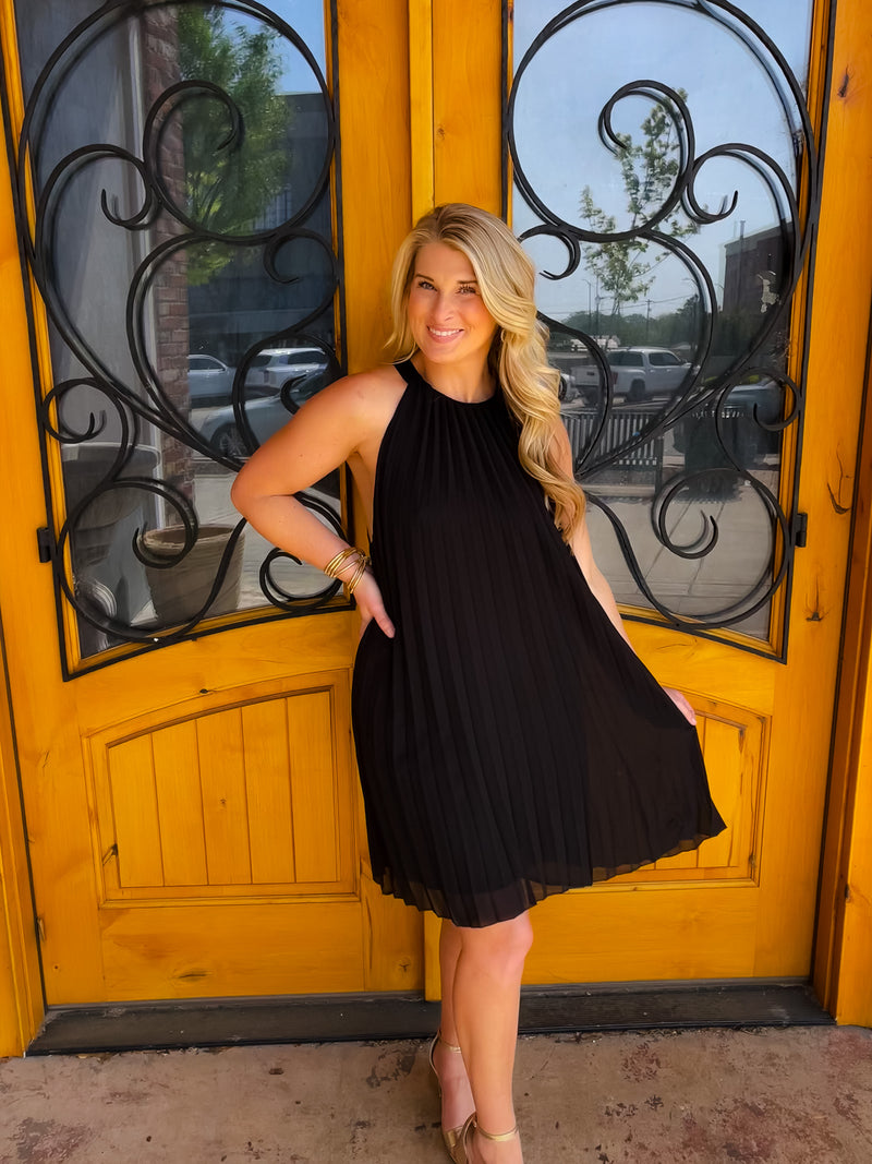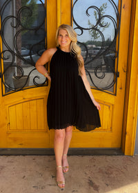 Make a statement in this Charming Dedications Dress. You'll be the life of the party with its sassy, sleeveless style, halter neck line, and flowy, pleated detail. Fully lined and ready to hottie it up, this eye-catching garment will turn heads wherever you go!
