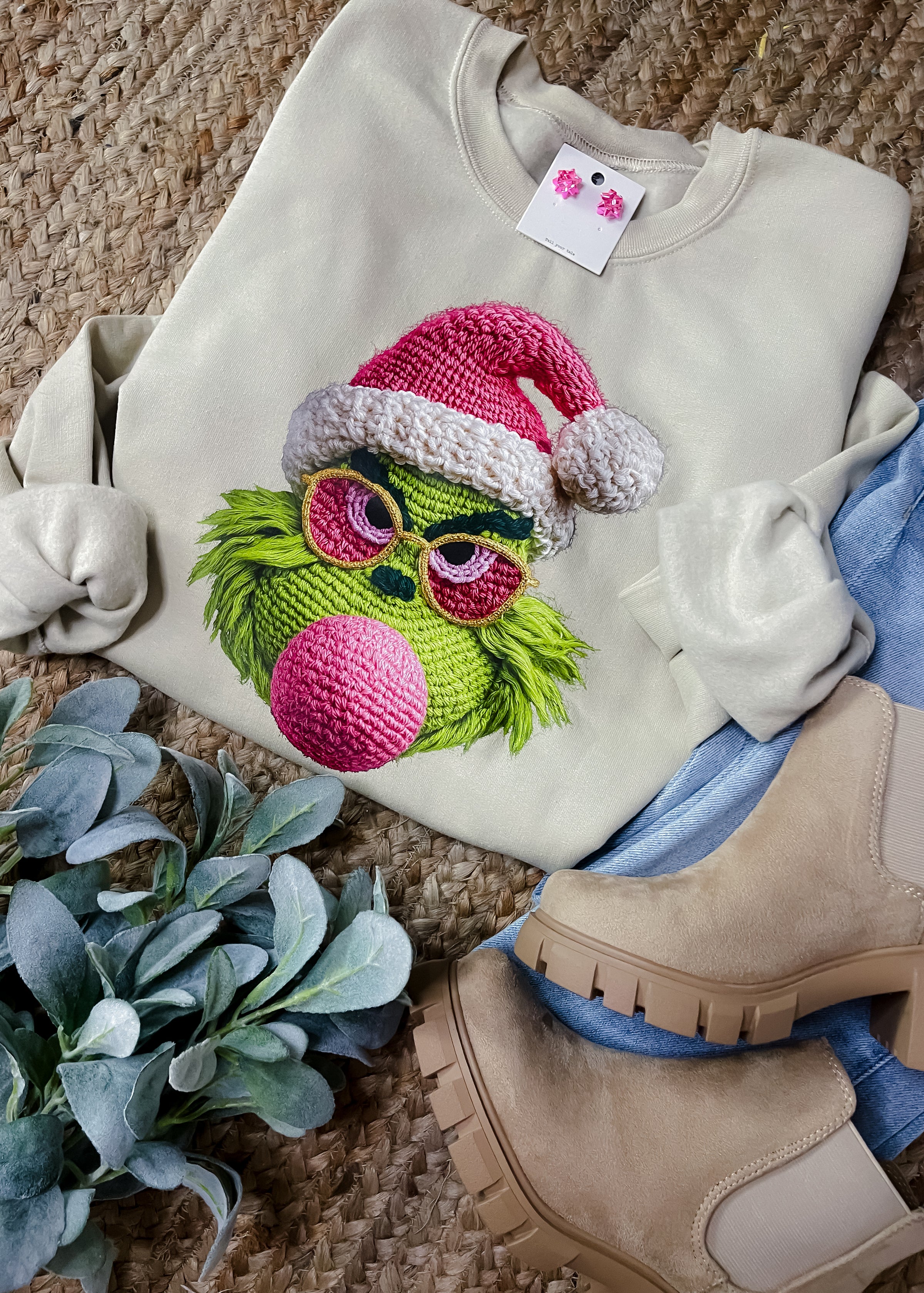 Stay cozy and stand out in our new faux Crochet Yarn Grinch Sweatshirt, featuring a playful tan design with a handcrafted Grinch head. This unique detail includes a pink Santa hat, bubble gum bubble, and stylish pink-lens glasses, adding fun and personality to your casual look. Available in sizes S-2XL, it’s perfect for those who love holiday cheer with a quirky twist.