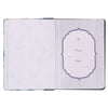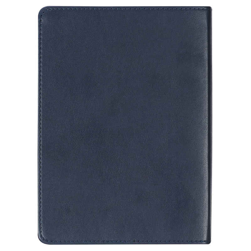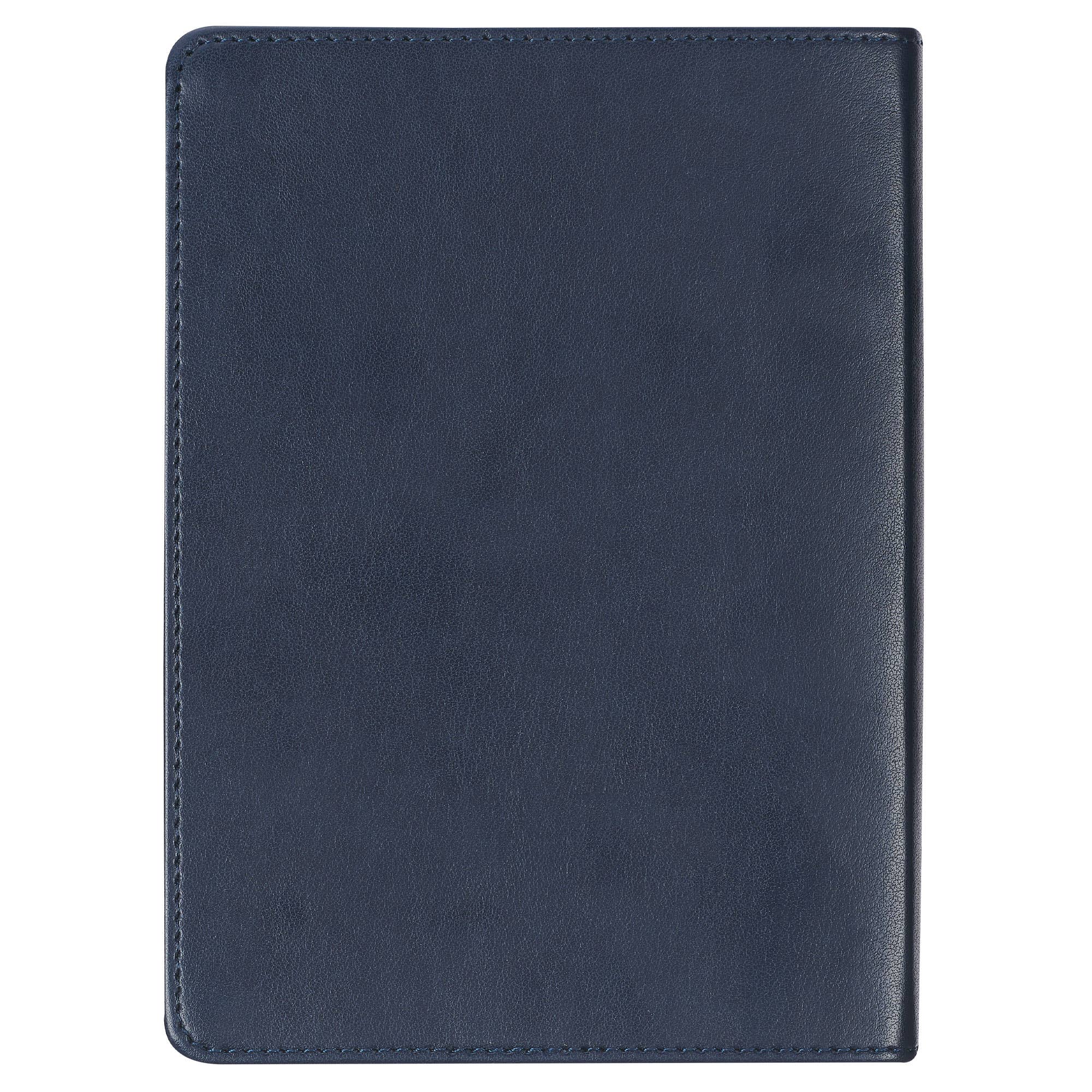 Blue and white rose screen-printed cover design, Navy blue faux leather cover, Gold foil accents, Navy title with gold-foiled outline, One-color interior, Ribbon marker, 365 devotions, 392 gilt-edged pages