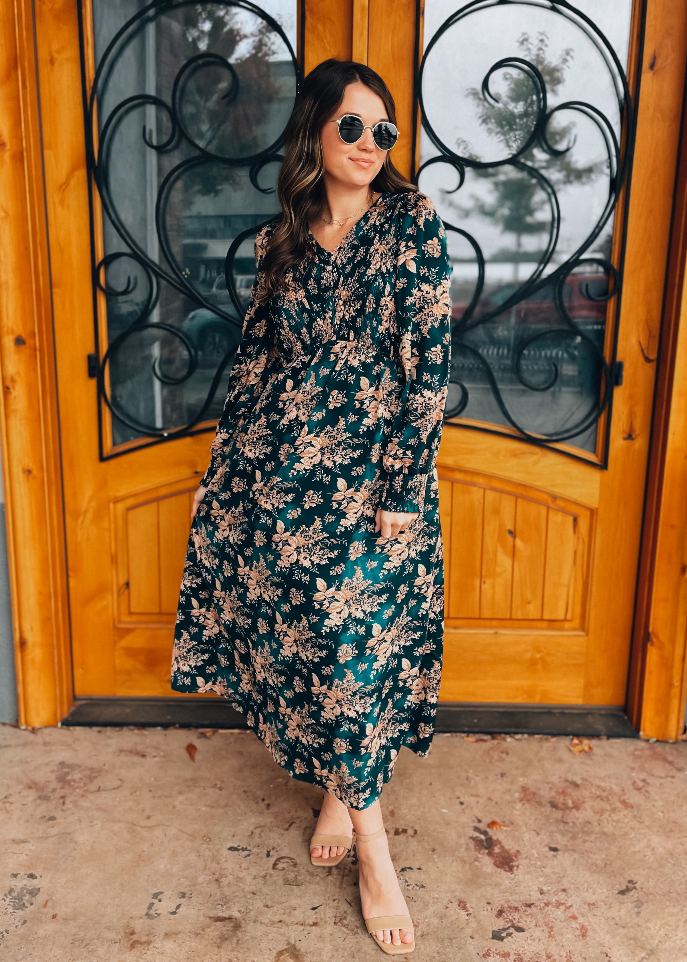 Discover the perfect mix of comfort and style with our Find The Answer Maxi Dress. Featuring a beautiful teal floral design with intricate taupe detailing, this maxi dress boasts a smocked top and V-neck for a flattering fit. Complete with long sleeves and smocked cuffs, it's the perfect addition to your wardrobe for any occasion.