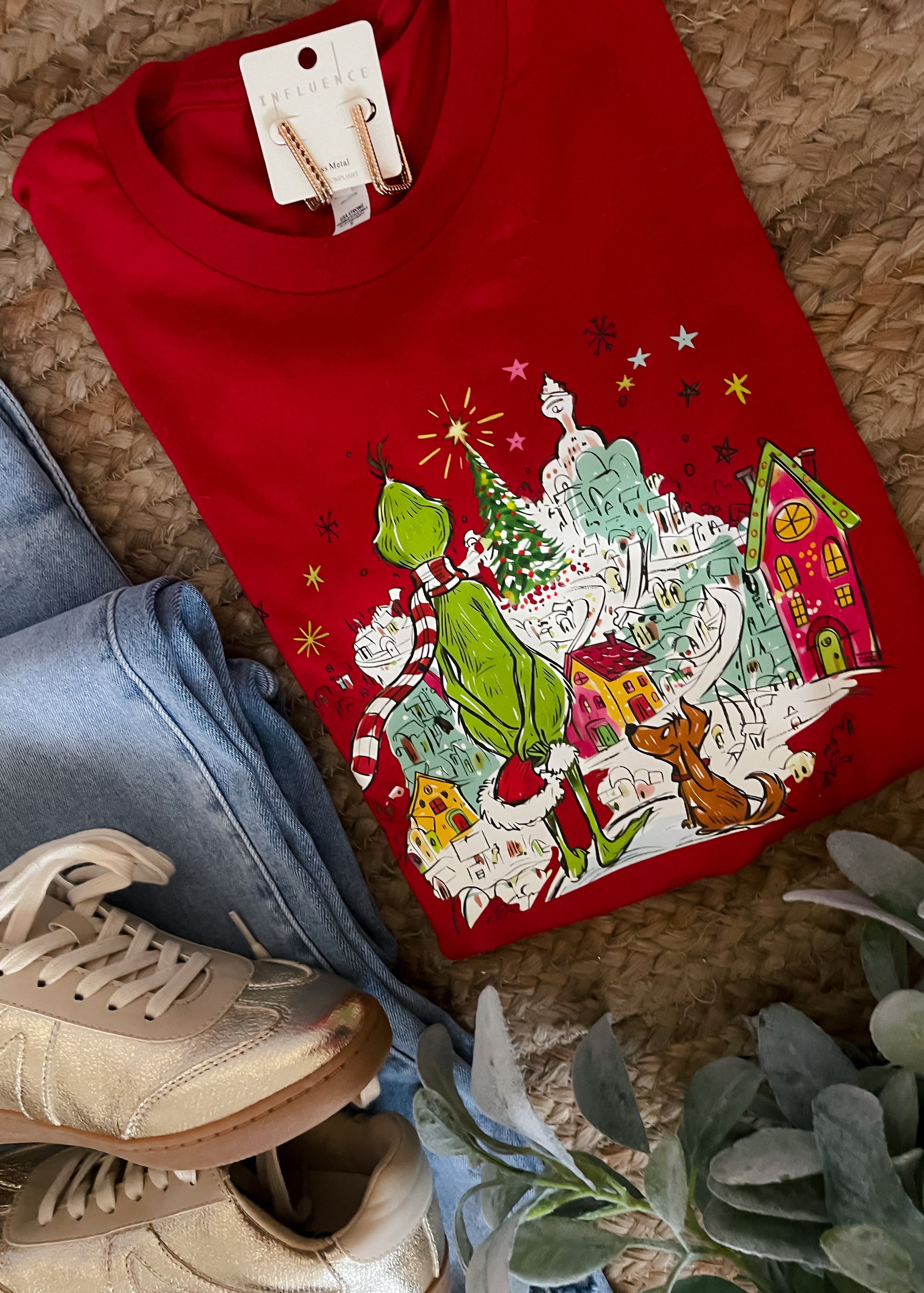 Bring holiday mischief to your wardrobe with this delightful graphic tee showcasing the Grinch and Max gazing over the charming landscape of Whoville. This short-sleeve design captures the magic of the beloved classic tale in vivid detail. Choose between rich red or soft mauve to match your personal style and seasonal mood. The comfortable, quality fabric makes it ideal for festive gatherings, cozy nights in, or spreading holiday cheer wherever you go. Available in sizes S-2XL, this tee is a must-have for fans of the Grinch and anyone seeking a playful twist on traditional holiday wear.