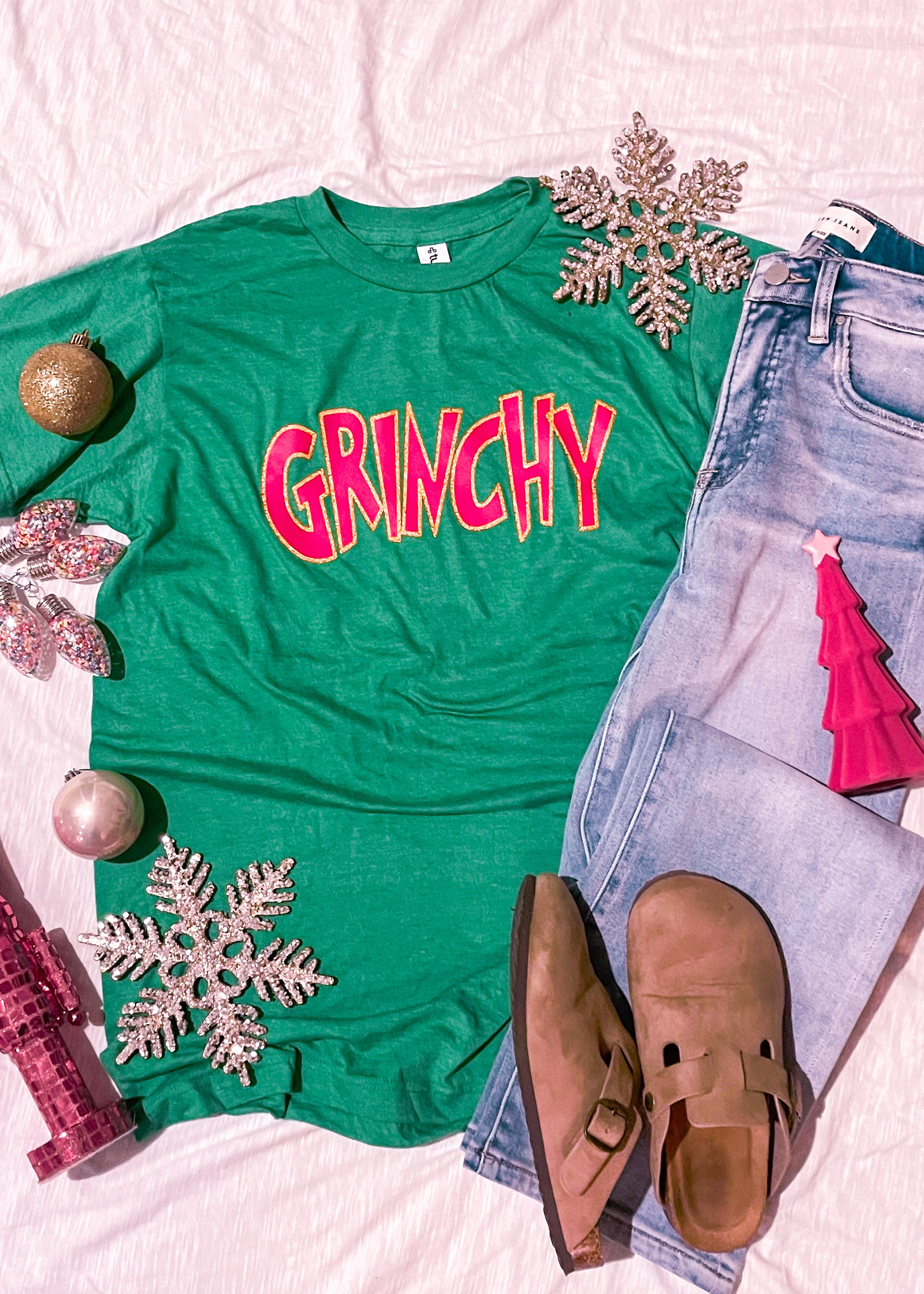 Show off your festive spirit with this green graphic tee featuring the word "Grinchy" in bold red, outlined with shimmering gold sparkle. The design uses the iconic font from the Grinch movie, adding a playful and nostalgic touch to your holiday wardrobe. Available in sizes S to 2XL, this shirt combines comfort and style for perfect seasonal cheer.