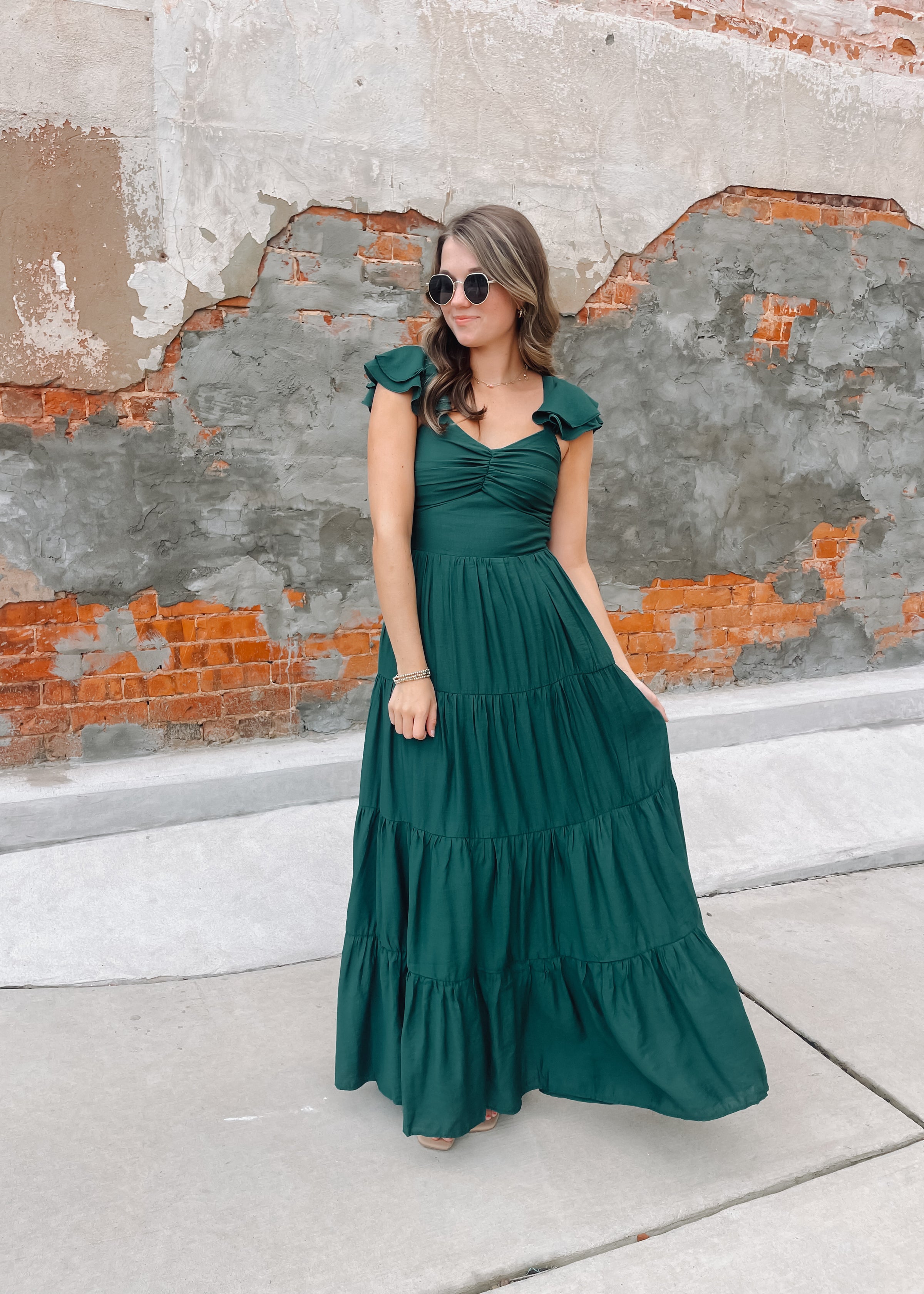 Embrace effortless elegance with the It's In The Books Maxi Dress. Crafted in a rich forest green woven fabric, this dress features a flattering cami top paired with layered short sleeves and a cinched front bodice that accentuates your silhouette. The tiered skirt adds graceful movement, while the back zipper closure ensures a perfect fit. Ideal for any occasion, this maxi dress combines comfort and style to keep you looking polished all day or night.