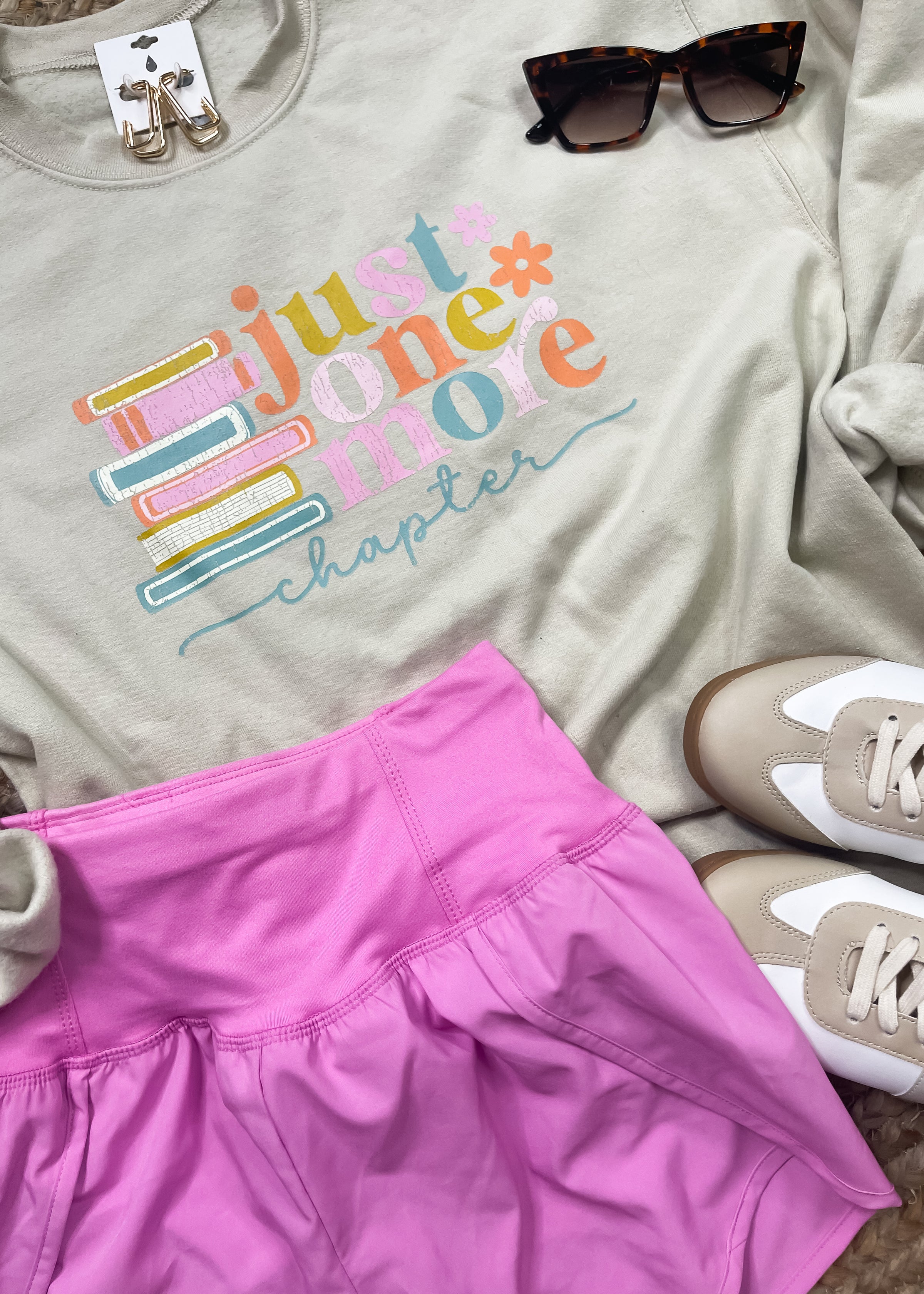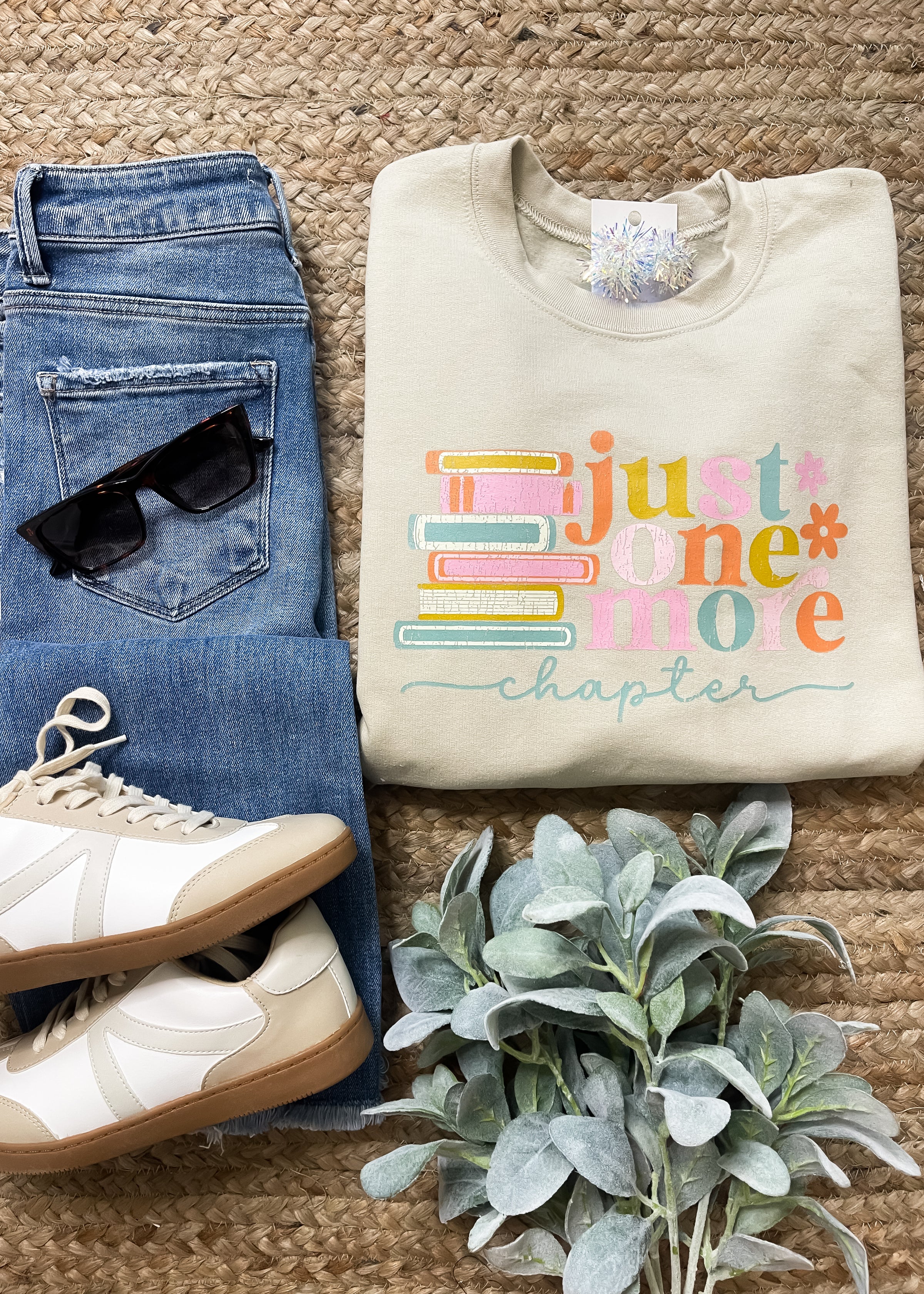 Stay cozy and stylish with this tan crewneck sweatshirt, featuring a charming pastel book design in pink, yellow, and blue. The uplifting phrase "just one more chapter" adds a playful touch for book lovers. Perfect for lounging or casual outings, it combines comfort with a subtle nod to your love of reading. Available in sizes S to 2XL, it’s an ideal gift or wardrobe staple for anyone who can’t resist turning the page.
