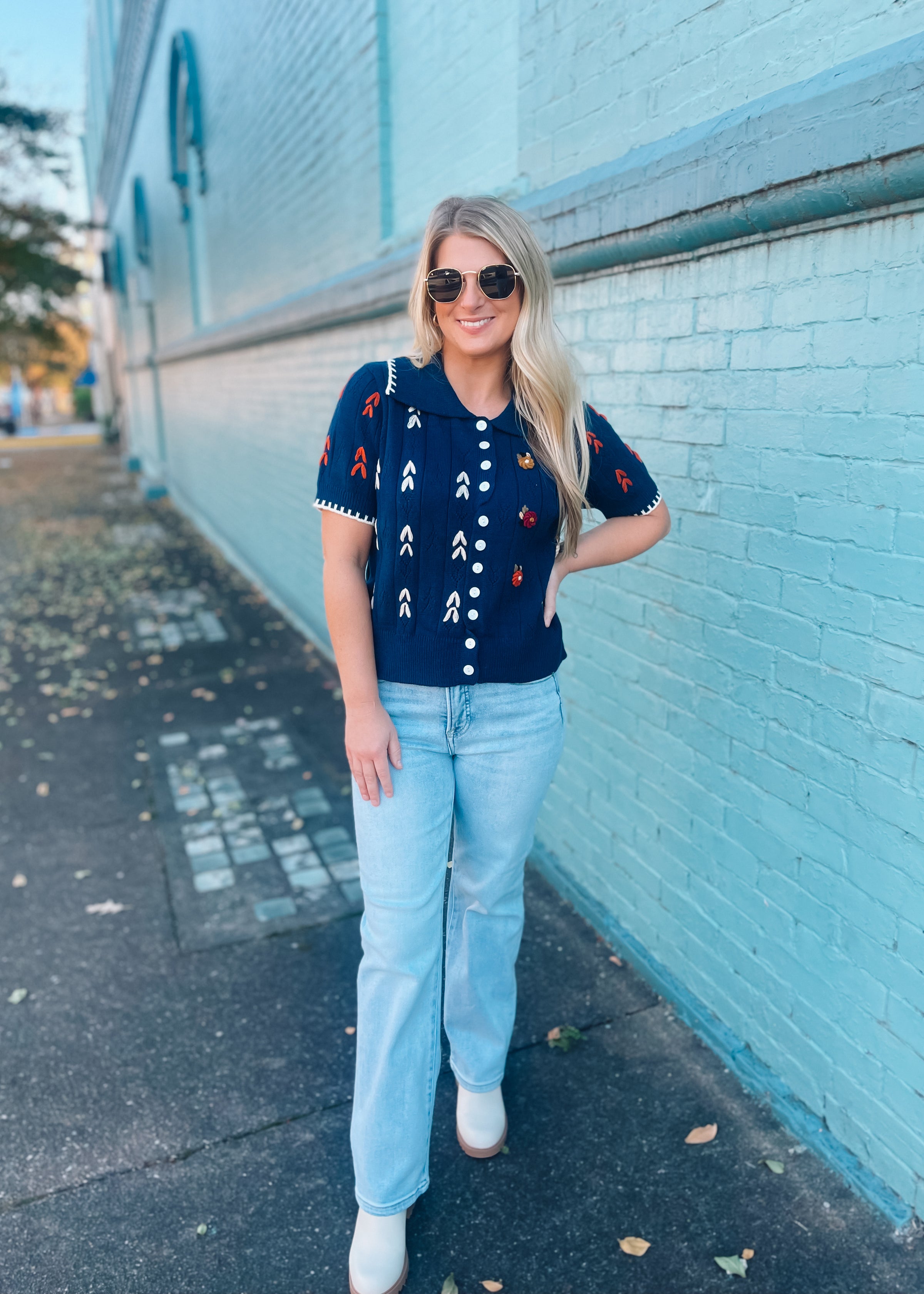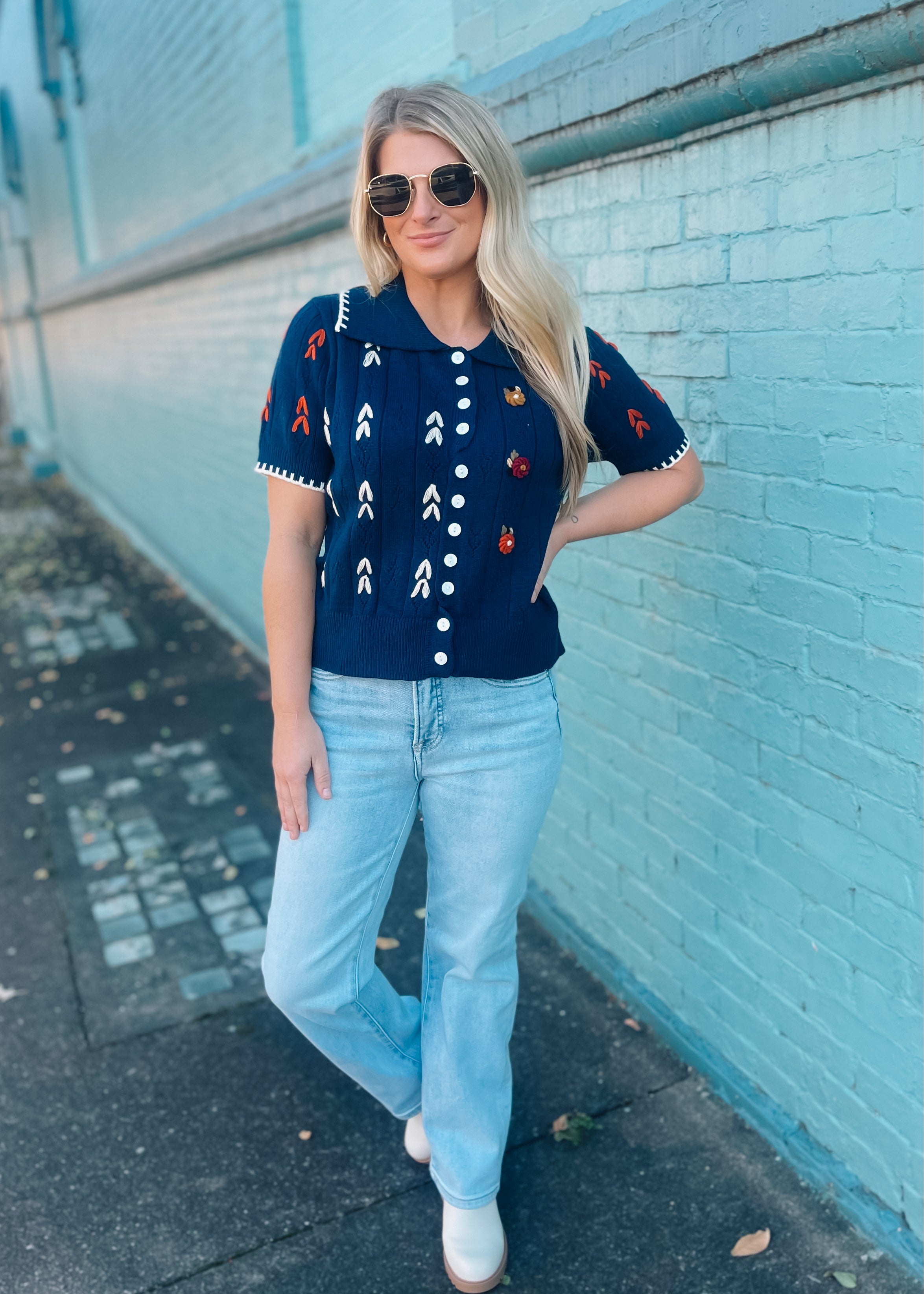 This charming short sleeve knit sweater combines timeless style with eye-catching details. Featuring a classic collar and cuffs trimmed in crisp white stitching, it showcases a unique button-up front with a playful criss-cross design. The piece is adorned with delicate embroidered florals in cream, orange, and black throughout, adding personality and visual interest. Perfect for layering or wearing solo, this navy sweater brings sophistication and whimsy to any wardrobe. An effortless way to elevate your everyday look with artisanal charm.