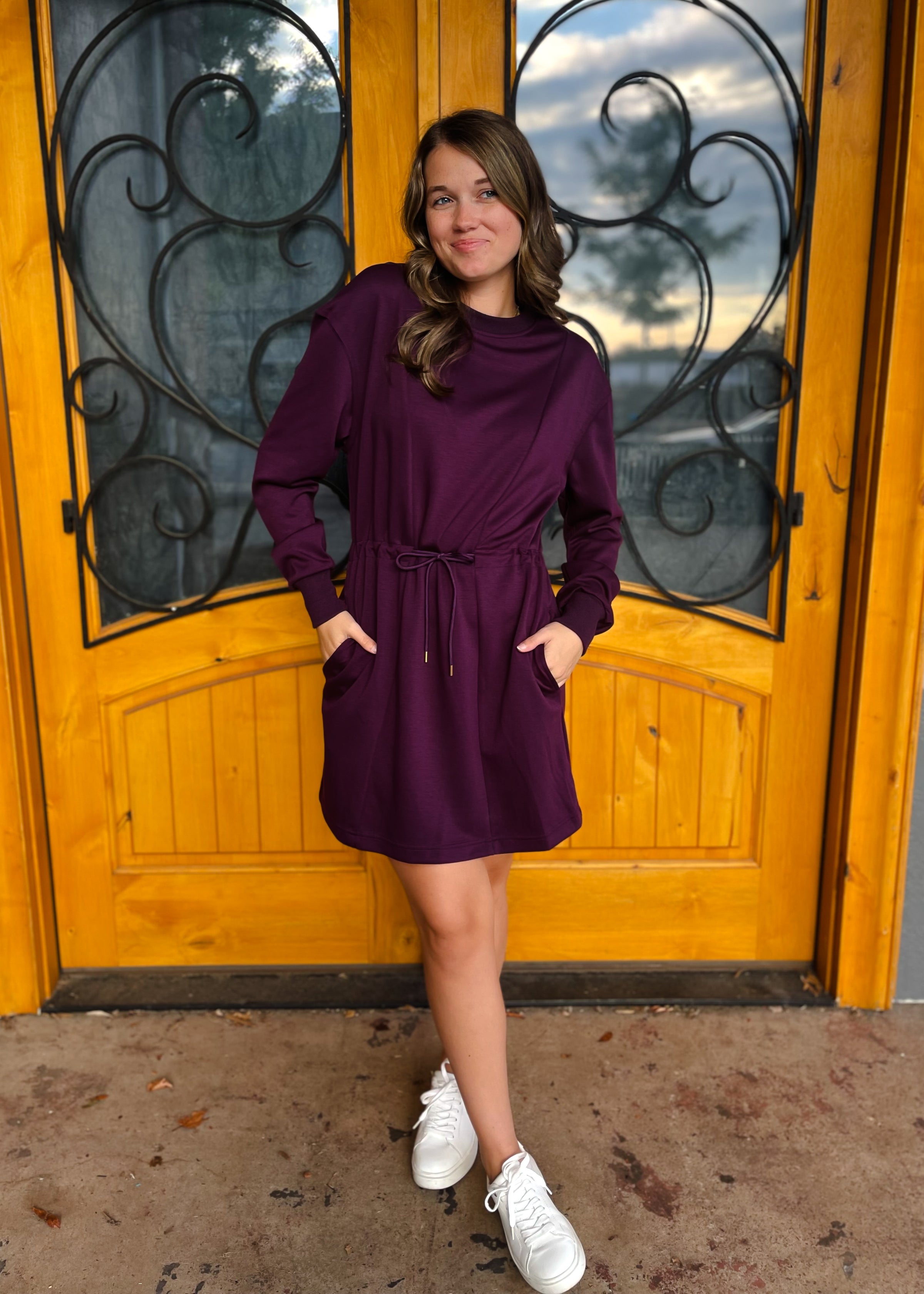 Elevate your active wardrobe with the Let Her Be Herself Dress, crafted from smooth plum-colored scuba fabric. This long-sleeve athletic dress offers a flattering silhouette enhanced by adjustable waist cinchers, allowing you to personalize your fit for all-day comfort and style. Perfect for effortless transitions from workouts to casual outings, it combines sleek performance with a feminine edge. Embrace your unique spirit while feeling confident and comfortable wherever your day takes you.