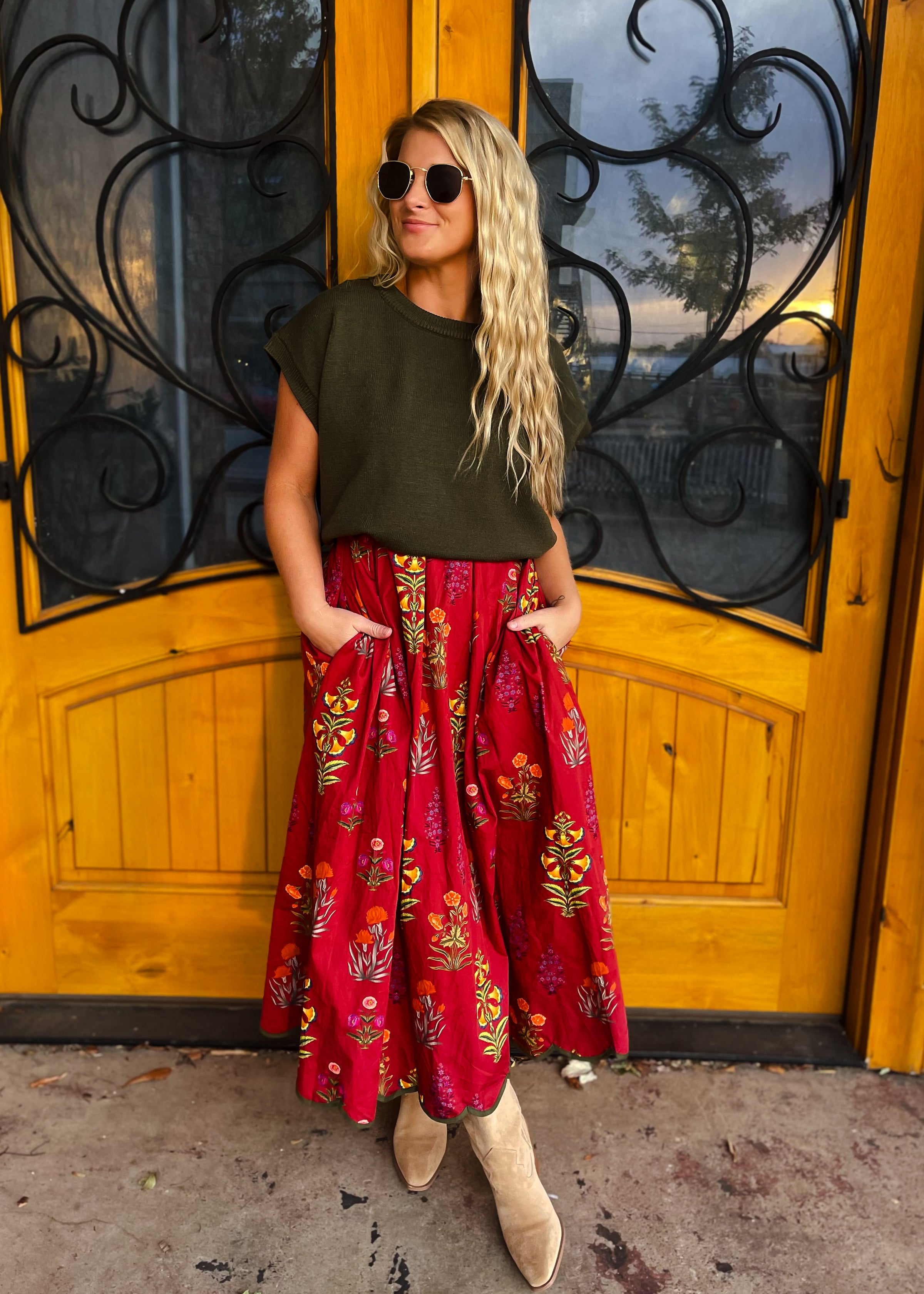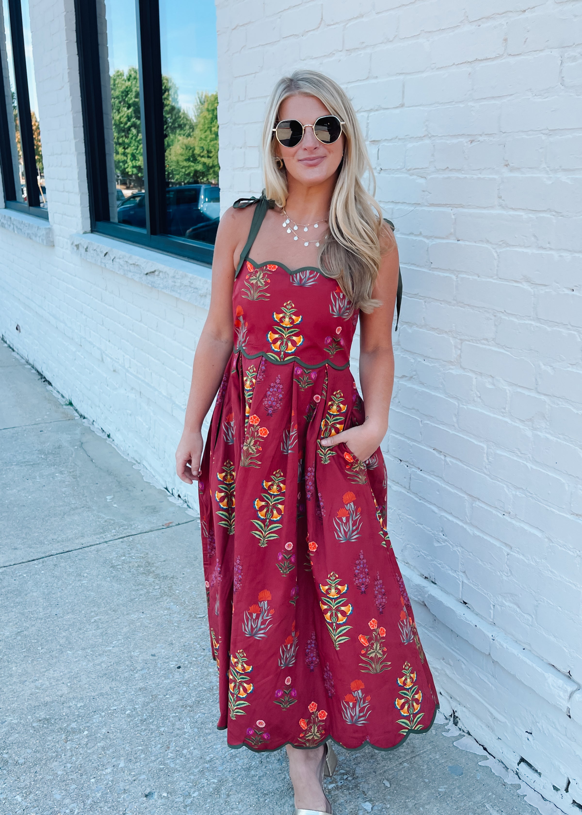 Elevate your wardrobe with the Live A Little Midi Dress, featuring adjustable tie straps for a perfect fit and a flattering smocked back. The wine-colored fabric is adorned with vibrant yellow, green, orange, and purple florals, contrasted beautifully by dark green scalloped trim and accents. This lined dress offers comfort and style with practical pockets and a distinctive separated top and skirt design highlighted by a delicate line. Perfect for any occasion, it effortlessly blends feminine charm with thoughtful details.