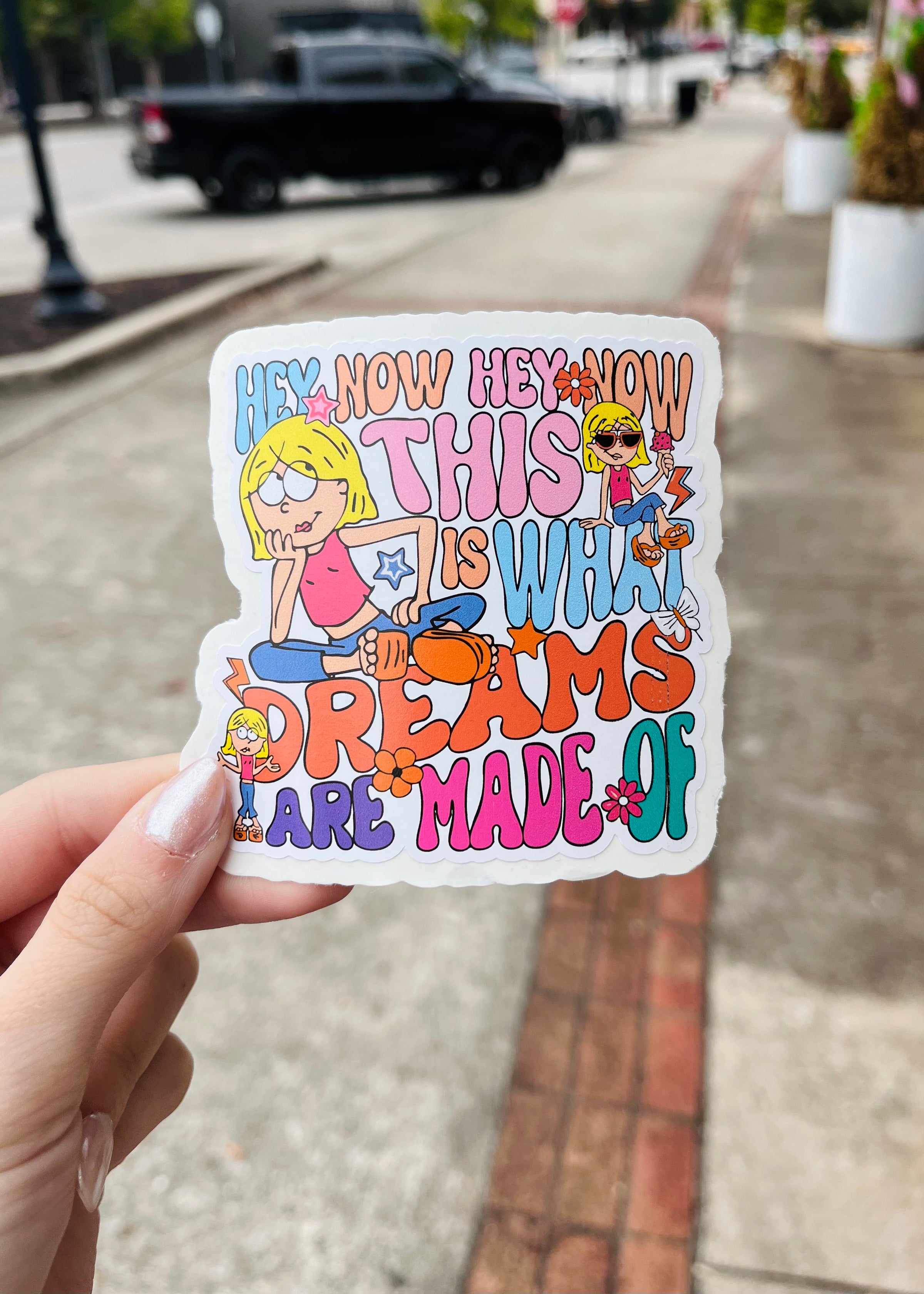 Celebrate your favorite childhood icon with the Lizzie McGuire Sticker! Featuring vibrant, colorful letters spelling out "Hey now, hey now, this is what dreams are made of," this sticker bursts with charm. Adorned with playful flowers, butterflies, stars, and lightning bolts, it adds a whimsical touch to any surface. Plus, the cartoon version of Lizzie McGuire appears in three dynamic poses, capturing her fun and spirited personality. Perfect for personalizing laptops, notebooks, or phone cases, this sticker brings nostalgia and style wherever you stick it.