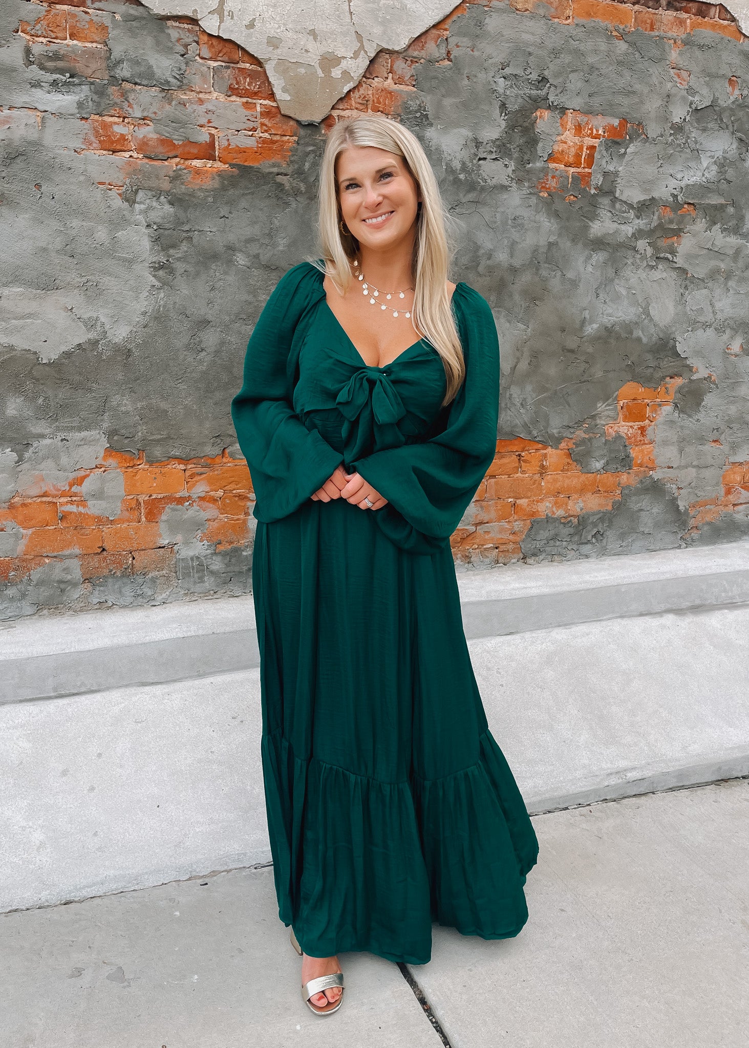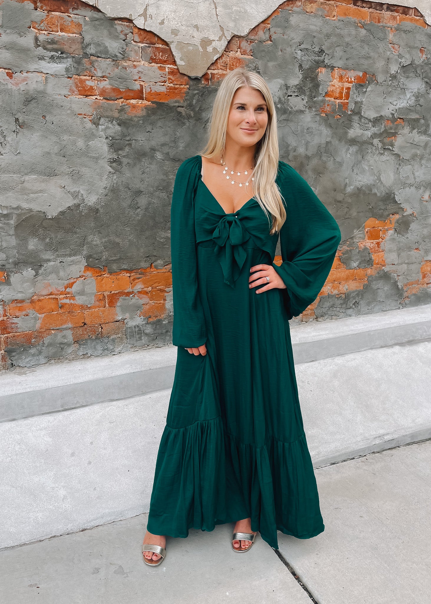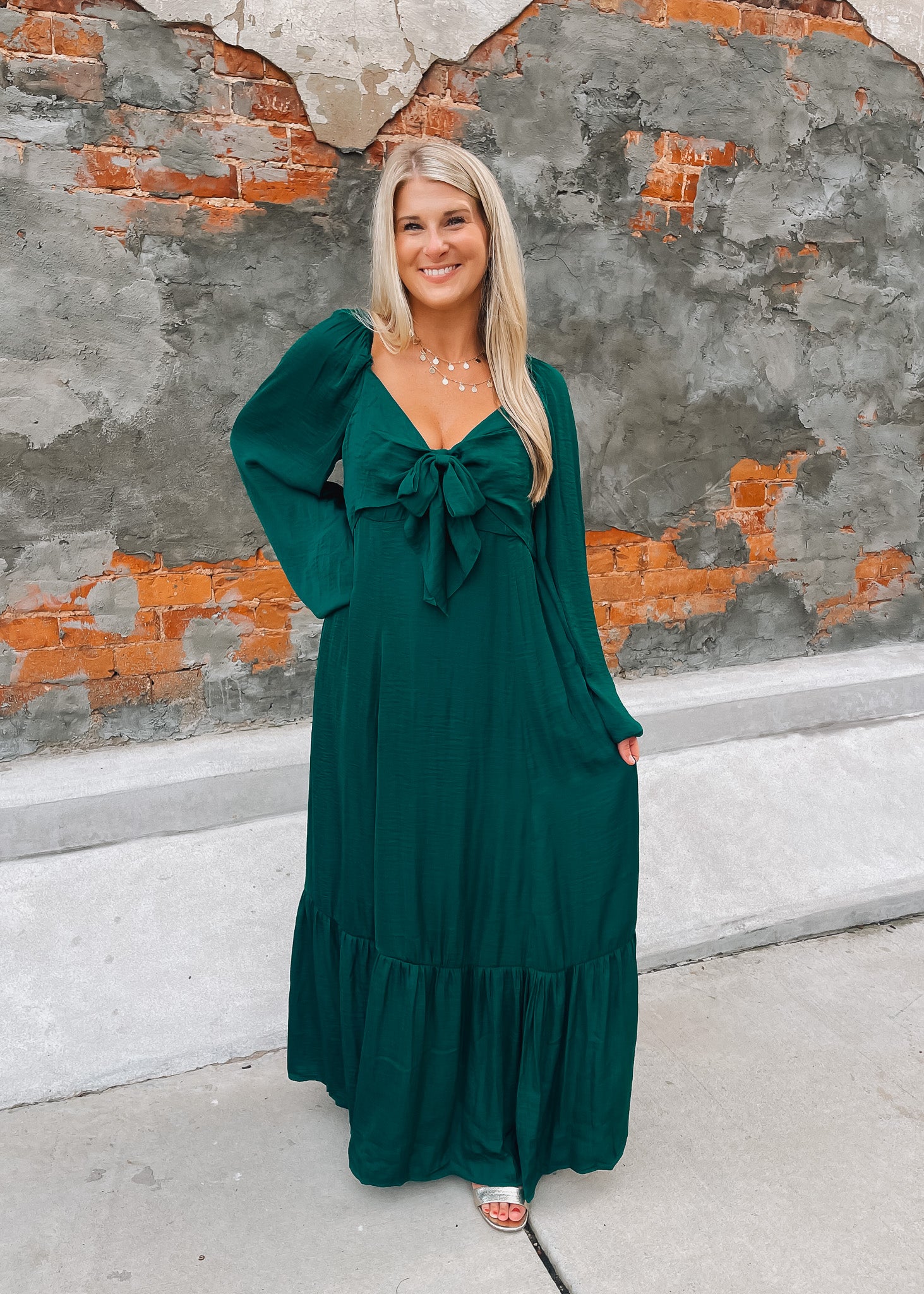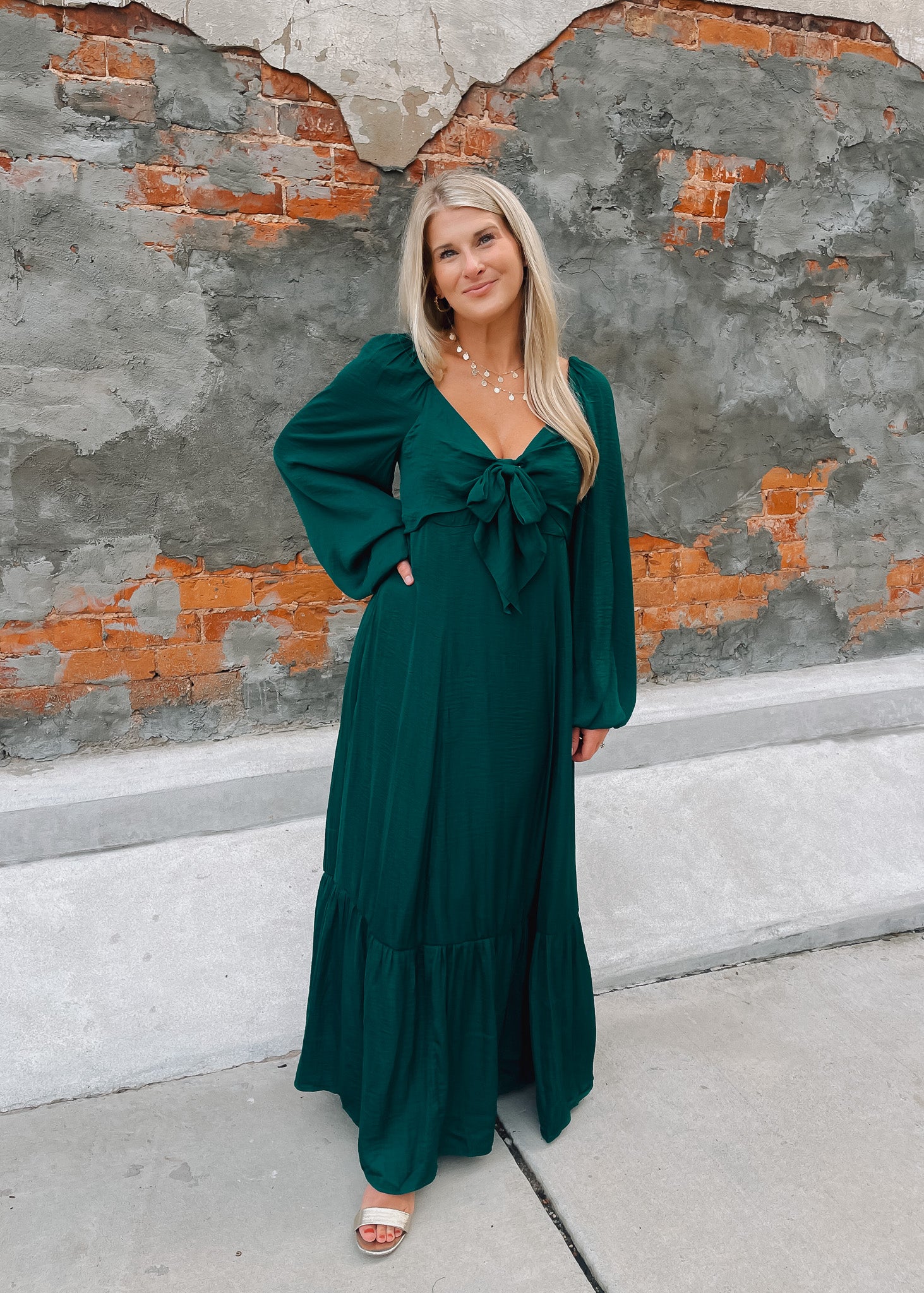 Elevate your style with the Lovely Little Thing Maxi Dress in a stunning emerald green satin. This long-sleeve dress features a graceful bow detail and a flowing maxi silhouette that moves beautifully. Fully lined for comfort and coverage, it offers a luxurious feel while ensuring you look effortlessly elegant for any occasion.