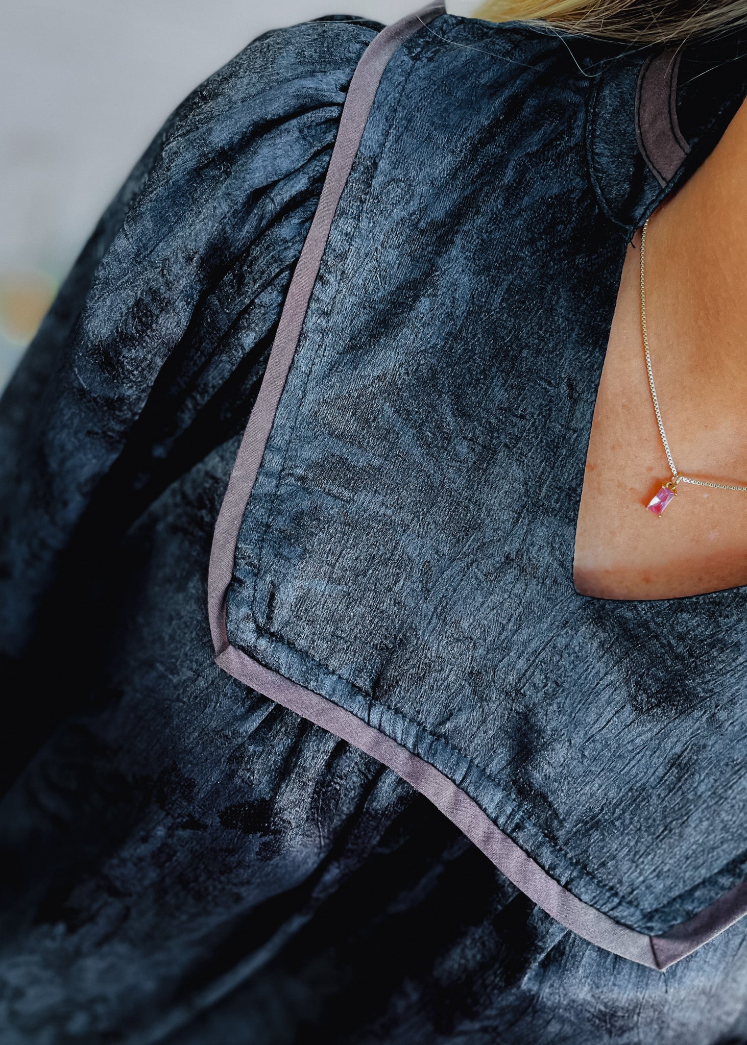 Elevate your wardrobe with the Not Holding Back Top, a striking black crinkle brocade blouse that commands attention. This sophisticated piece features a flattering V-neck accented with structured contrast trim, while voluminous puff sleeves add contemporary flair. The smoked yoke and lined construction provide refined structure and comfort, while delicate piping details complete the polished look. Perfect for making a bold statement at work or weekend gatherings, this blouse transforms any outfit into something unforgettable.
