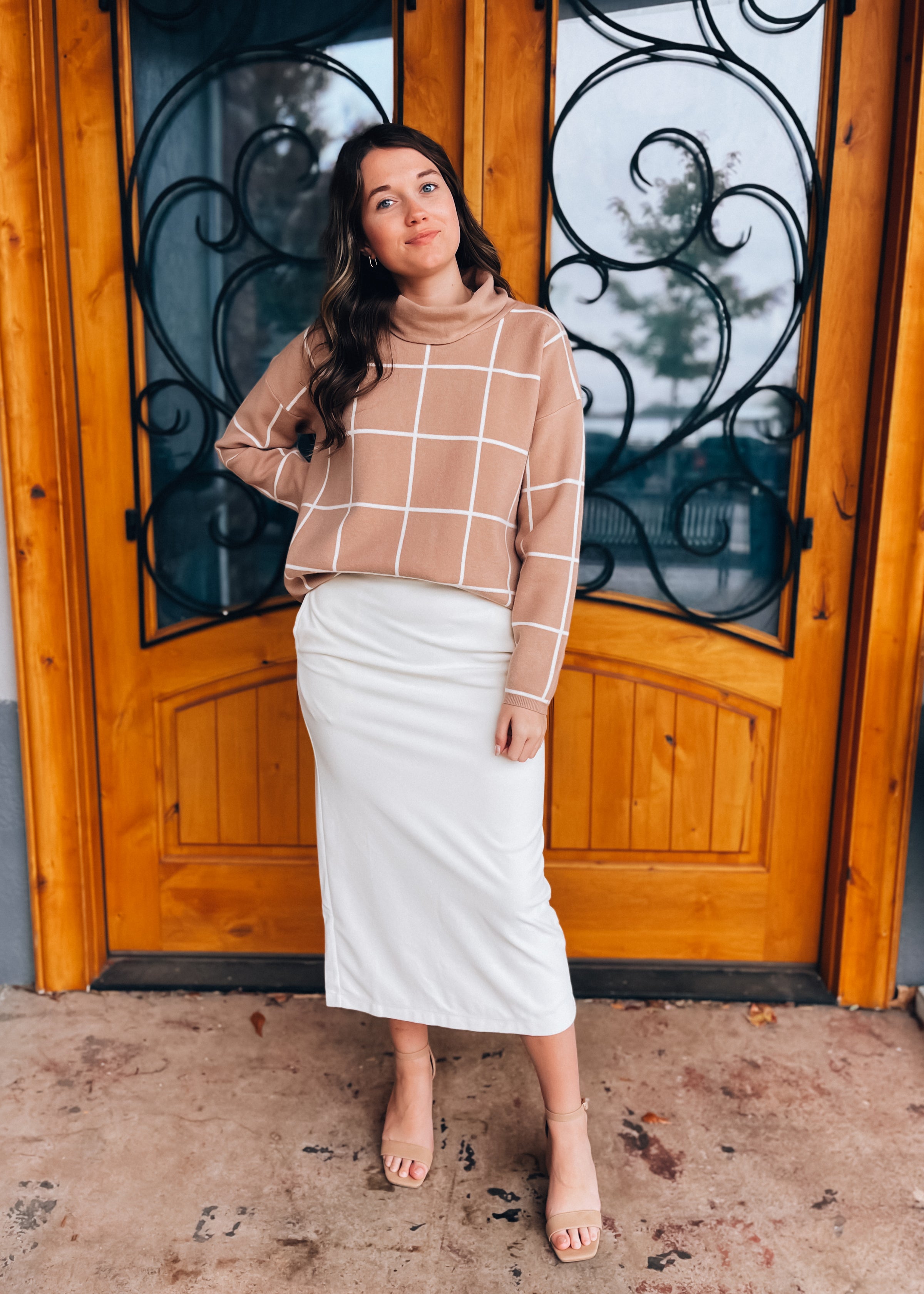 The On The Books Brush Textured Midi Skirt in ivory offers a sleek, suede-like finish that enhances its sophisticated appeal. Designed to be form-fitting, this skirt flatters your silhouette while the subtle back slit adds a stylish touch and ease of movement. Perfect for dressing up or down, it brings a chic, polished look to any wardrobe.