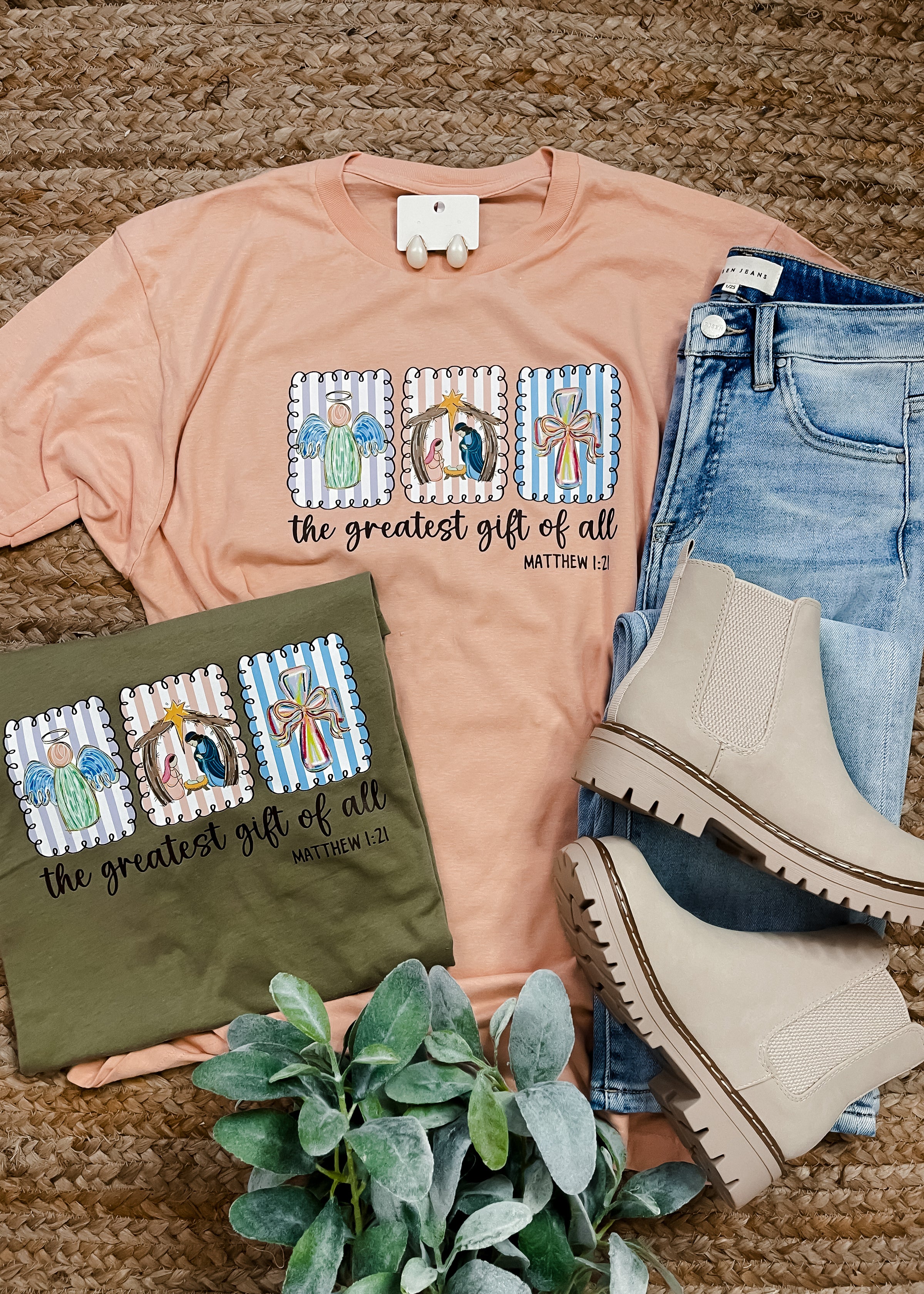 Celebrate the true meaning of the season with The Greatest Gift Of All Graphic Tee, available in peach and olive. Featuring three vibrant, hand-drawn designs—an angel, the nativity scene, and a cross—set against a stylish striped background, this tee beautifully illustrates faith and festivity. Emblazoned with "The Greatest Gift of All" Matthew 1:21, it’s a meaningful way to share your belief while staying comfortable and stylish. Perfect for spreading joy and inspiration wherever you go.