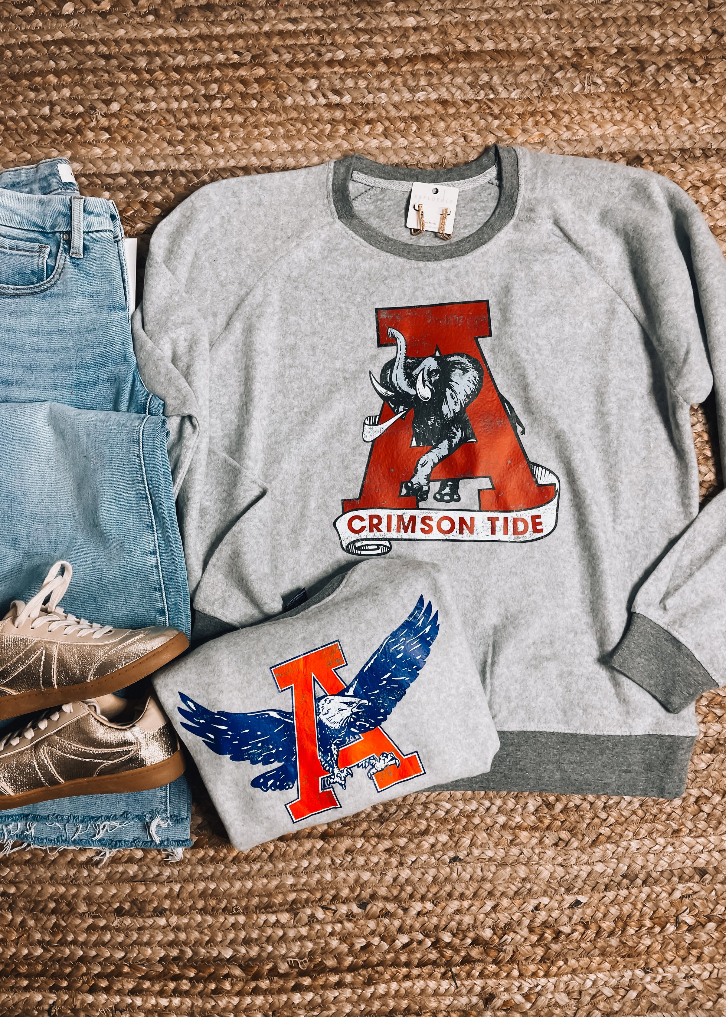 Celebrate your team spirit with this inside-out fleece sweatshirt, designed for true fans who want comfort and style game day after game day. The heather grey Auburn Tigers version features a vintage-inspired "A" logo in bold orange with a soaring blue eagle—a nod to the iconic "War Eagle" battle cry. Prefer crimson? The Alabama Crimson Tide edition showcases a striking red vintage "A" with an elephant charging through the design and "Crimson Tide" emblazoned at the bottom. Both versions deliver that cozy, lived-in aesthetic with premium fleece construction. Available in sizes S-3XL, this sweatshirt is the perfect way to show your loyalty while staying warm and looking effortlessly cool.